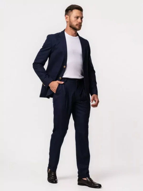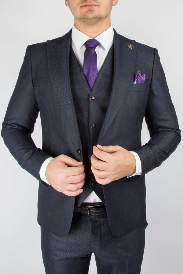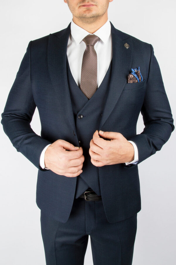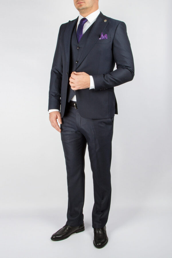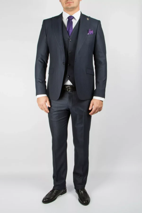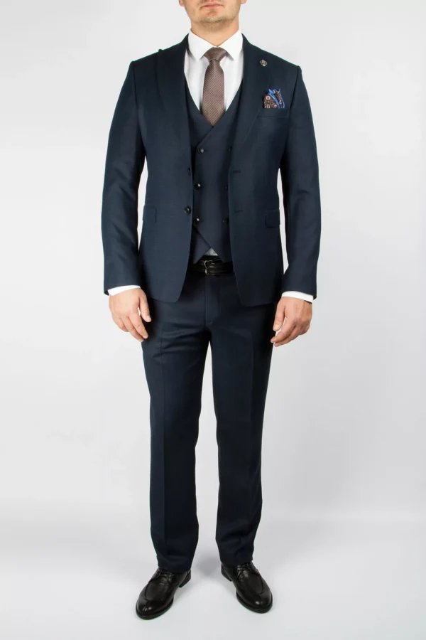 Приталенный костюм-тройка темно-синего цвета