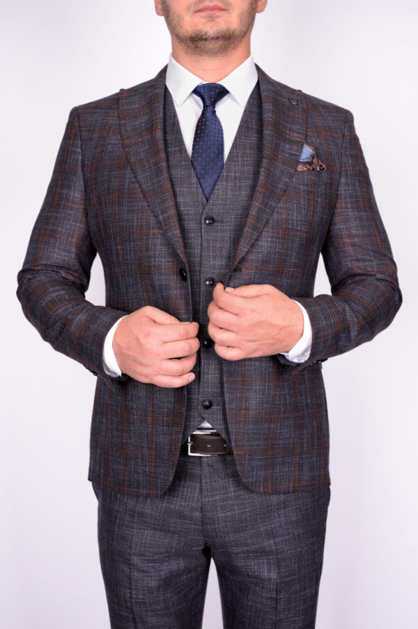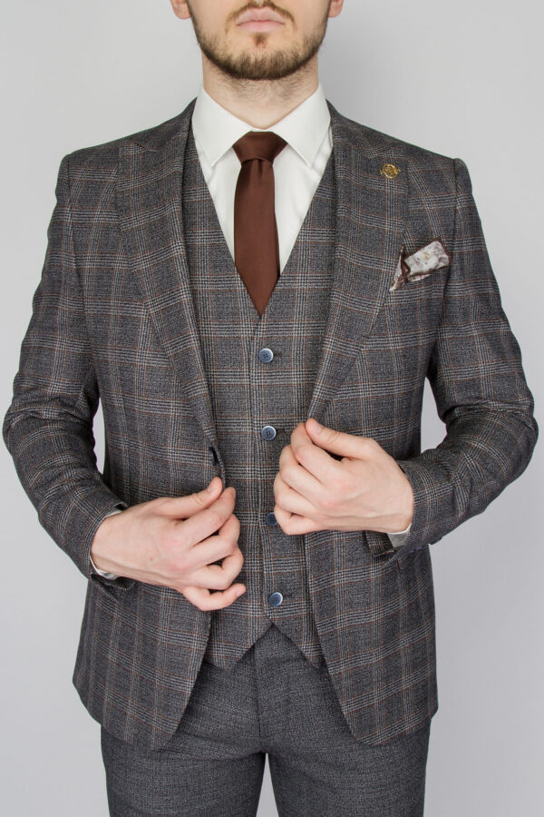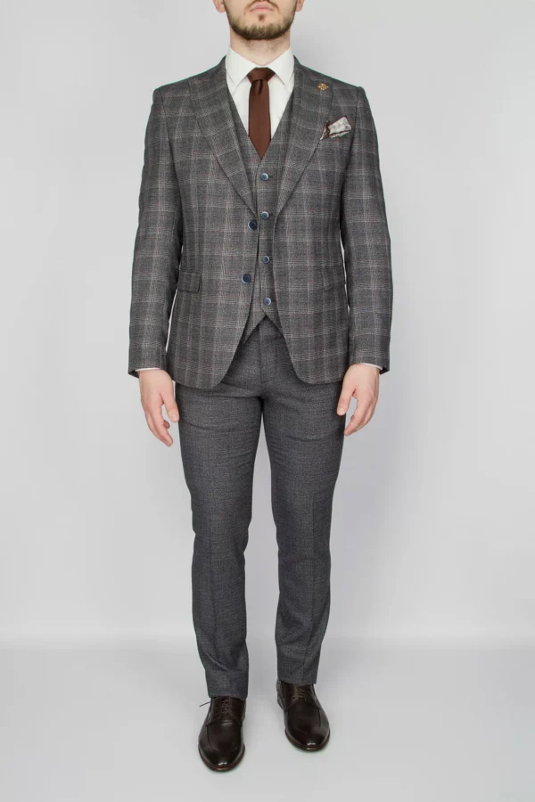 Перейти к товару Костюм-тройка серого цвета с клеточным пиджаком