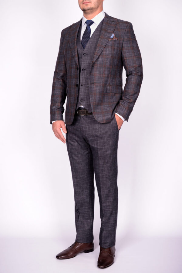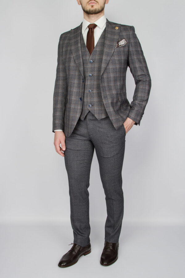 Костюм-тройка серого цвета с клеточным пиджаком