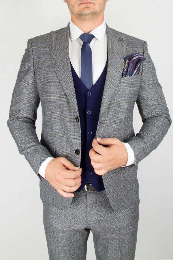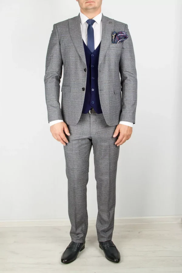 Перейти к товару Костюм-тройка серого цвета с трикотажным синим жилетом