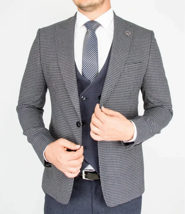 Перейти к товару Костюм-тройка синего цвета в невыраженную серую клетку