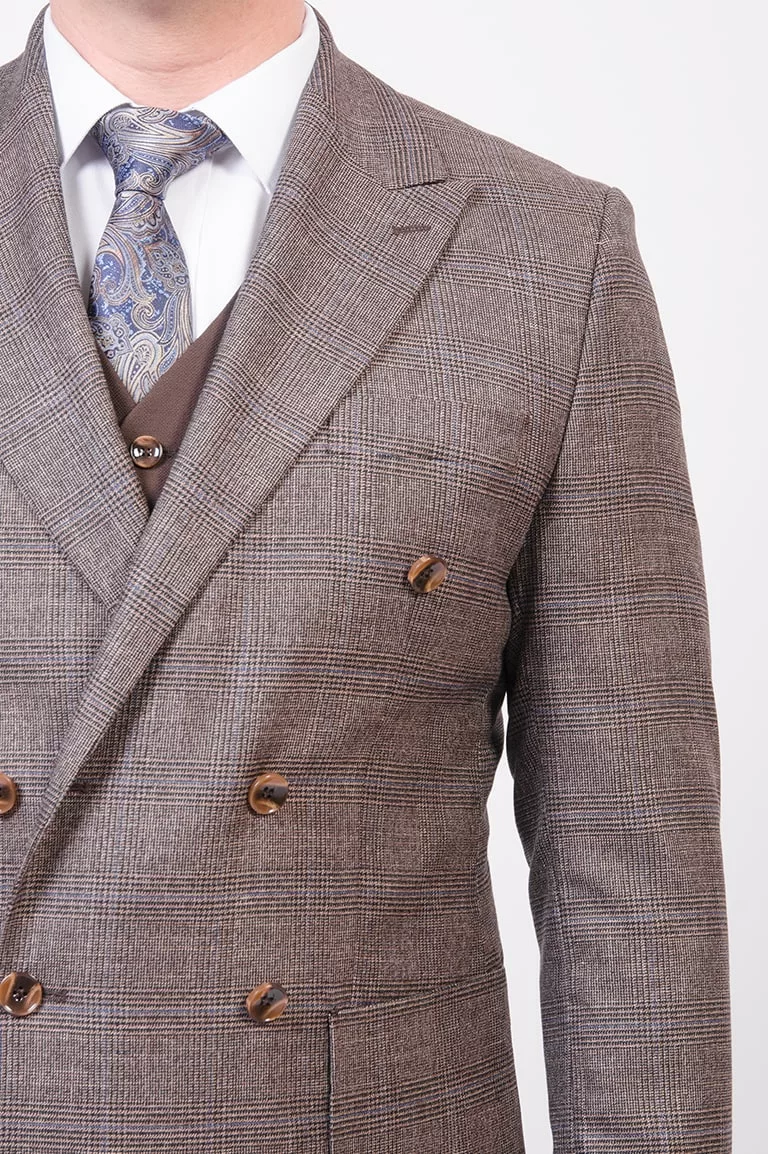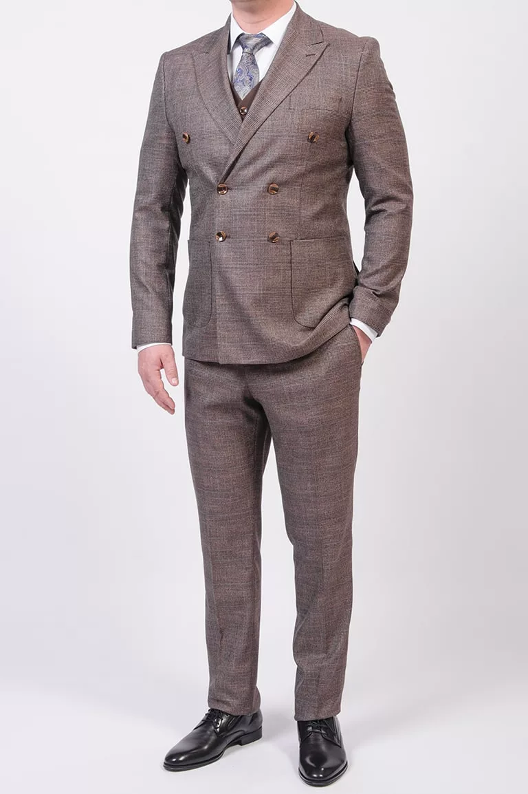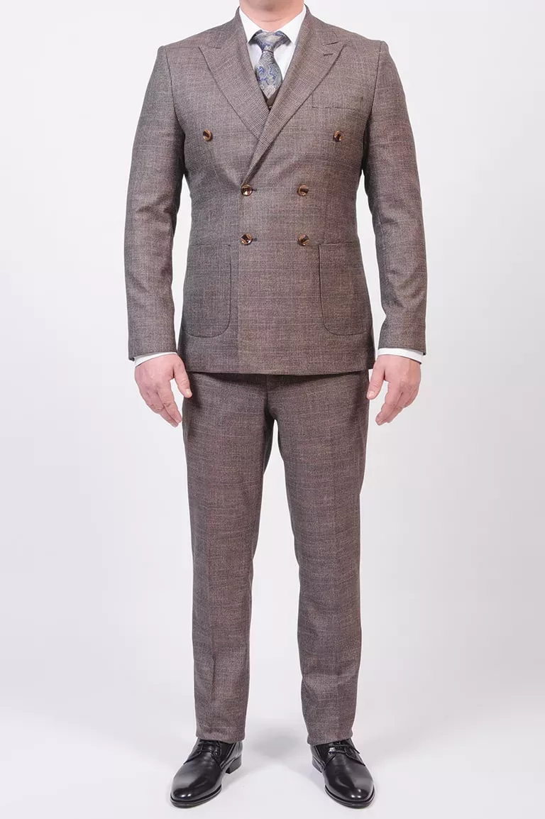 Костюм-тройка отшит в полуприталенном фасоне. Двубортная модель пиджака, заостренный лацкан воротника (ласточка), значок в петлице. Жилет однобортный с регулятором обьема, задняя часть из основной ткани верха (не подкладочная). Брюки современного, прямого кроя, имеют свободную длину. По вашей просьбе мы бесплатно подгоним длину брюк под вашу ростовку. Костюм отшит из смесовой ткани высокого качества в составе 80% шерсти и 20% вискозы, что позволяет максимально долго сохранять презентабельный внешний вид и форму, ткань устойчива к заминанию. Костюм яркий, запоминающийся, второго такого не существует…новый тренд -двубортная тройка !!!