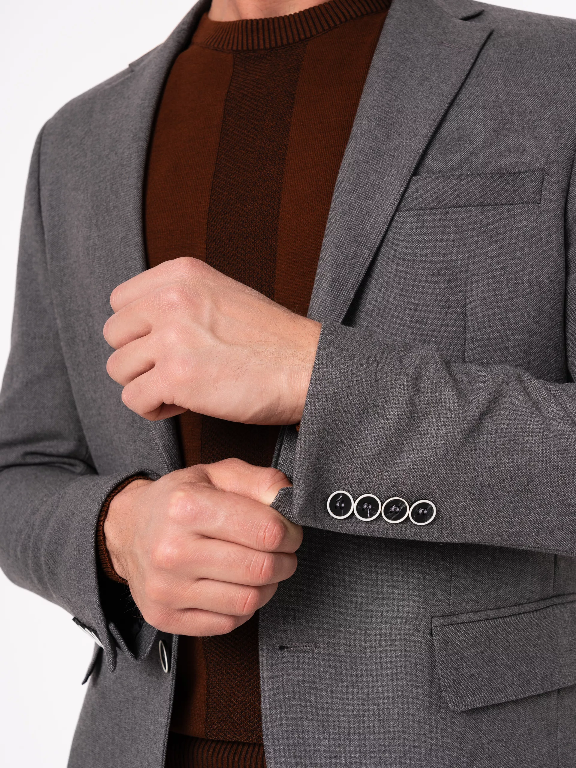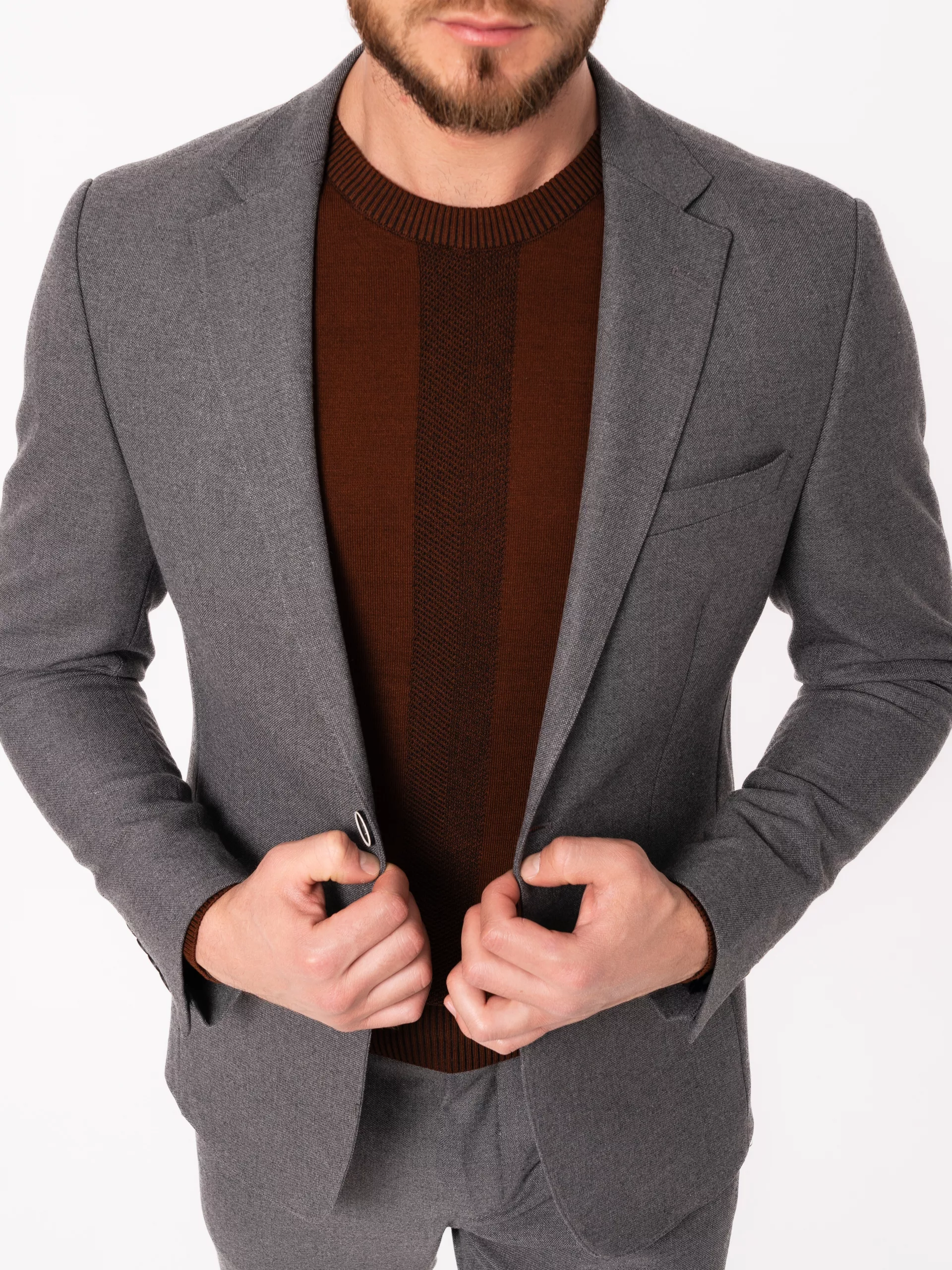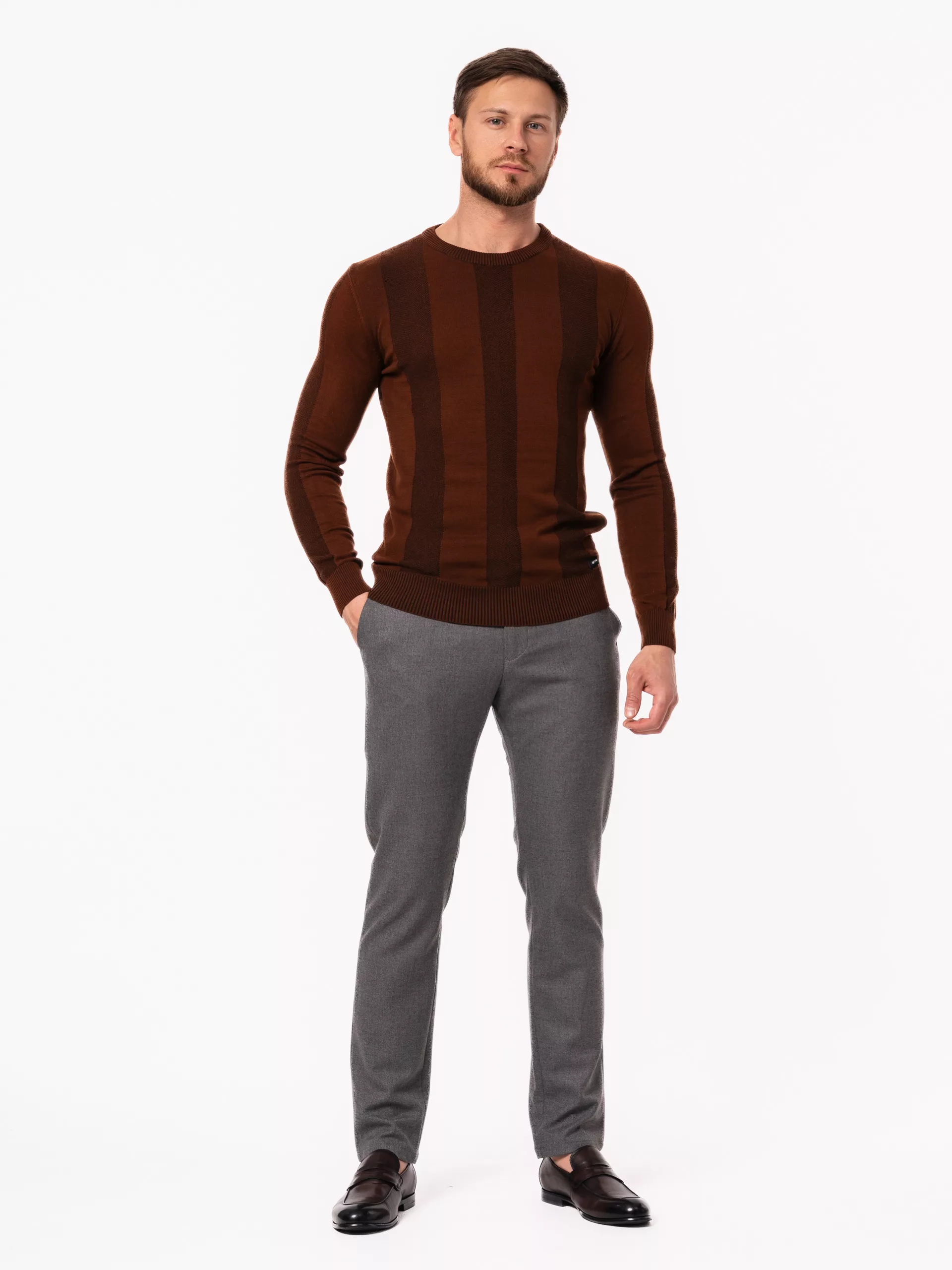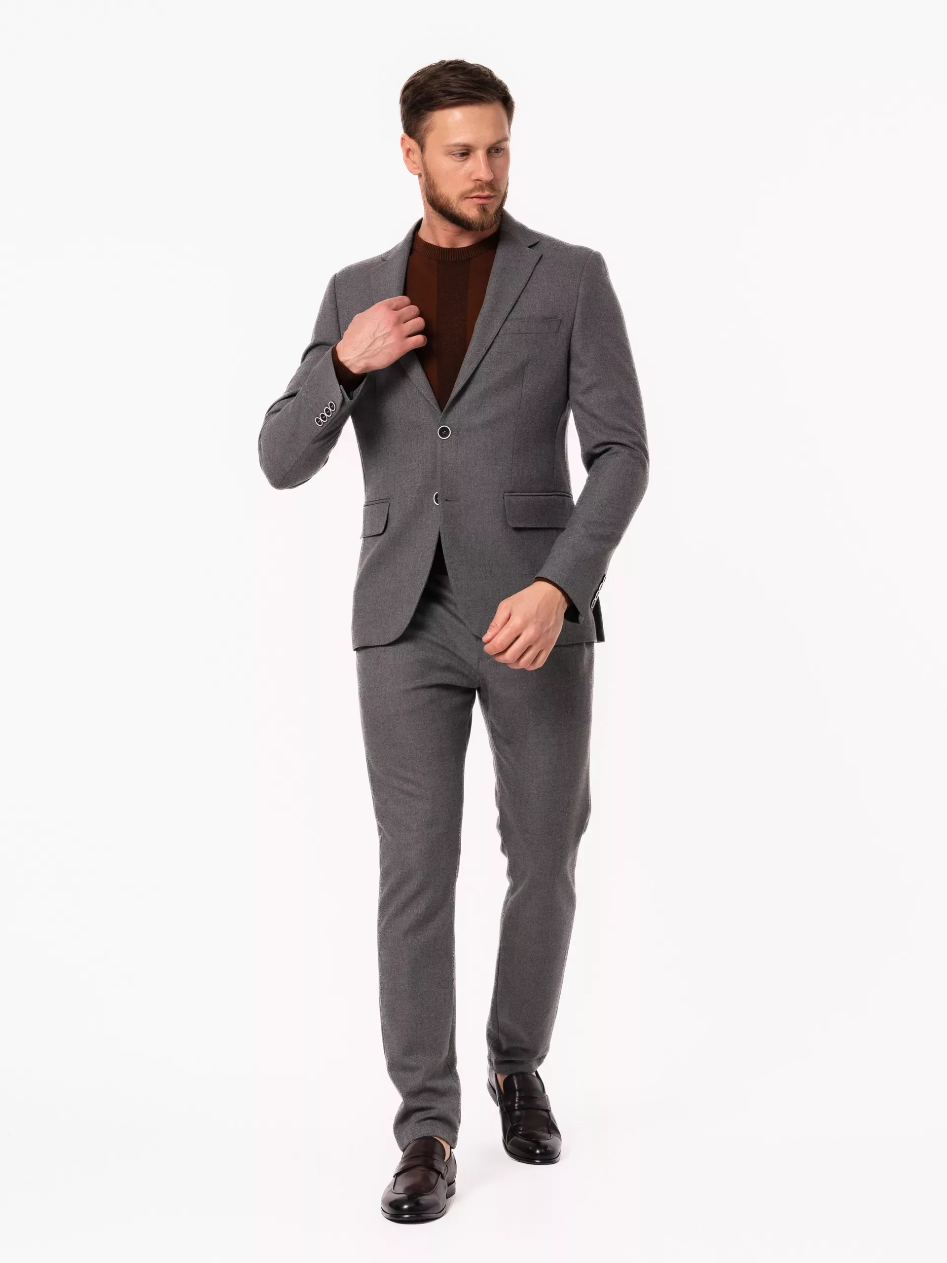 Костюм отшит в современной полуприталенной модели . Пиджак имеет застежку на две пуговицы, английский воротник, значок в петлице. Брюки прямого кроя,без стрелок, имеют свободную длину. По вашей просьбе мы бесплатно подгоним длину брюк под вашу ростовку. Костюм отшит из смесовой ткани высокого качества в составе 70% шерсти и 20% вискозы и 10% полиэфира, что позволяет долго сохранять презентабельный внешний вид и форму, ткань устойчива к заминанию. Коричневый джемпер на модели из высококачественной шерсти, вы также можете приобрести в нашем магазине.