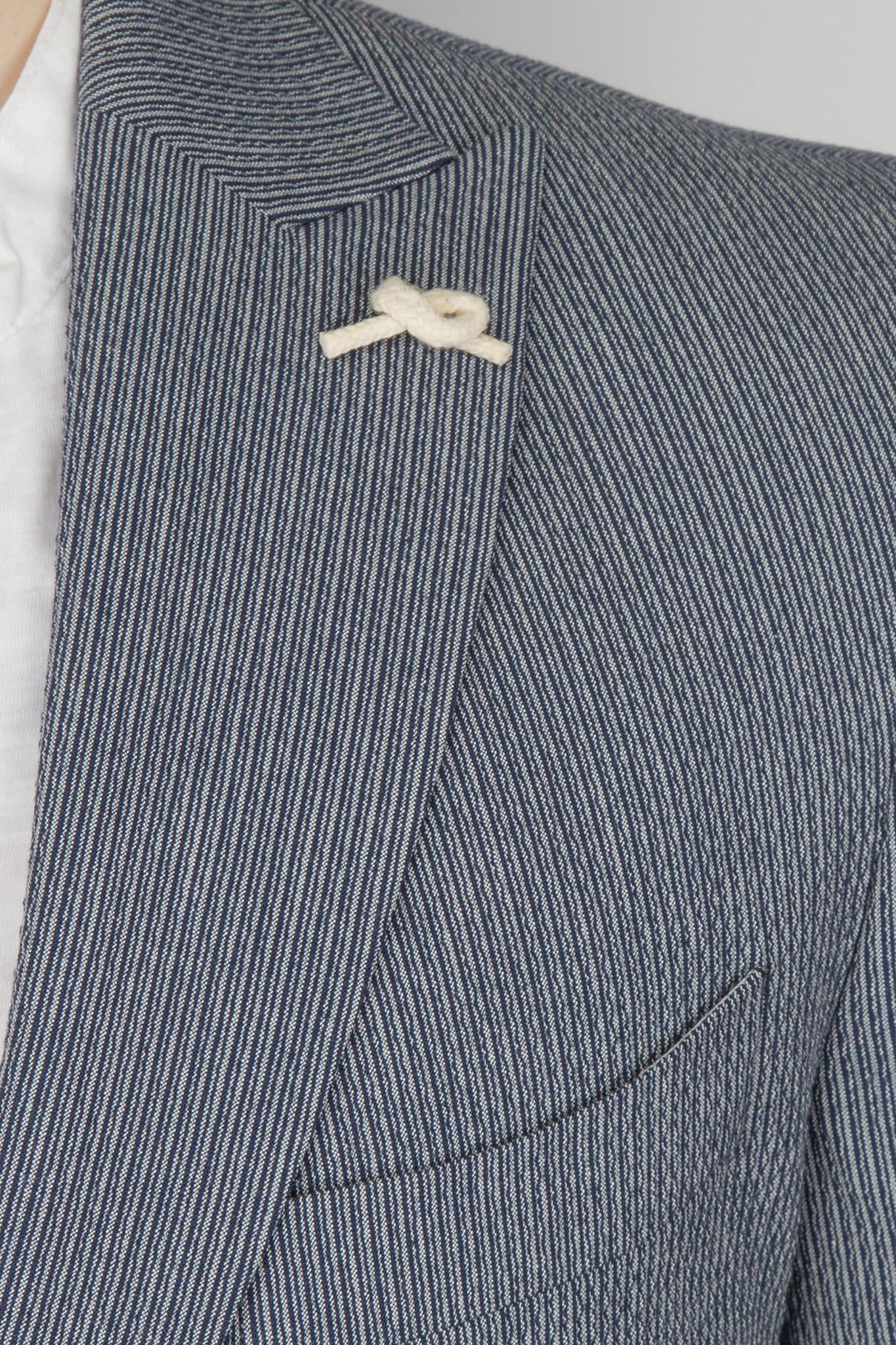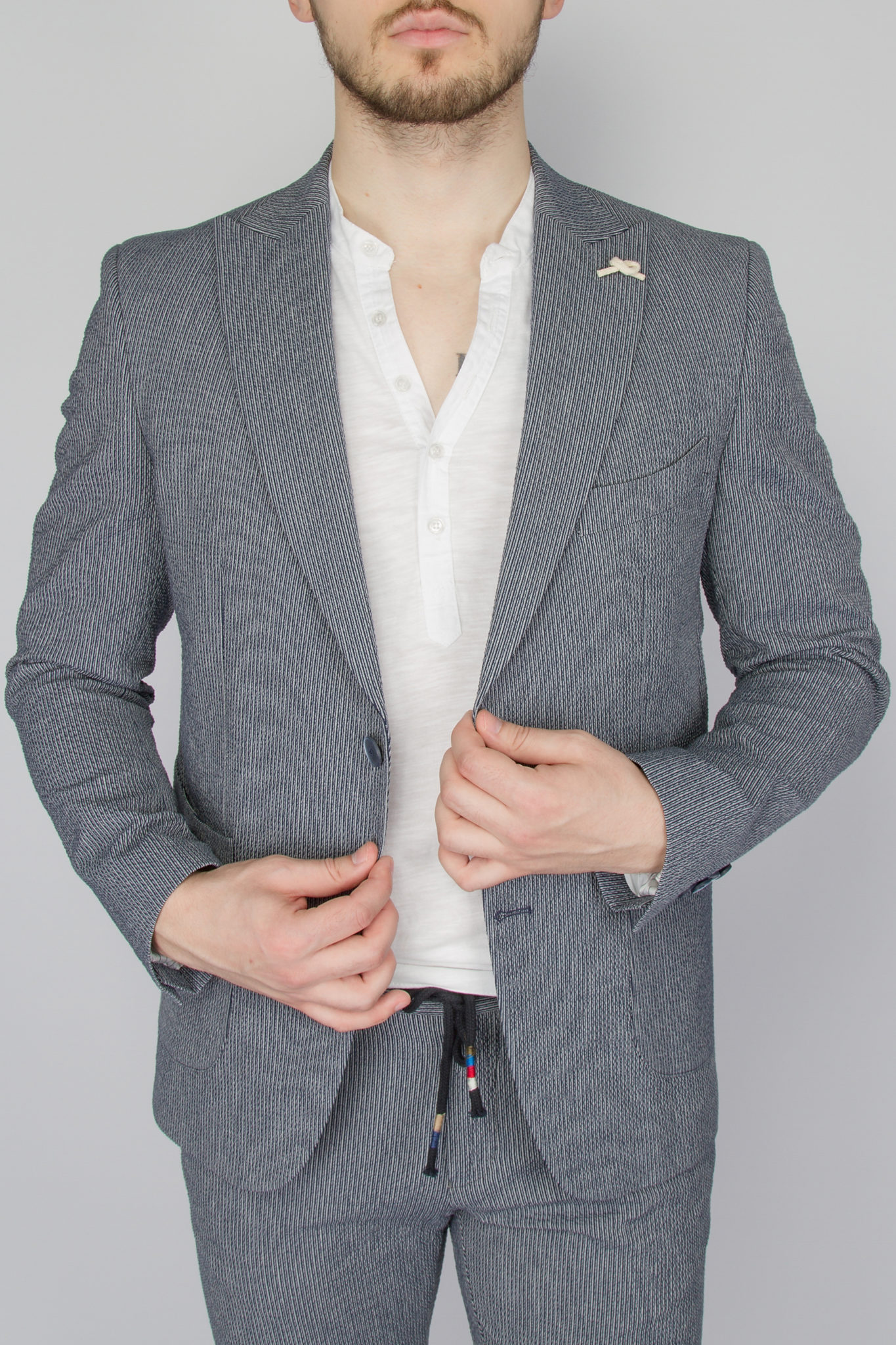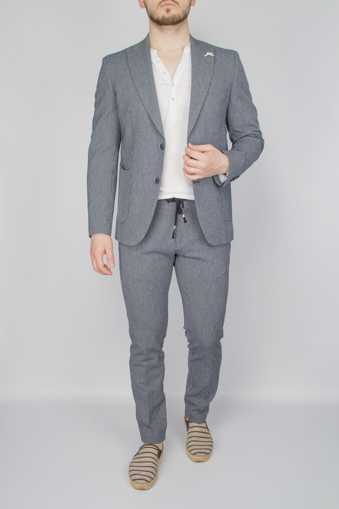 Предлагаем рассмотреть летний вариант костюма, отшит в приталенной модели slim-fit. Пиджак имеет застежку на две пуговицы, лацкан воротника «заостренной» формы, нагрудный карман с листочкой, комплектуется платком, накладные боковые карманы. Пиджак облегченный, спина без подкладочной ткани. Брюки слегка приужены, пояс на шнурке. По вашей просьбе мы бесплатно подгоним длину брюк под вашу ростовку. Костюм отшит из легкой летней ткани высокого качества-«гофре» в составе  хлопок 70%, лен 30%.