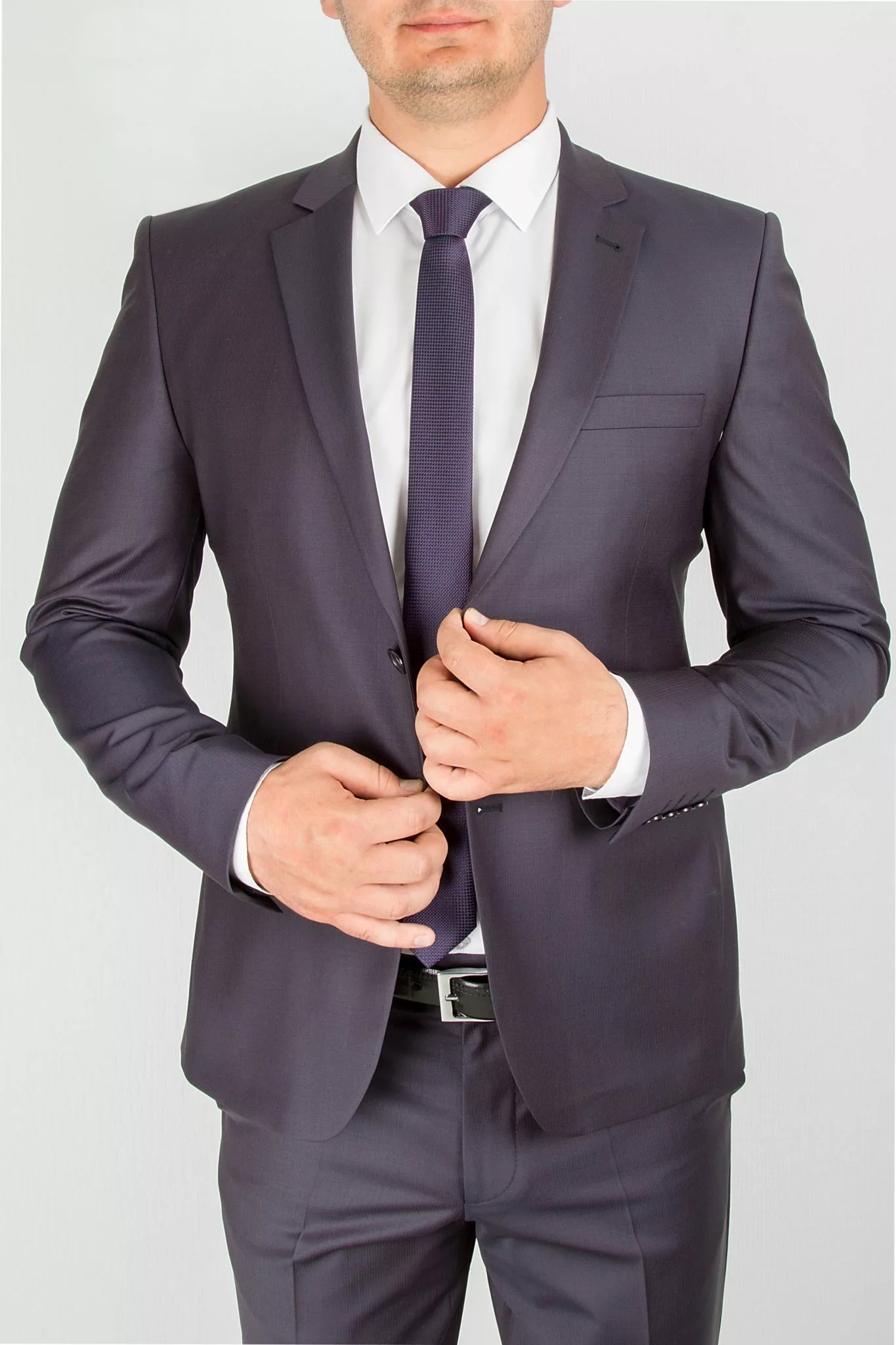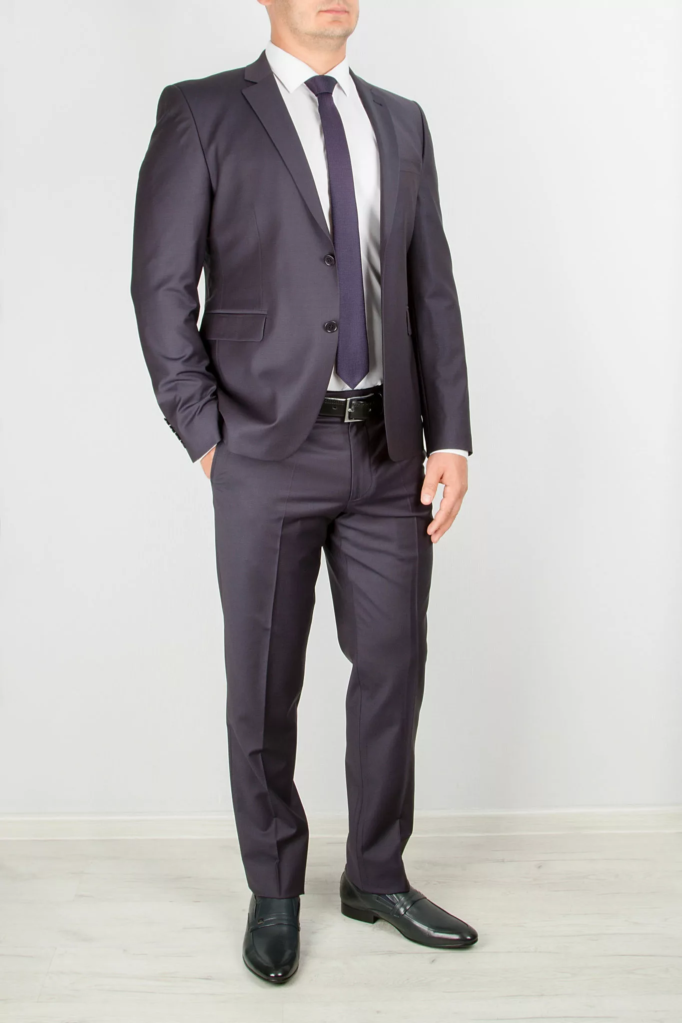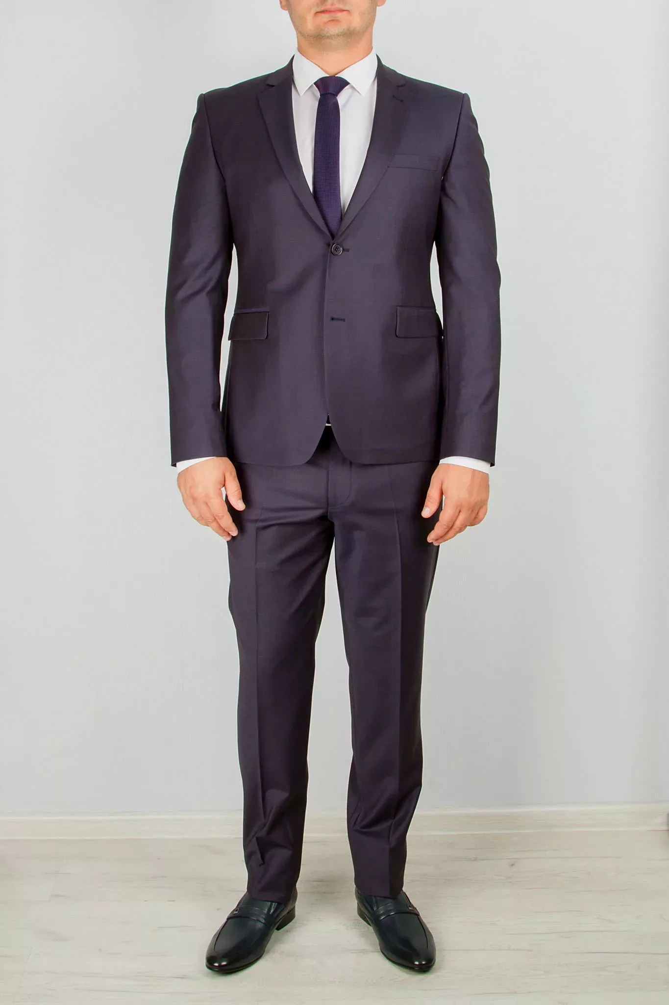 Костюм-двойка темно-фиолетового цвета в неброскую полосу. Костюм отшит в полуприталенной модели regular fit. Пиджак имеет «плотную посадку» по фигуре, застежку на две пуговицы, два разреза сзади. Лацкан пиджака приужен, сзади два разреза. Брюки прямые, имеют свободную длинну. По вашей просьбе мы подгоним длину брюк под ваш рост.