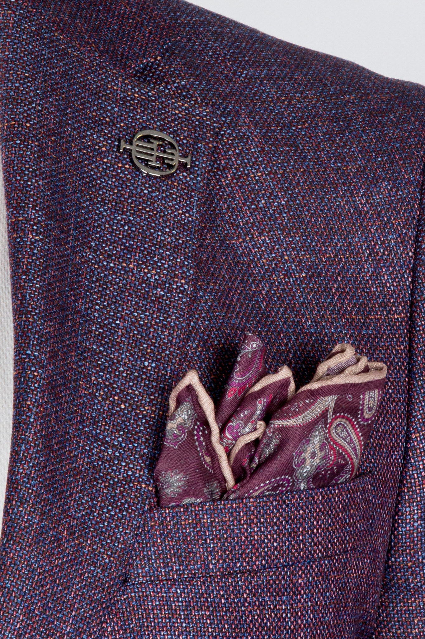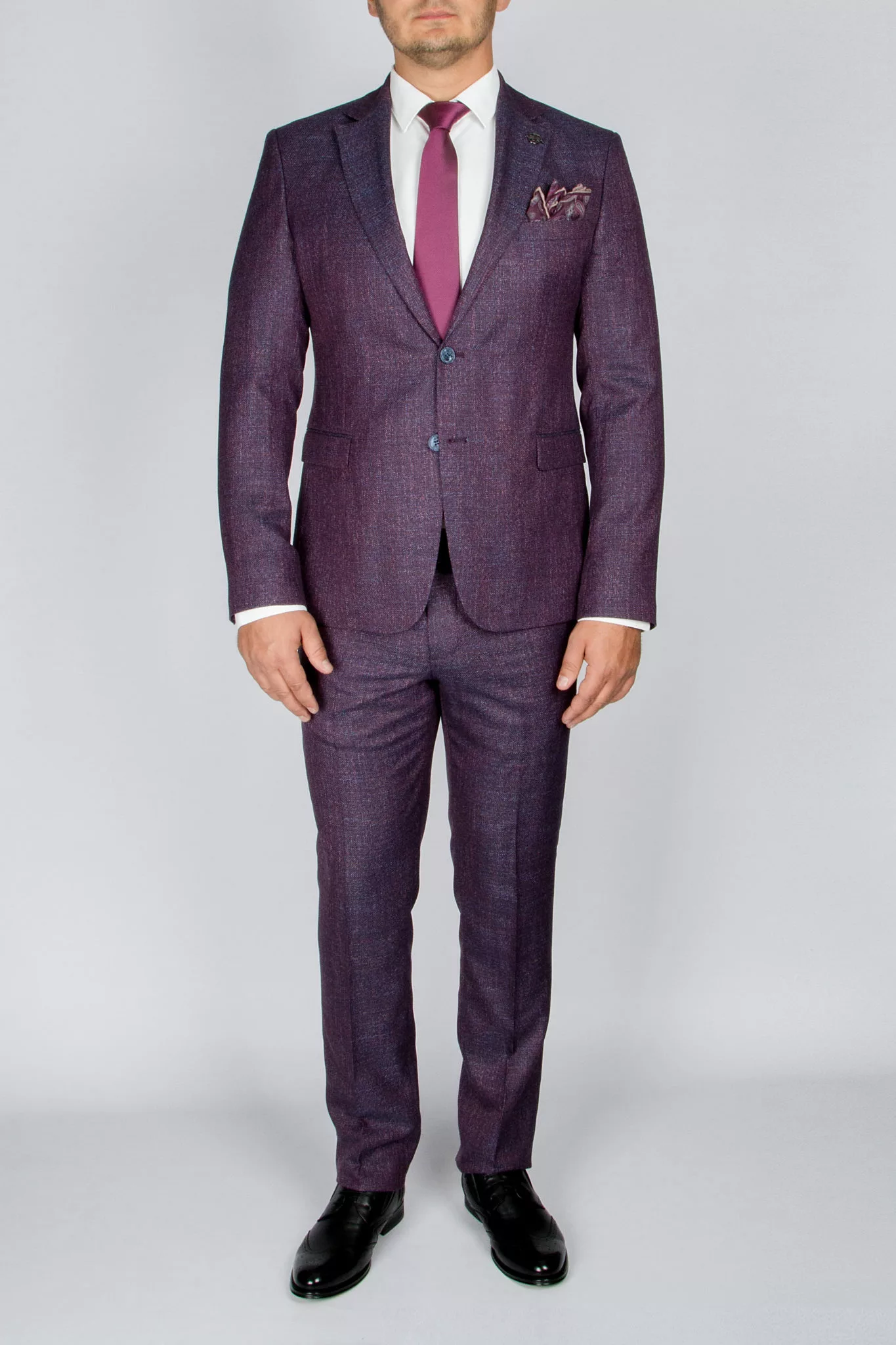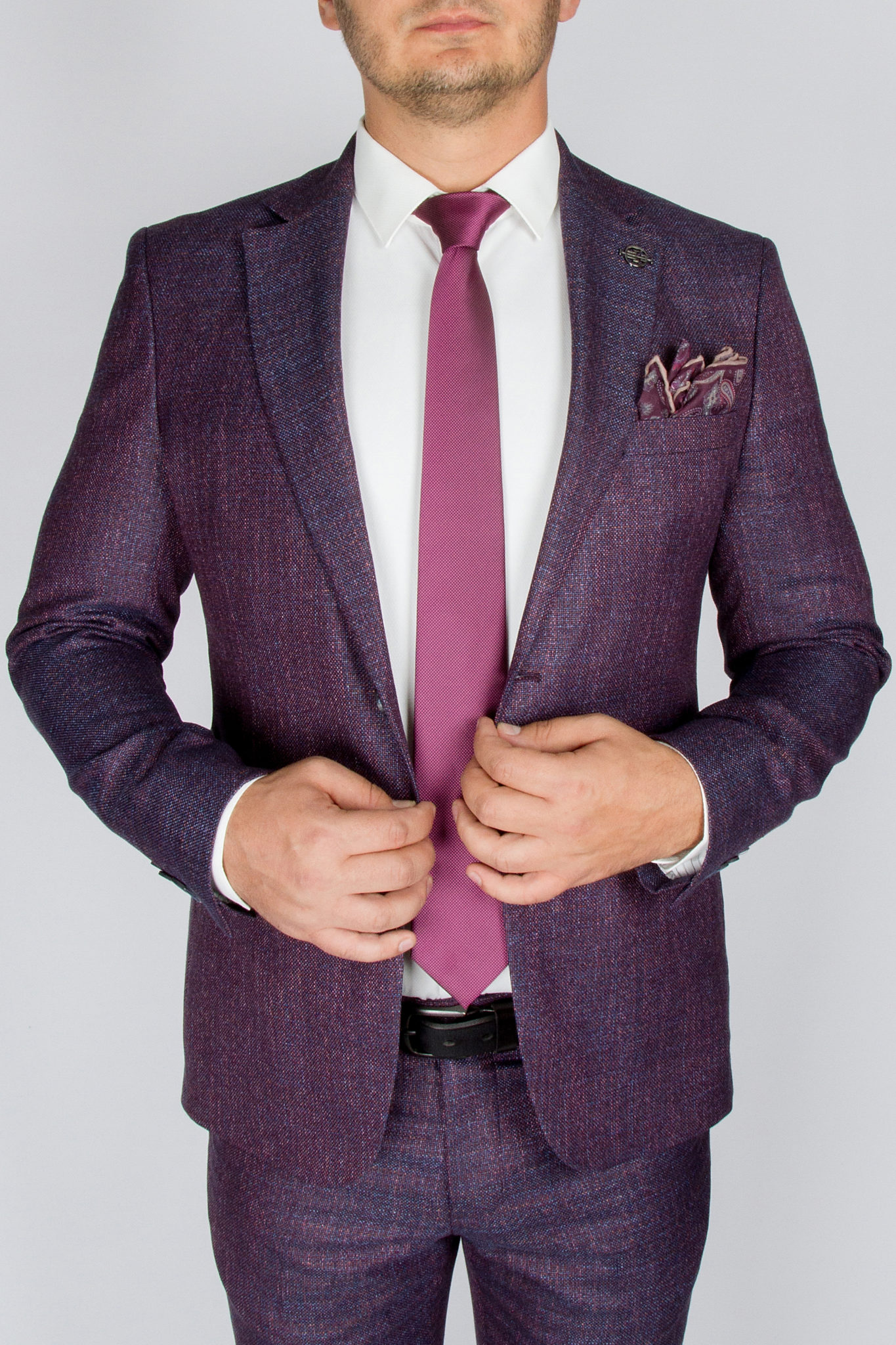Костюм-двойка, отшит в приталенной модели slim-fit. Пиджак имеет застежку на две пуговицы, лацкан воротника «заостренной» формы, нагрудный карман с листочкой, комплектуется платком, накладные боковые карманы. Пиджак облегченный, спина без подкладочной ткани. Брюки слегка приужены, прямого кроя. По вашей просьбе мы бесплатно подгоним длину брюк под вашу ростовку.