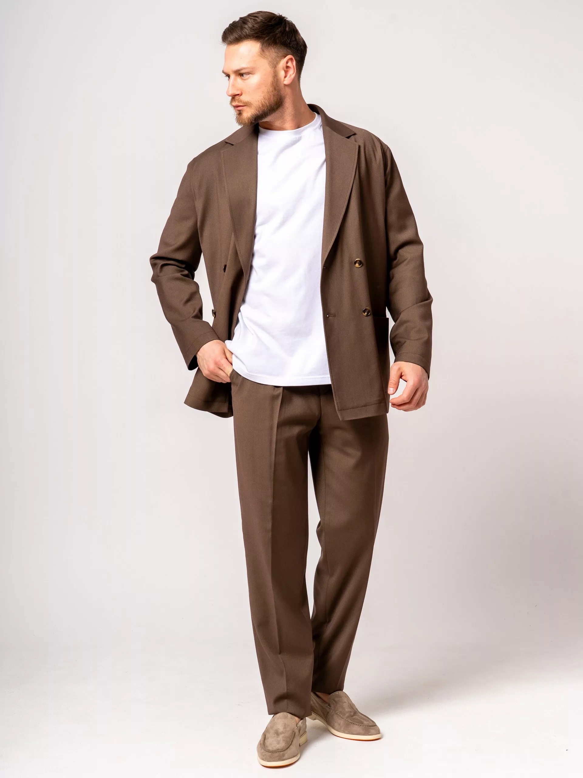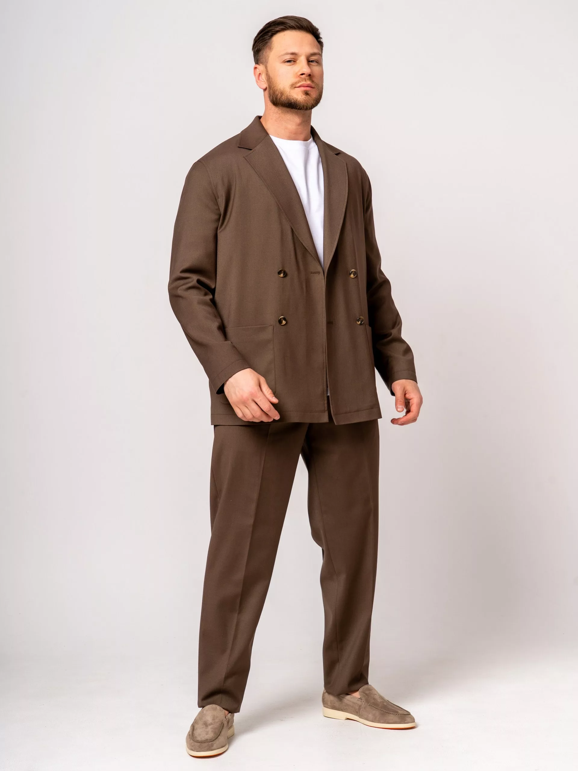 Костюм-двойка модель oversize. Пиджак двубортный, ворот-классический английский крой. Брюки свободного кроя, имеют свободную длину. По вашей просьбе мы бесплатно подгоним длину брюк под вашу ростовку. Костюм отшит из облегченной смесовой ткани высокого качества в составе 65% шерсти и 30% вискозы и 5% эластан, что позволяет долго сохранять презентабельный внешний вид и форму, ткань устойчива к заминанию. Костюм отшит из облегченной, летней ткани, спина без подкладки.