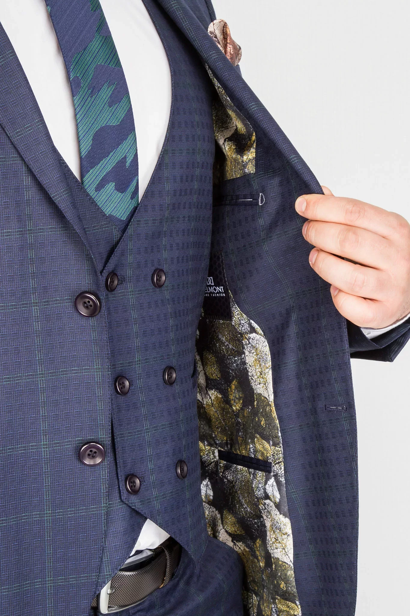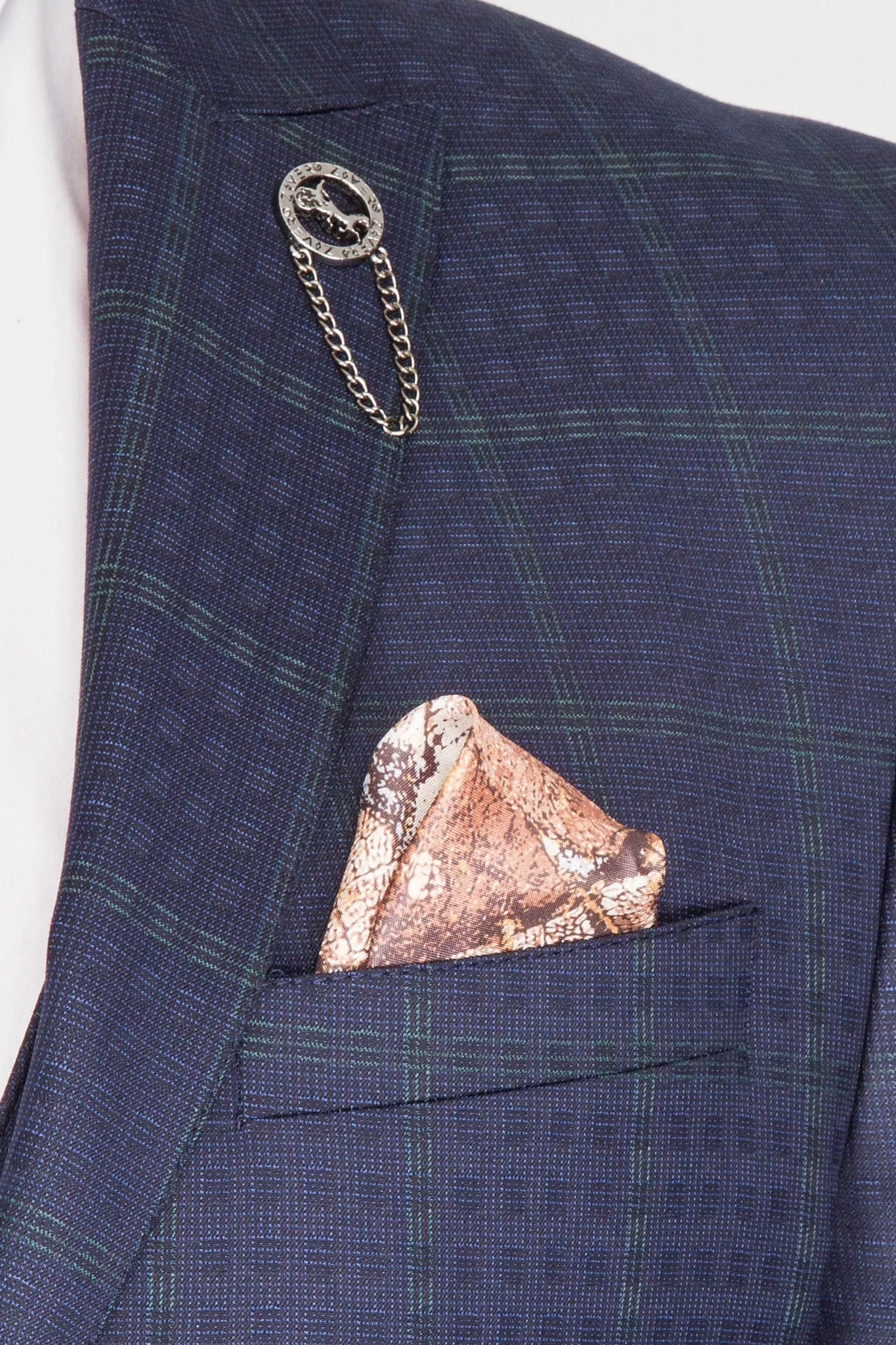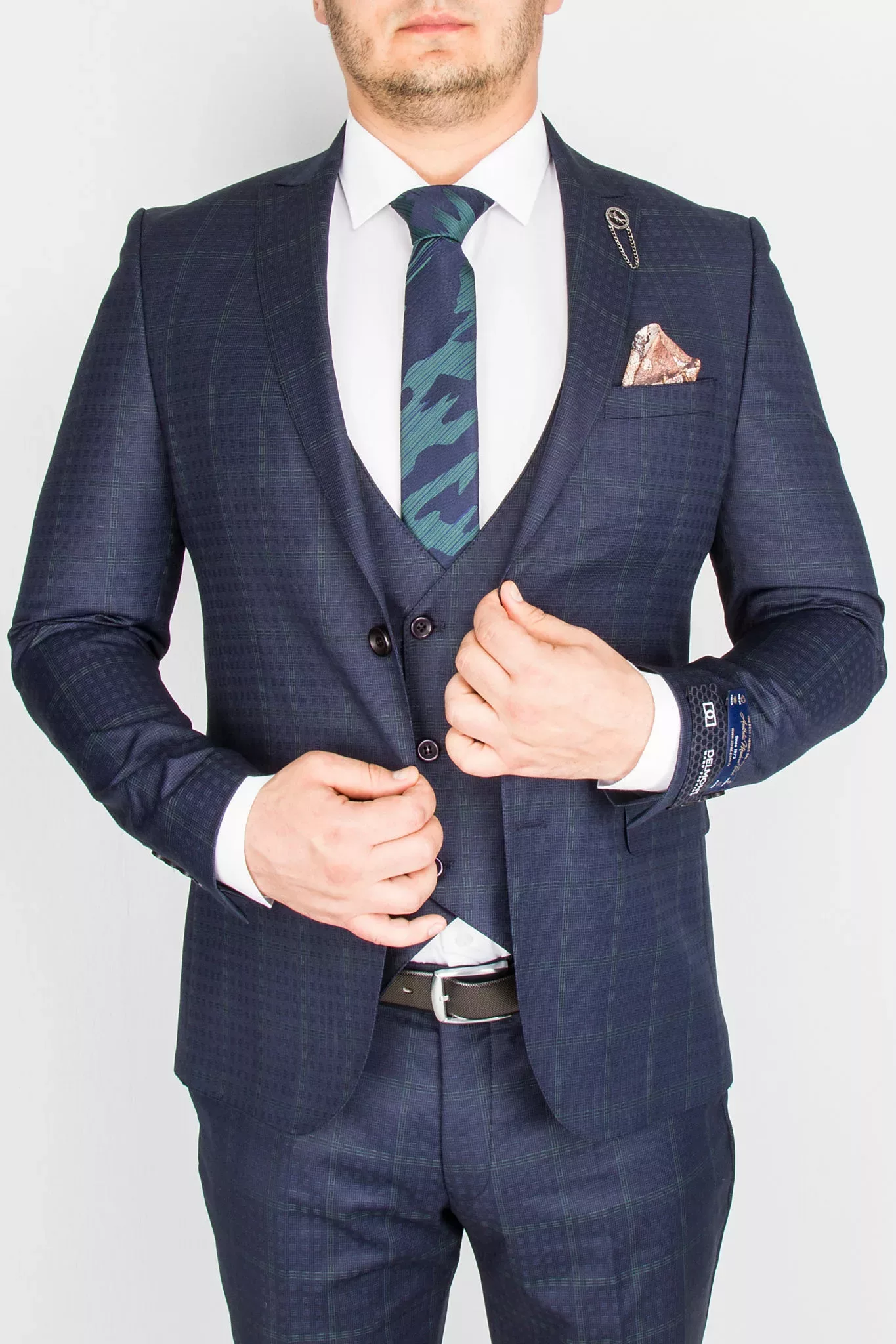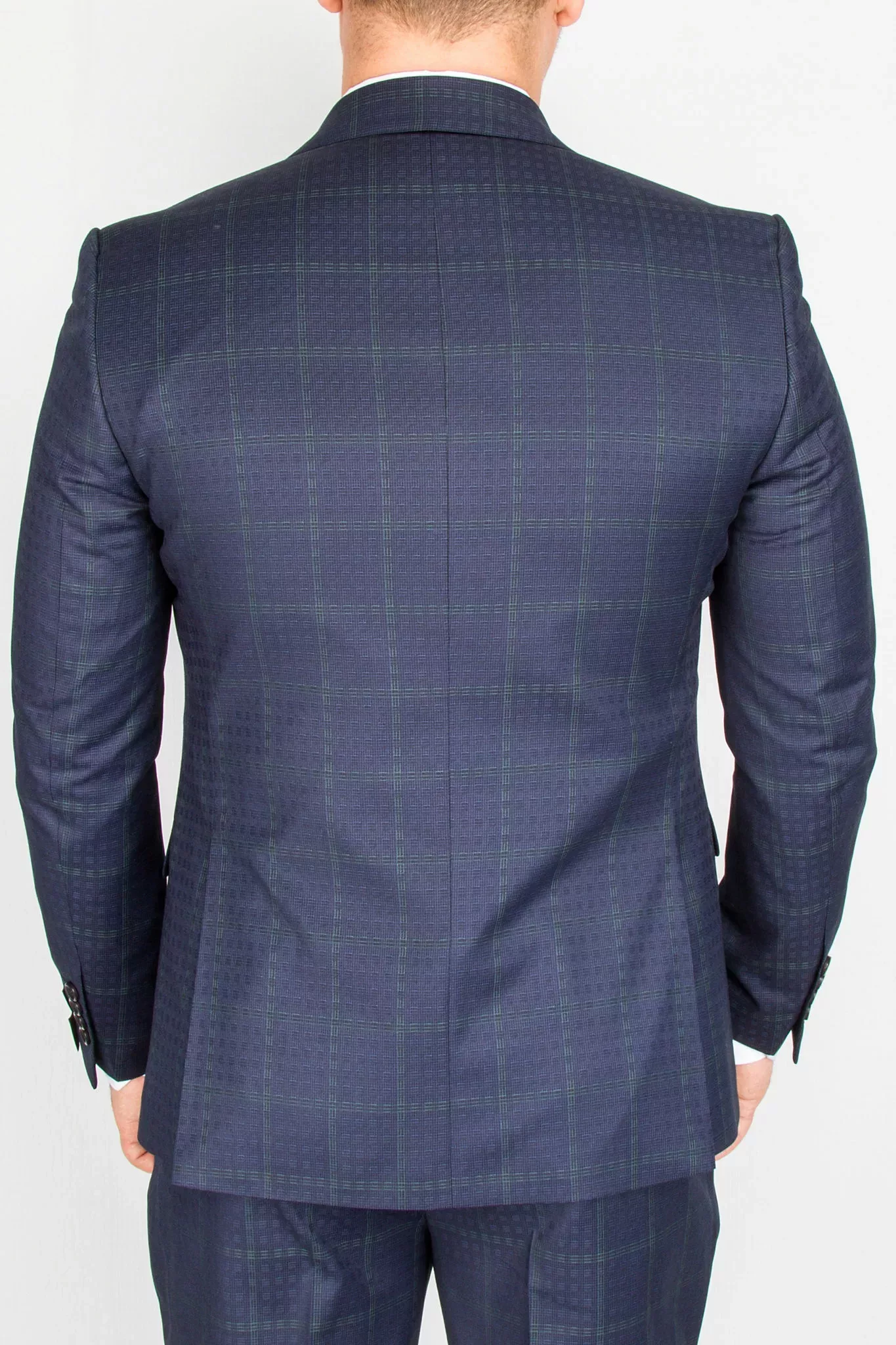 Костюм синего цвета в неяркую изумрудную клетку