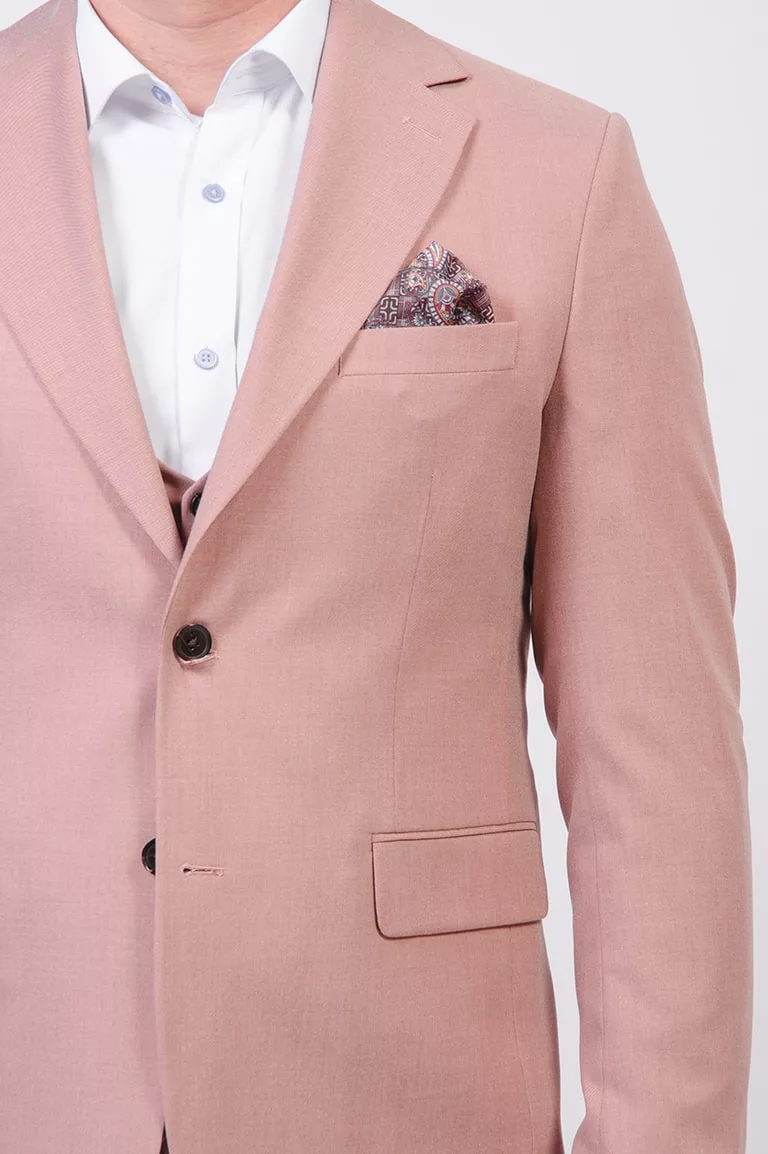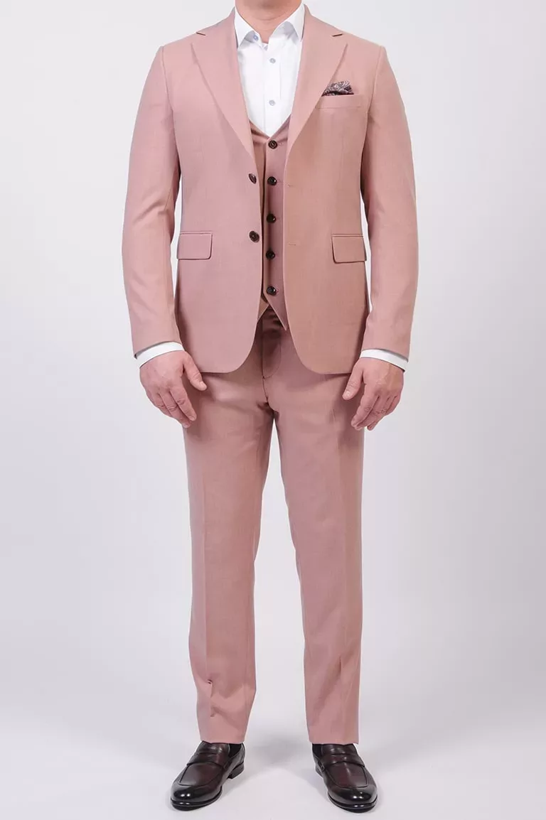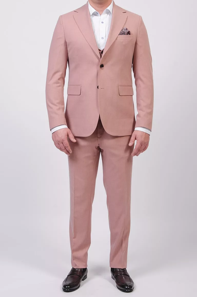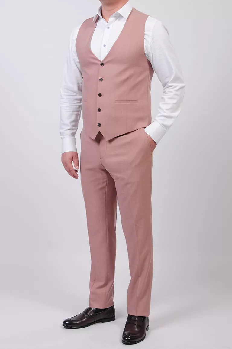 Костюм-тройка отшит в приталенной модели super-slim. Пиджак имеет застежку на две пуговицы, заостренный лацкан воротника (ласточка), значок в петлице. Жилет двубортный с отложным воротником, задняя часть из основной ткани верха (не вискоза).  Брюки современного, прямого кроя, имеют свободную длину. По вашей просьбе мы бесплатно подгоним длину брюк под вашу ростовку. Костюм отшит из смесовой ткани высокого качества в составе 80% шерсти и 20% вискозы, что позволяет долго сохранять презентабельный внешний вид и форму, ткань устойчива к заминанию. Костюм отшит из облегченной, летней ткани, в розовом цвете.