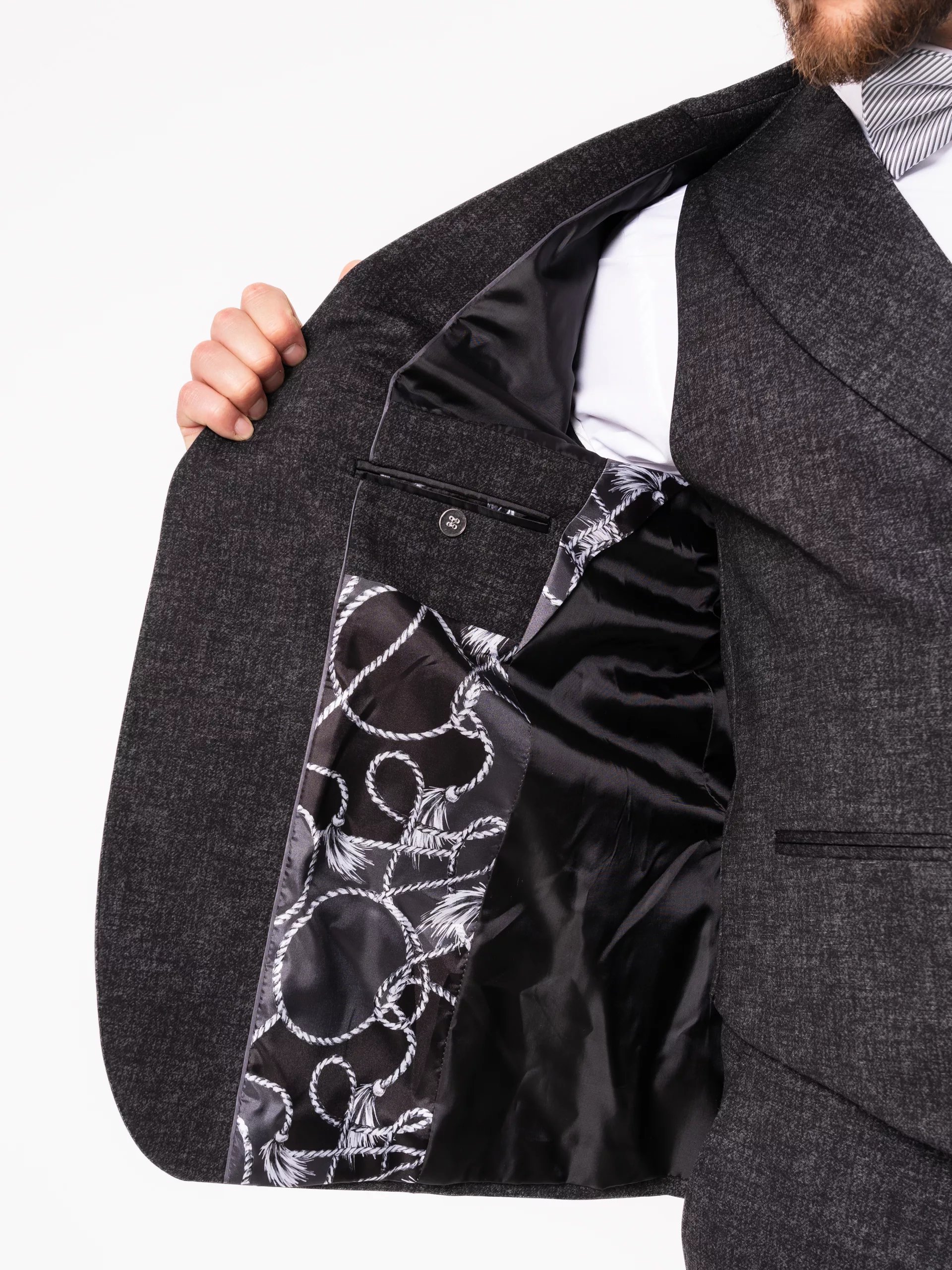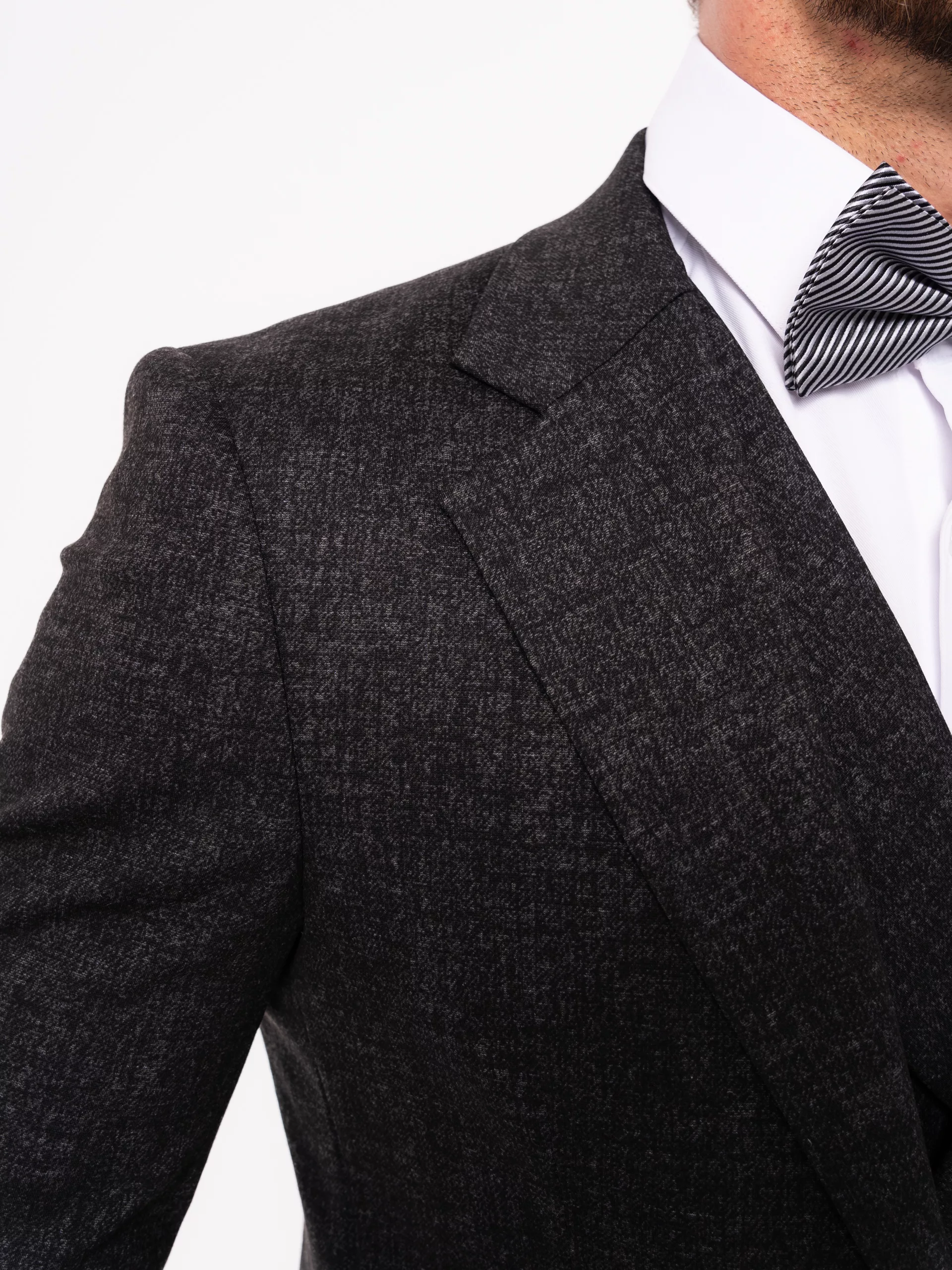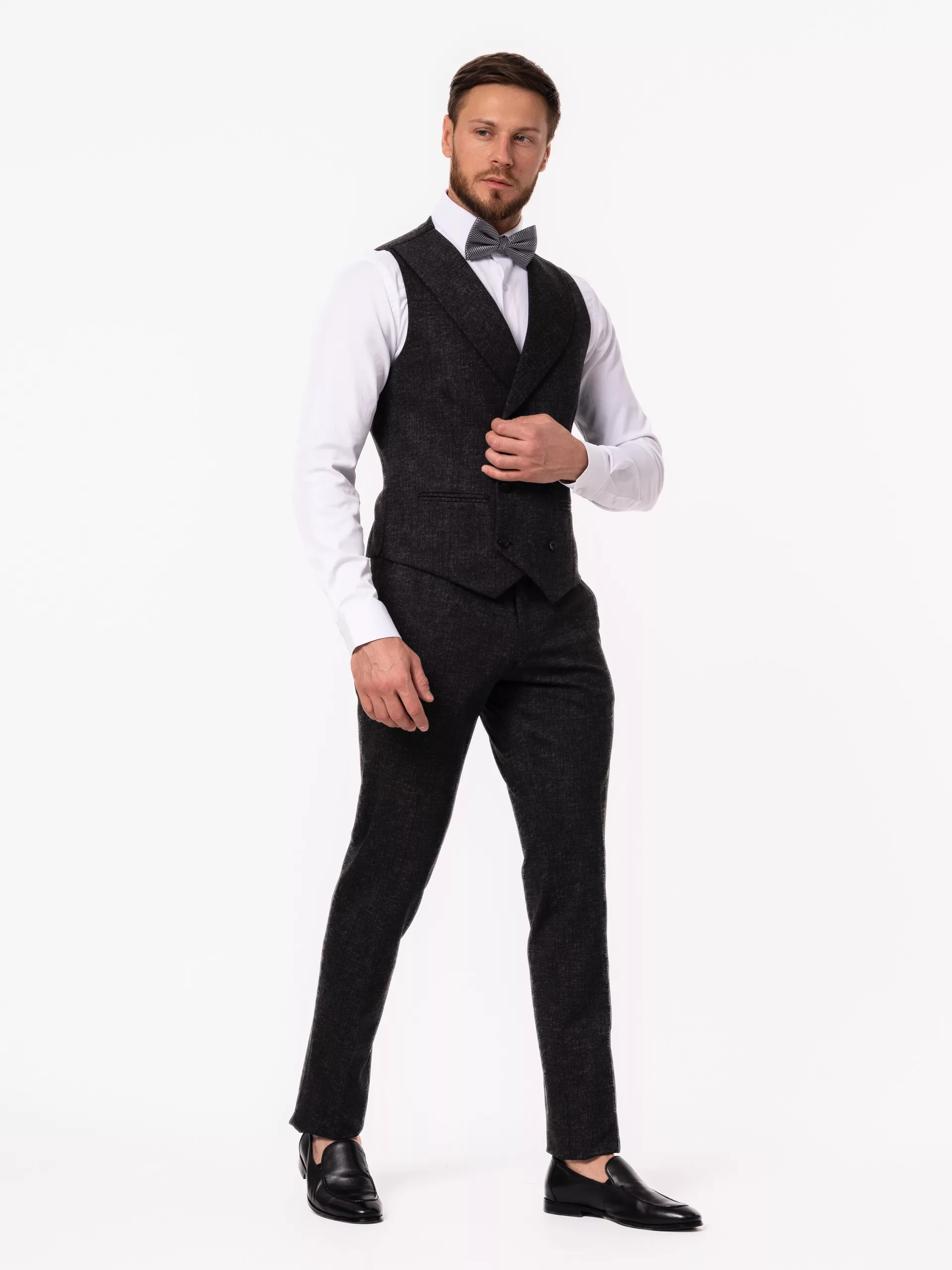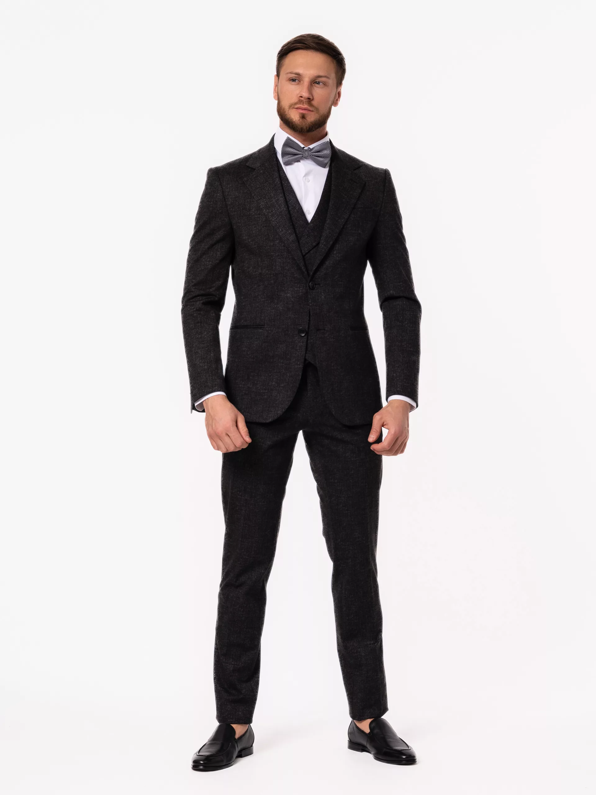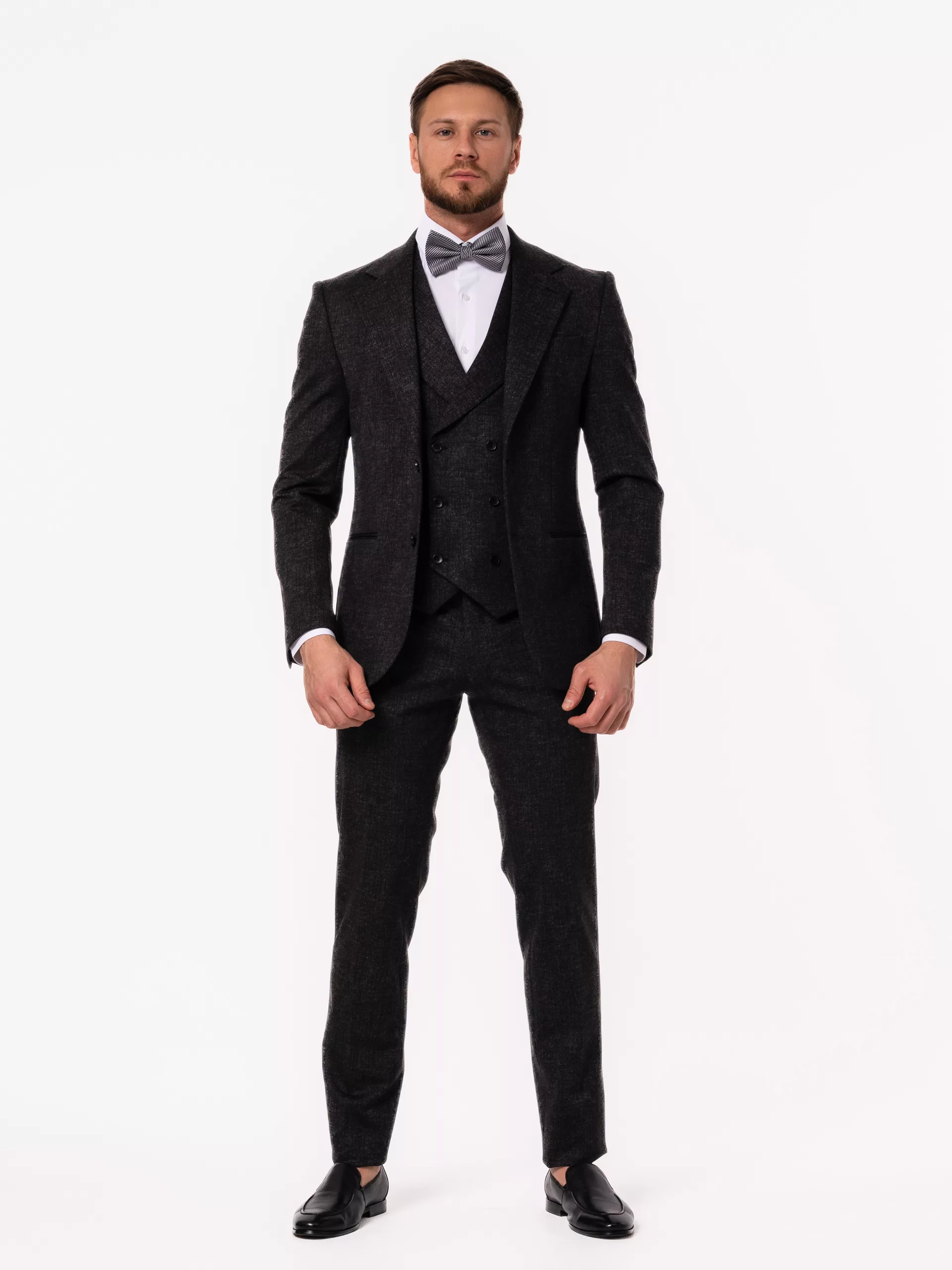 Костюм имеет замечательную посадку, отлично садится практически на любой тип фигуры. Данная модель отшита в очень редком и красивом графитовом оттенке, ткань имеет структурный рисунок, отлично подойдет для офиса и повседневной носки. Жилет костюма по спине также тканевый, что позволяет использовать его отдельно только с брюками.