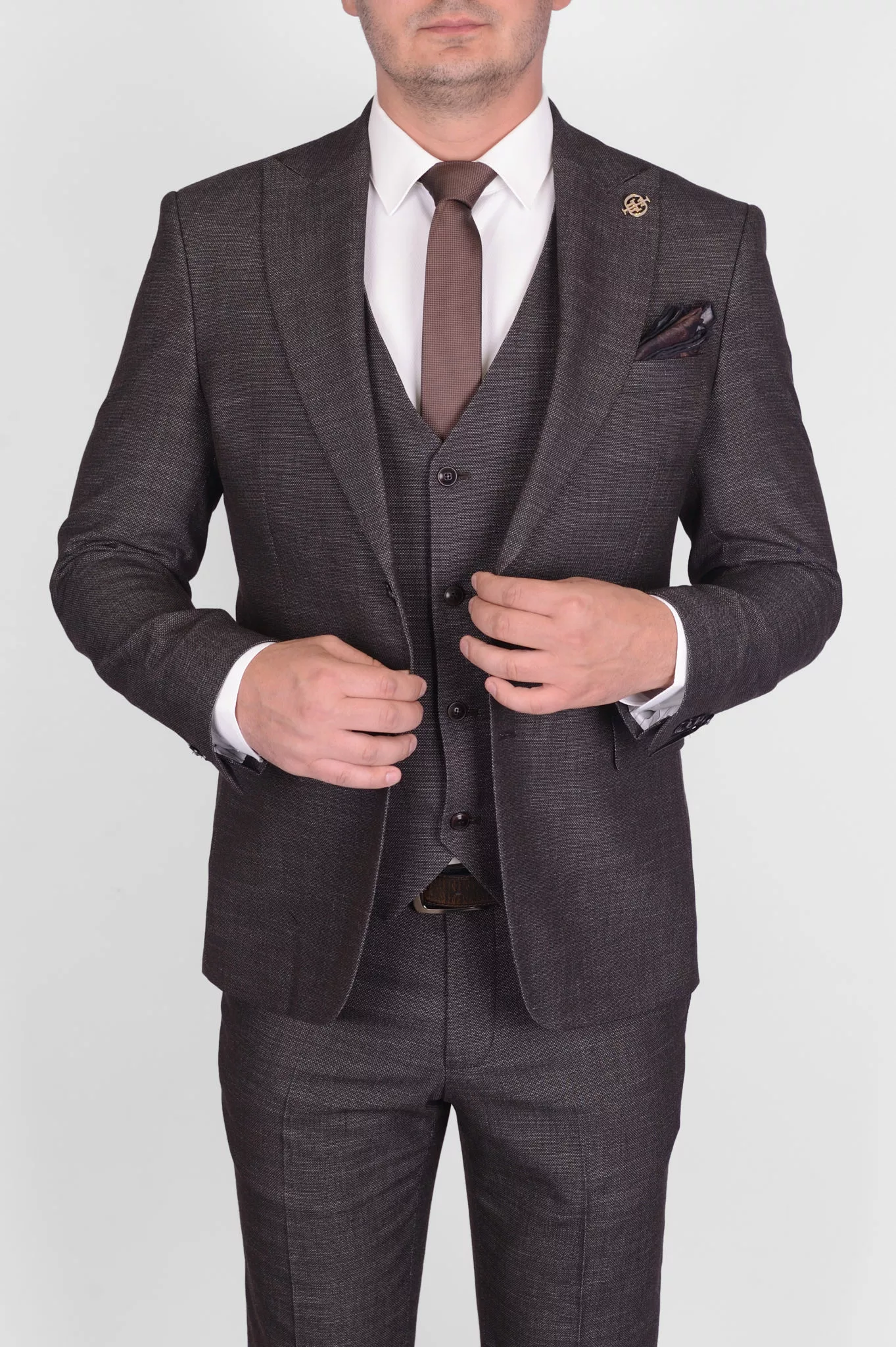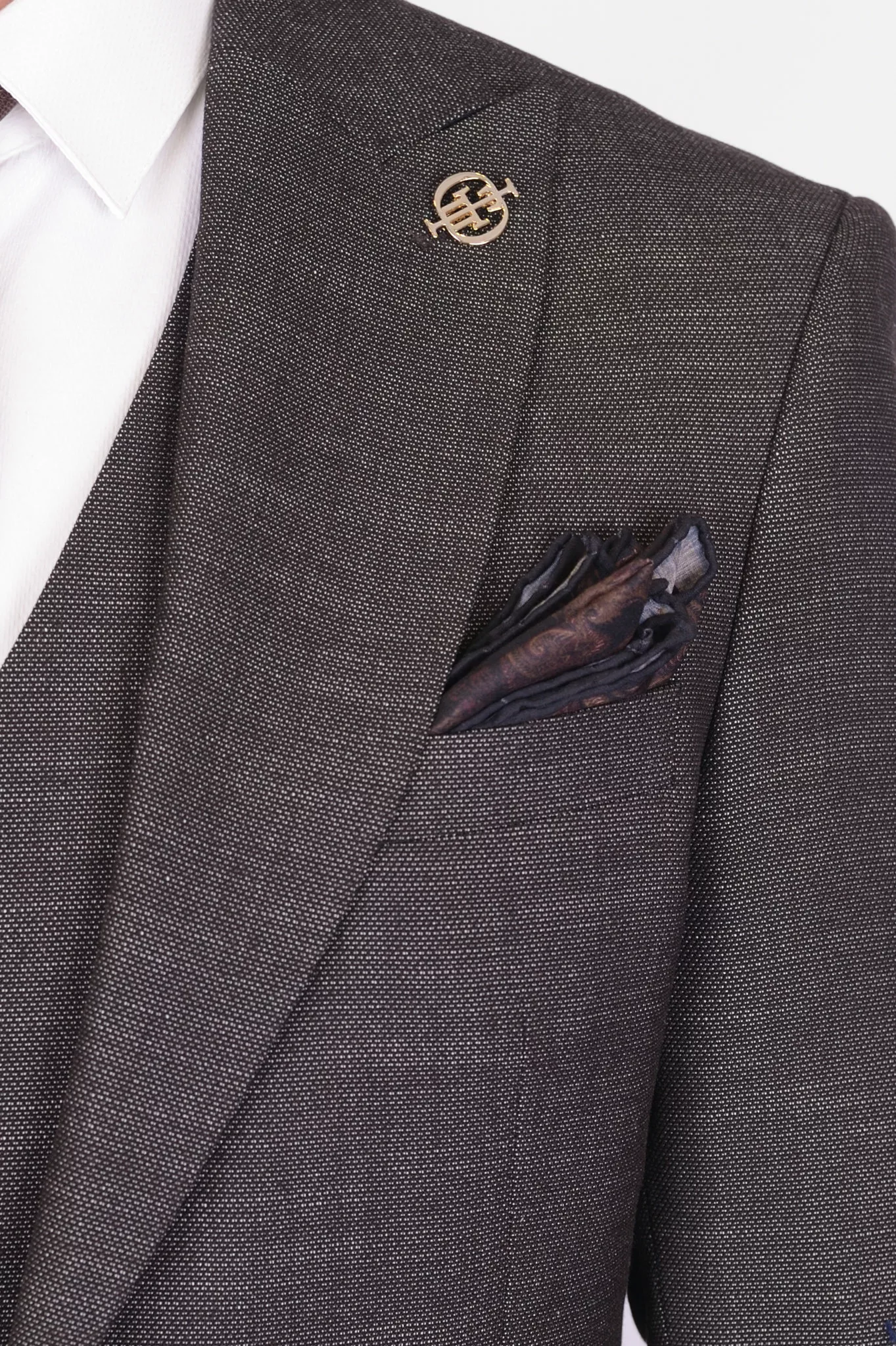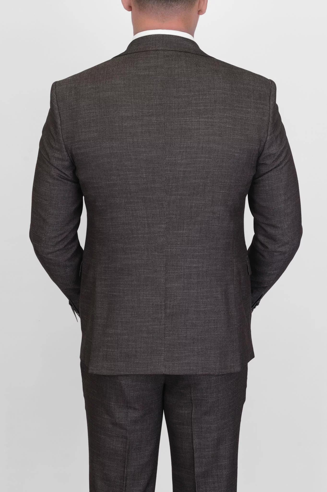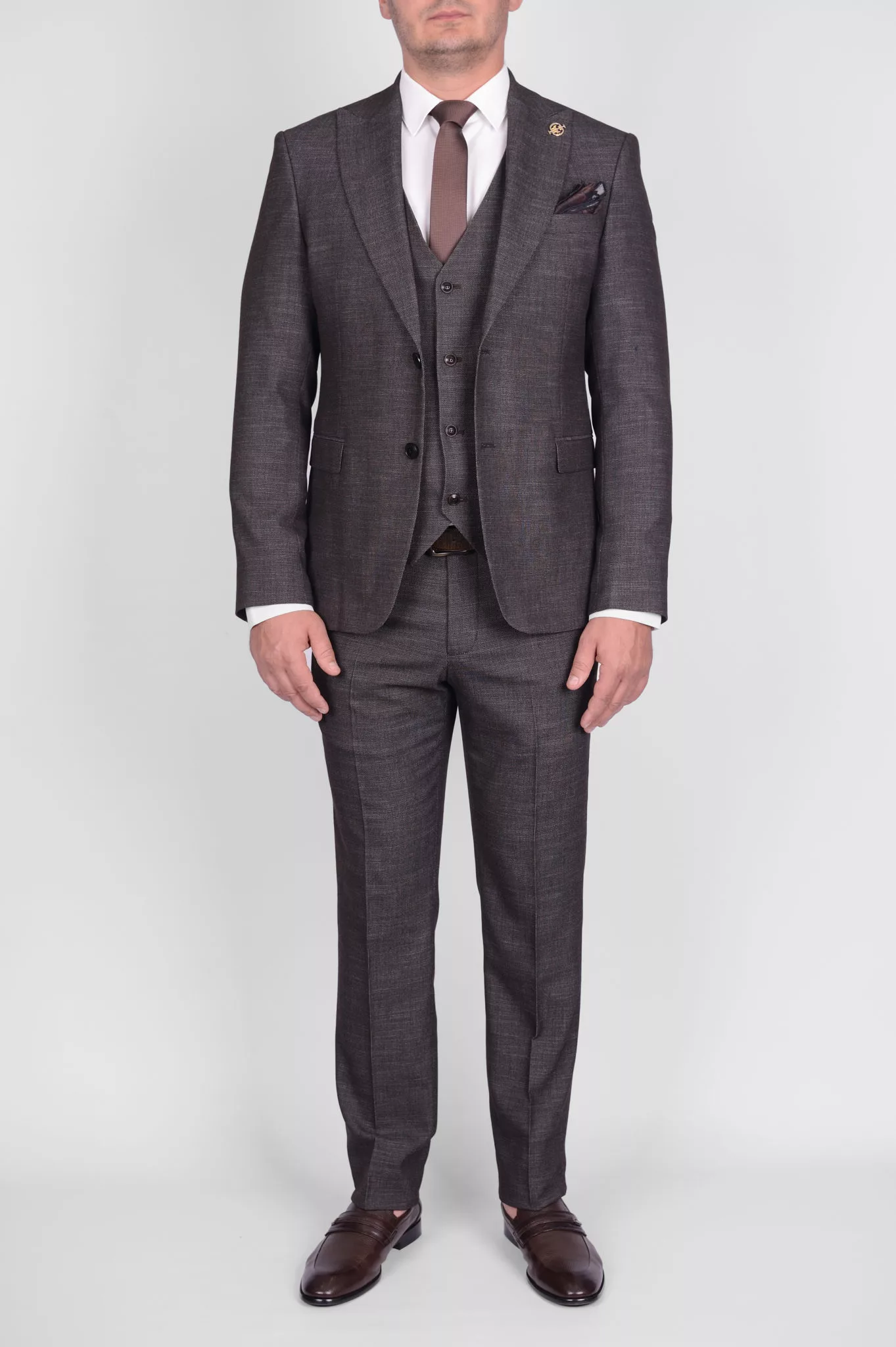 Костюм плотной посадки, отлично садится на стройную  фигуру. Данная модель отшита в очень редком насыщенном кофейном цвете, ткань имеет структурный рисунок, отлично подойдет для офиса и повседневной носки.  Жилет костюма по спине также тканевый, что позволяет использовать его отдельно только с брюками.