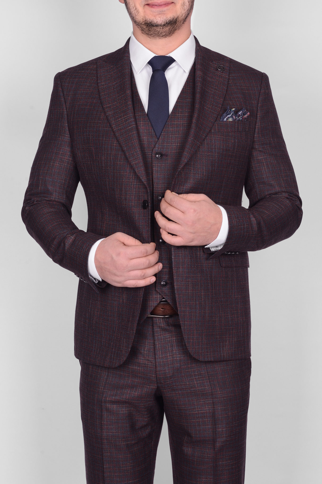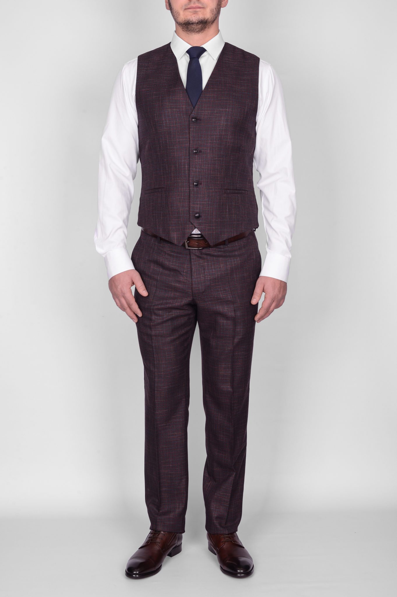 Костюм имеет замечательную посадку, отлично садится практически на любой тип фигуры. Ткань верха,-изготовлена в виде клетки с синим вкраплением на коричневой основе. Выглядит свежо и оригинально. Жилет костюма по спине также тканевый, что позволяет использовать его отдельно только с брюками.