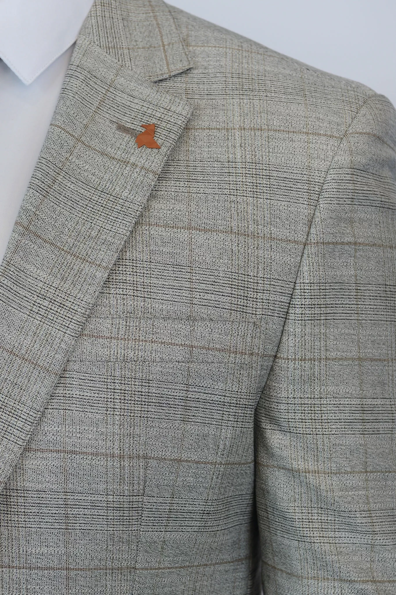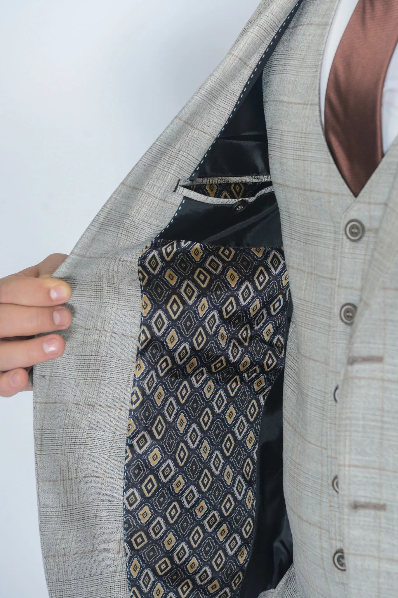 Модель отшита из высококачественной ткани в красивом светло-бежевом оттенке, дополненном английской клеткой, идеальный вариант для летней свадьбы и выпускного вечера .   Жилет костюма по спине также тканевый, что позволяет использовать его отдельно  с брюками,  будет отлично выглядеть без пиджака.