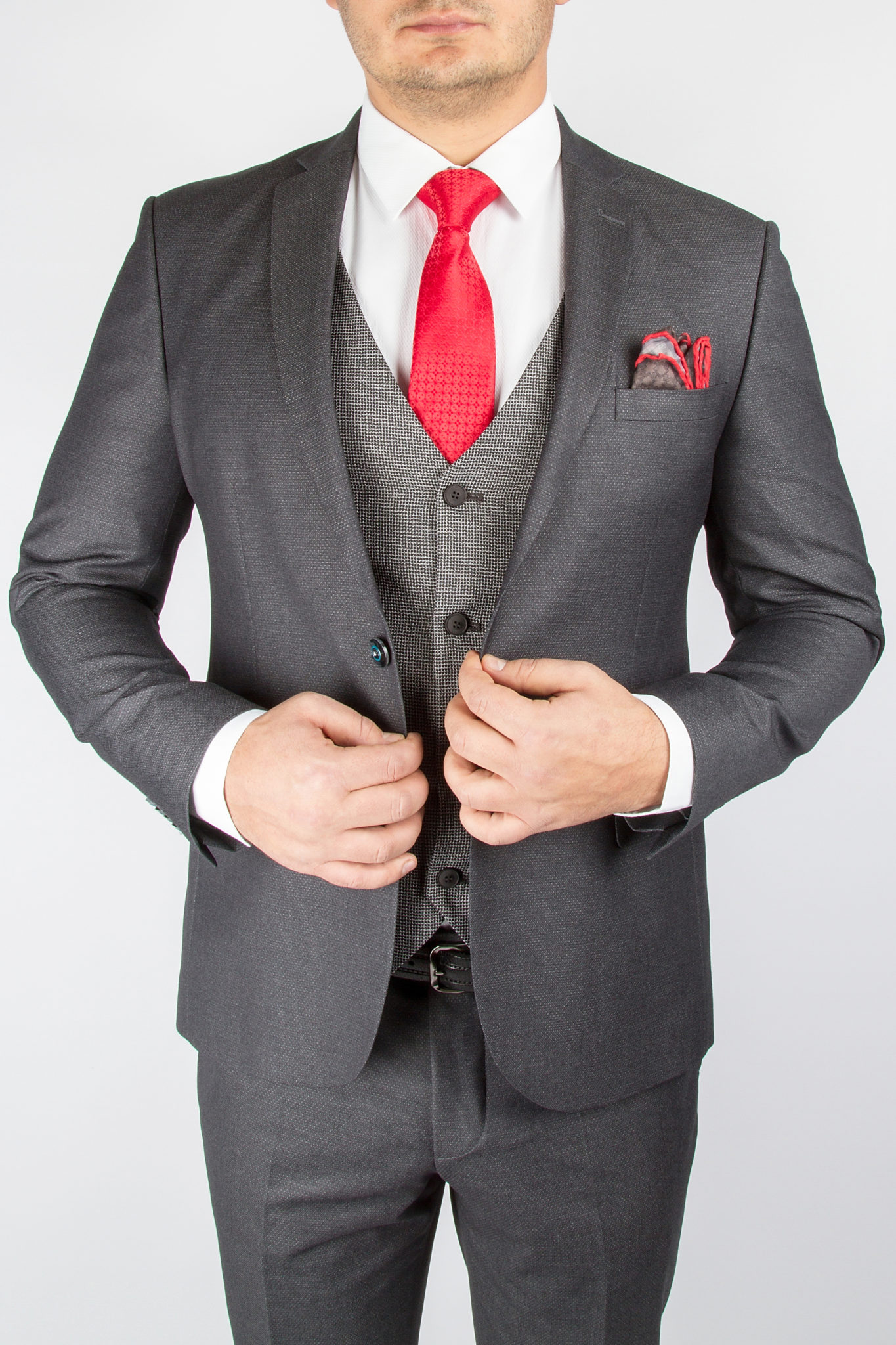 Костюм отшит в современной, приталенной модели super-slim. Пиджак имеет застежку на две пуговицы, узкий лацкан воротника, нагрудный карман с листочкой, сзади две боковые шлицы. Крой брюк-приуженный, длина свободная. По вашей просьбе мы бесплатно подгоним длину брюк под вашу ростовку. Костюм отшит из современной ткани высокого качества, которая очень хорошо держит форму, в связи с чем данная модель обладает безупречной посадкой. Ткань в костюме имеет красивую ромбовидную перфорацию, что придаст более торжественный и оригинальный вид вашему образу.
