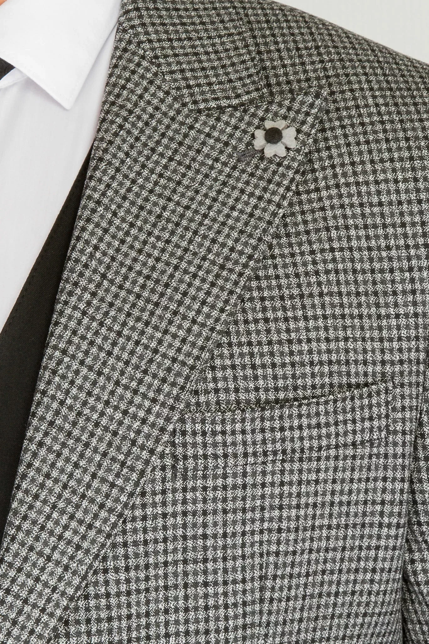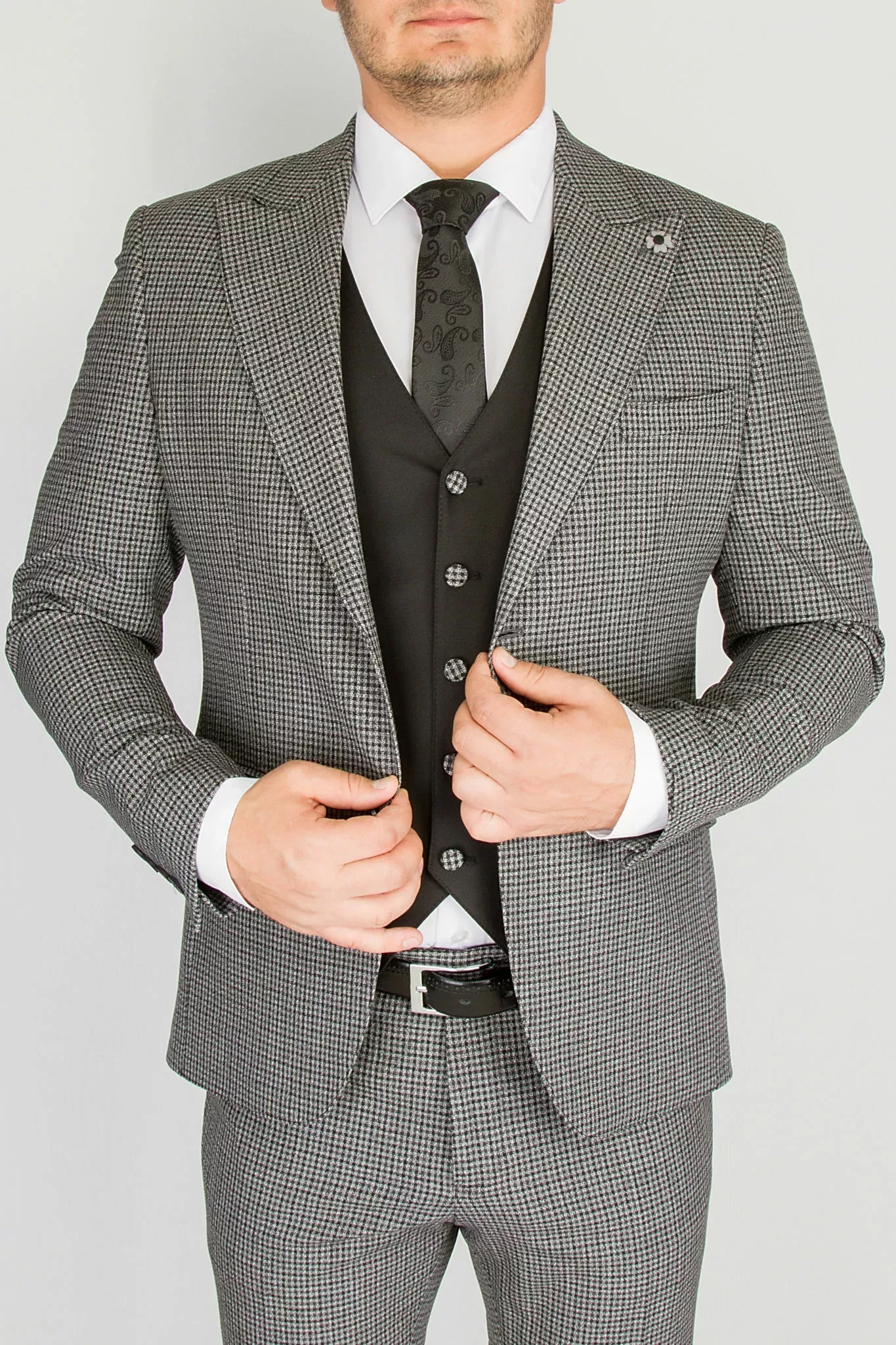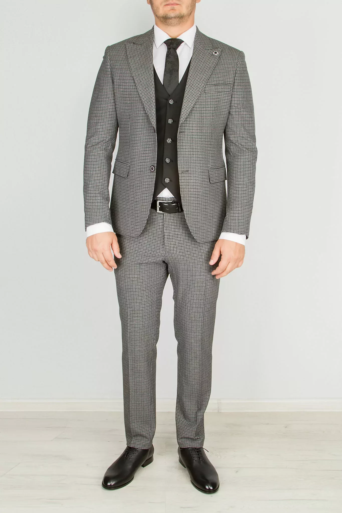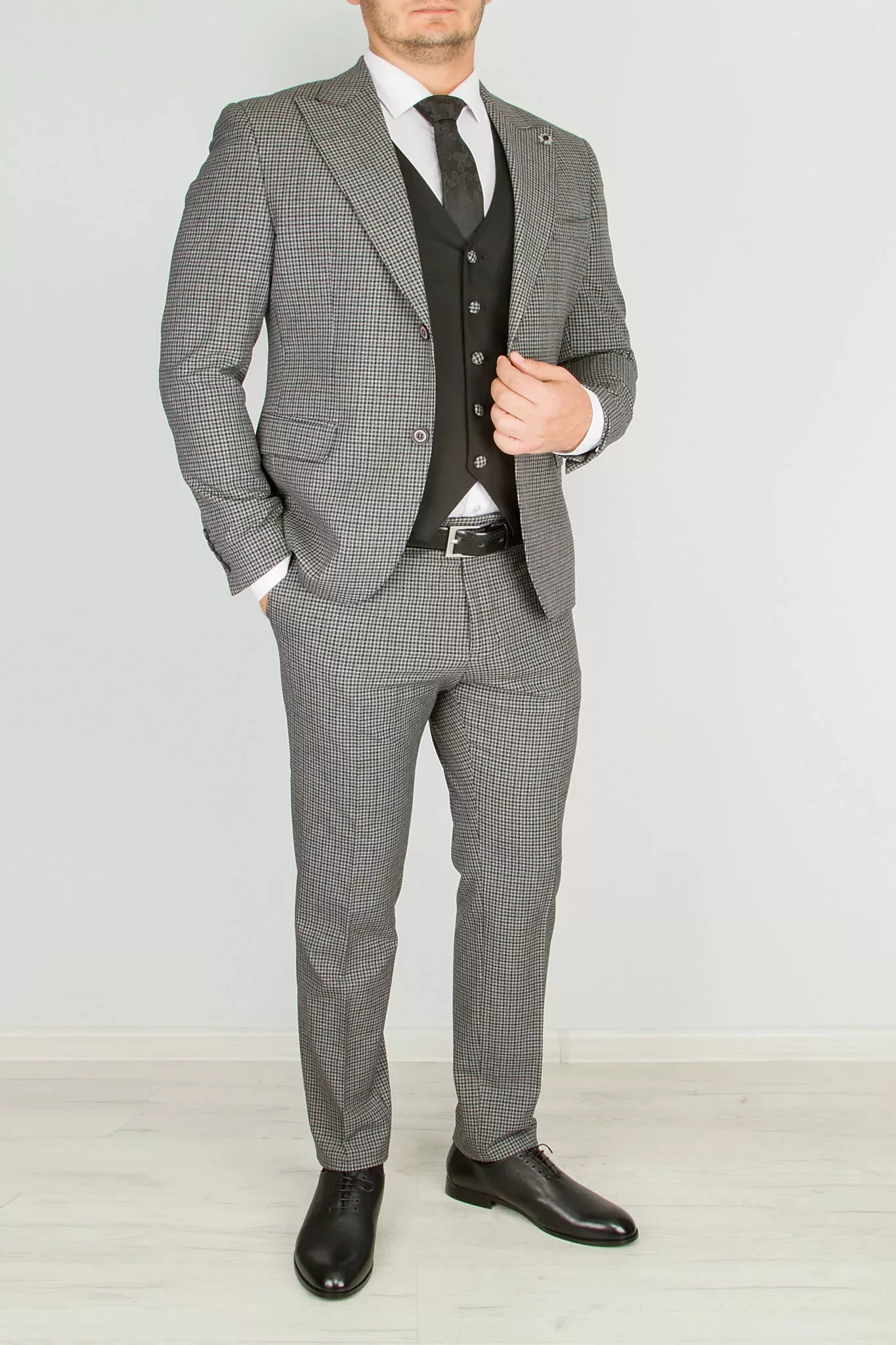 Костюм-тройка серого цвета в клетку с черным жилетом