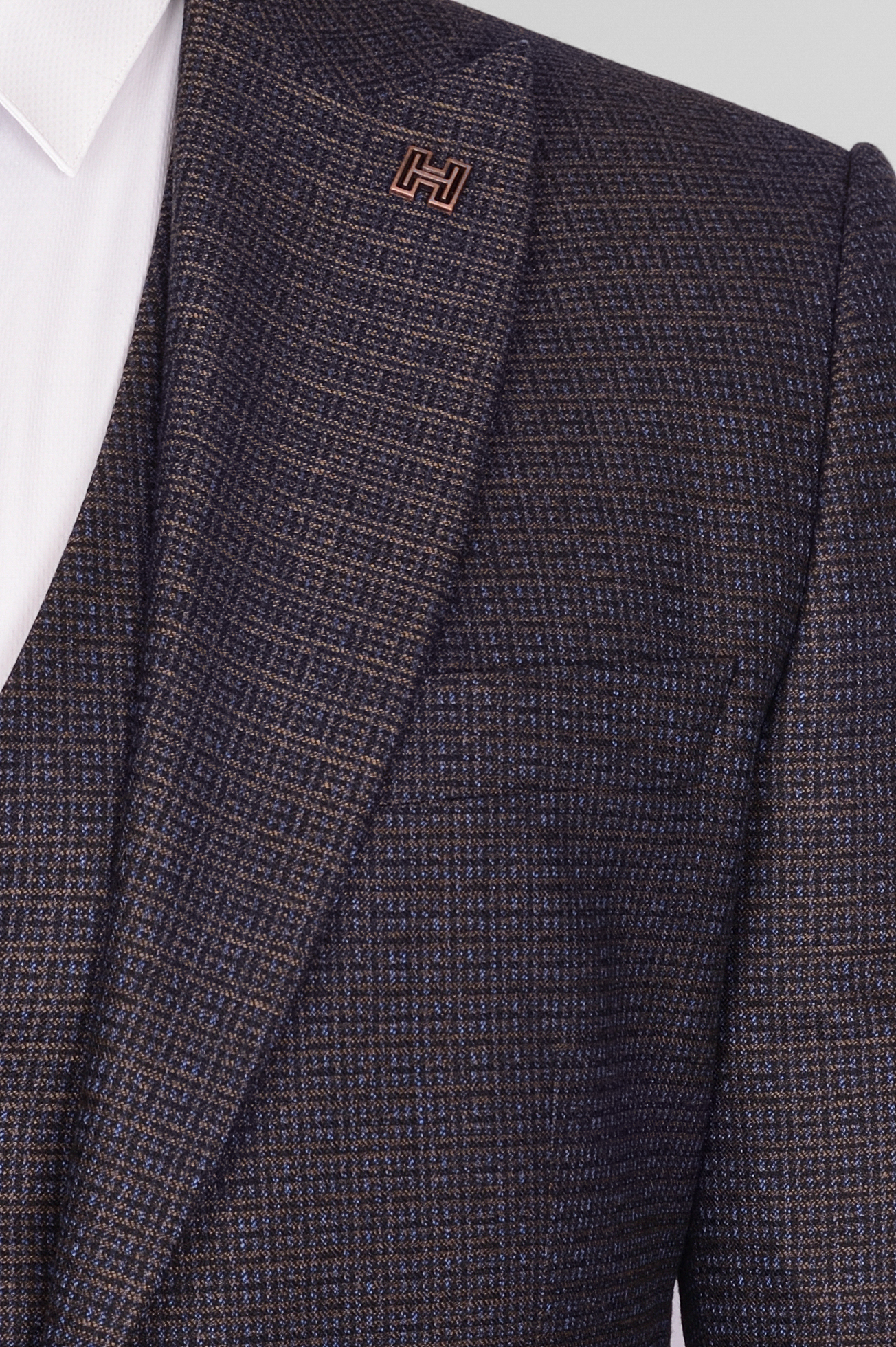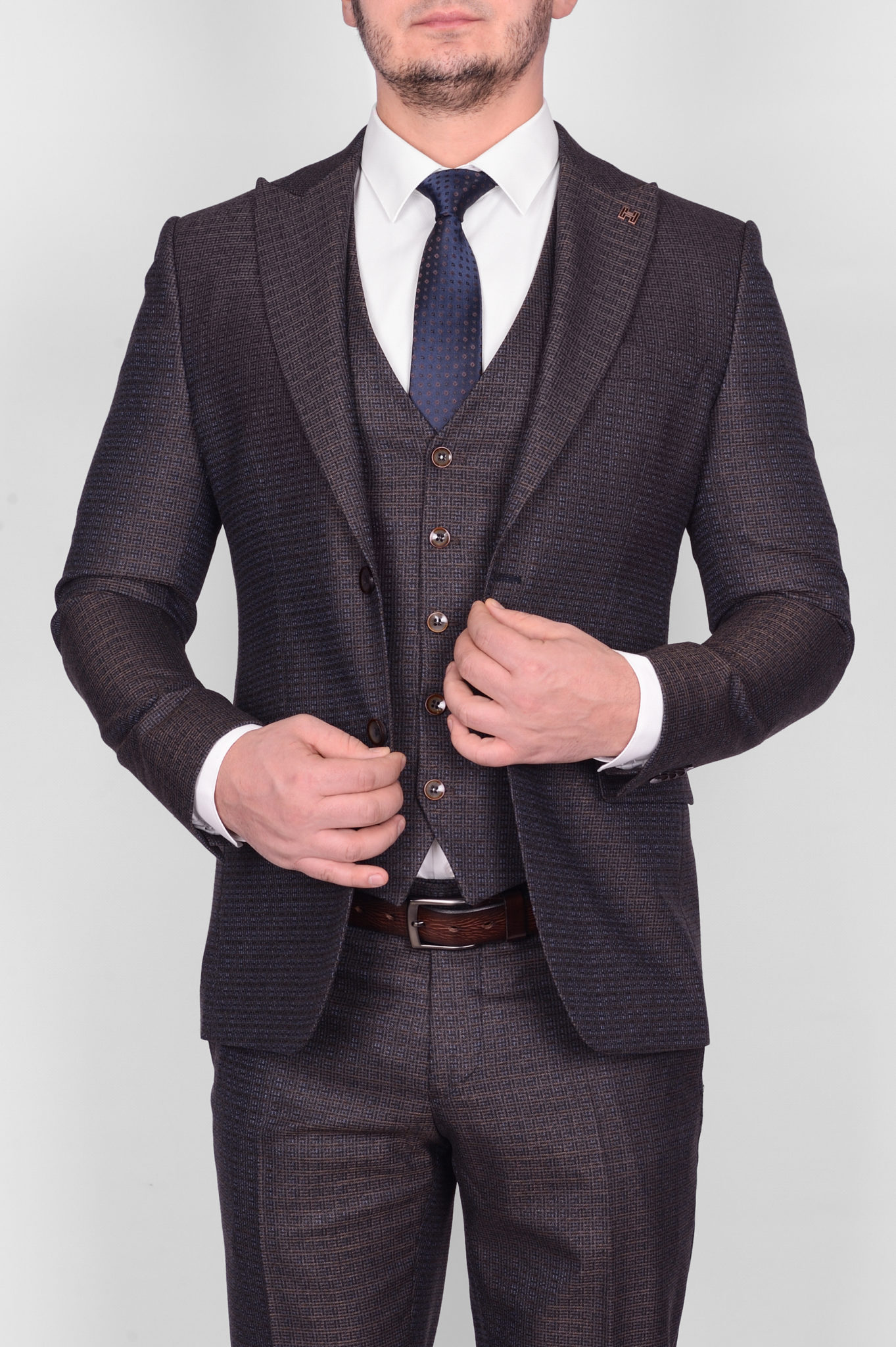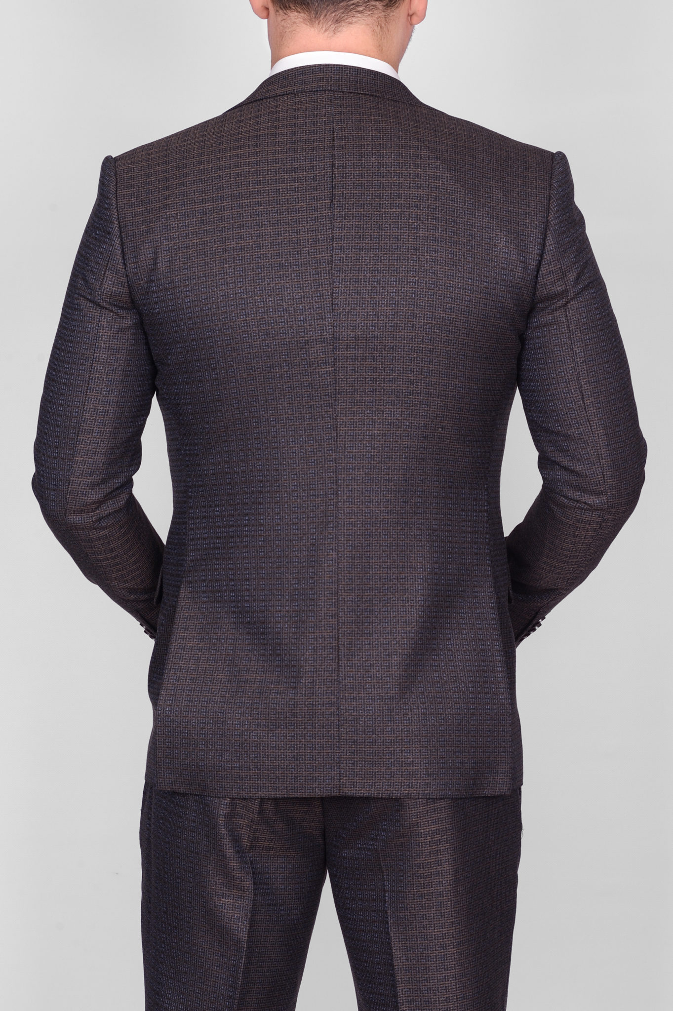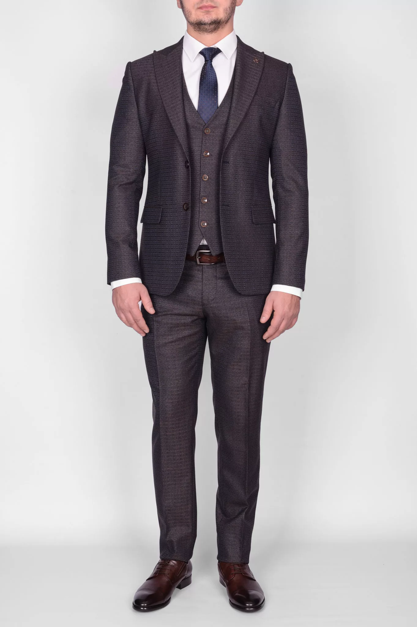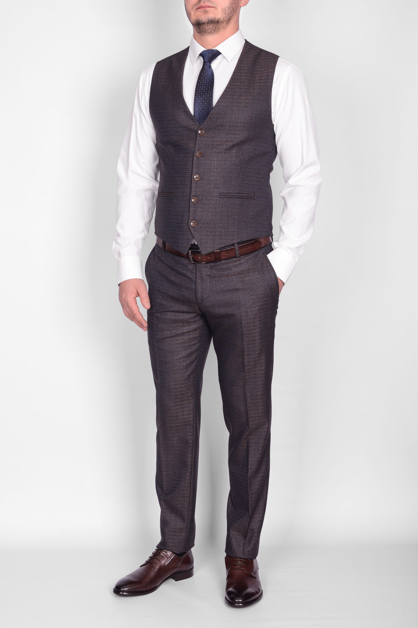 Костюм плотной посадки, отлично садится на стройную фигуру. Данная модель отшита в темно-сером цвете, ткань имеет структурный рисунок, отлично подойдет для офиса и повседневной носки. Жилет костюма по спине также тканевый, что позволяет использовать его отдельно только с брюками.