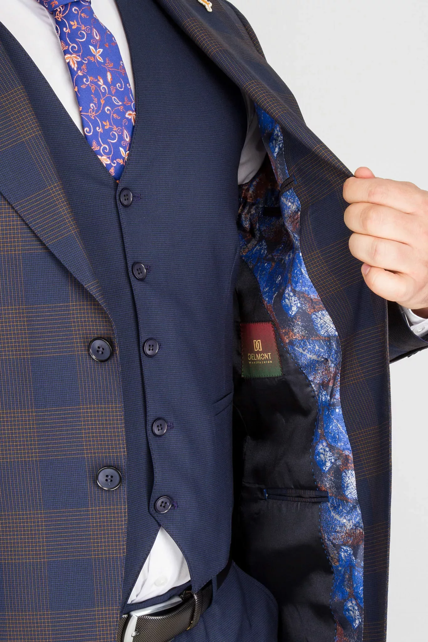 Костюм отшит в приталенной модели super-slim. Пиджак имеет застежку на две пуговицы, лацкан воротника заостренной формы, нагрудный карман с листочкой, сзади две боковые шлицы. Жилет однобортный с регулятором обьема по спине. Брюки, приуженного кроя, свободной длины. По вашей просьбе мы подгоним длину брюк под вашу ростовку. Костюм отшит в модели «компаньон»,- однотонные жилет и брюки скомпанованы с клеточным пиджаком, что делает ваш образ образ более строгим и официальным. Костюм будет актуальным для деловой встречи, работы в офисе, обучении.