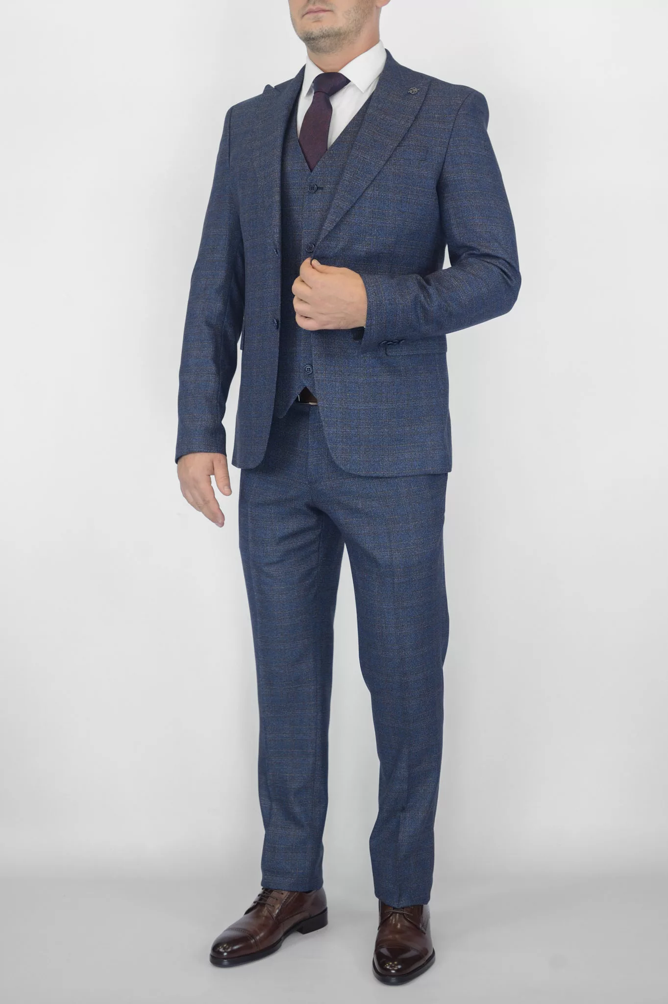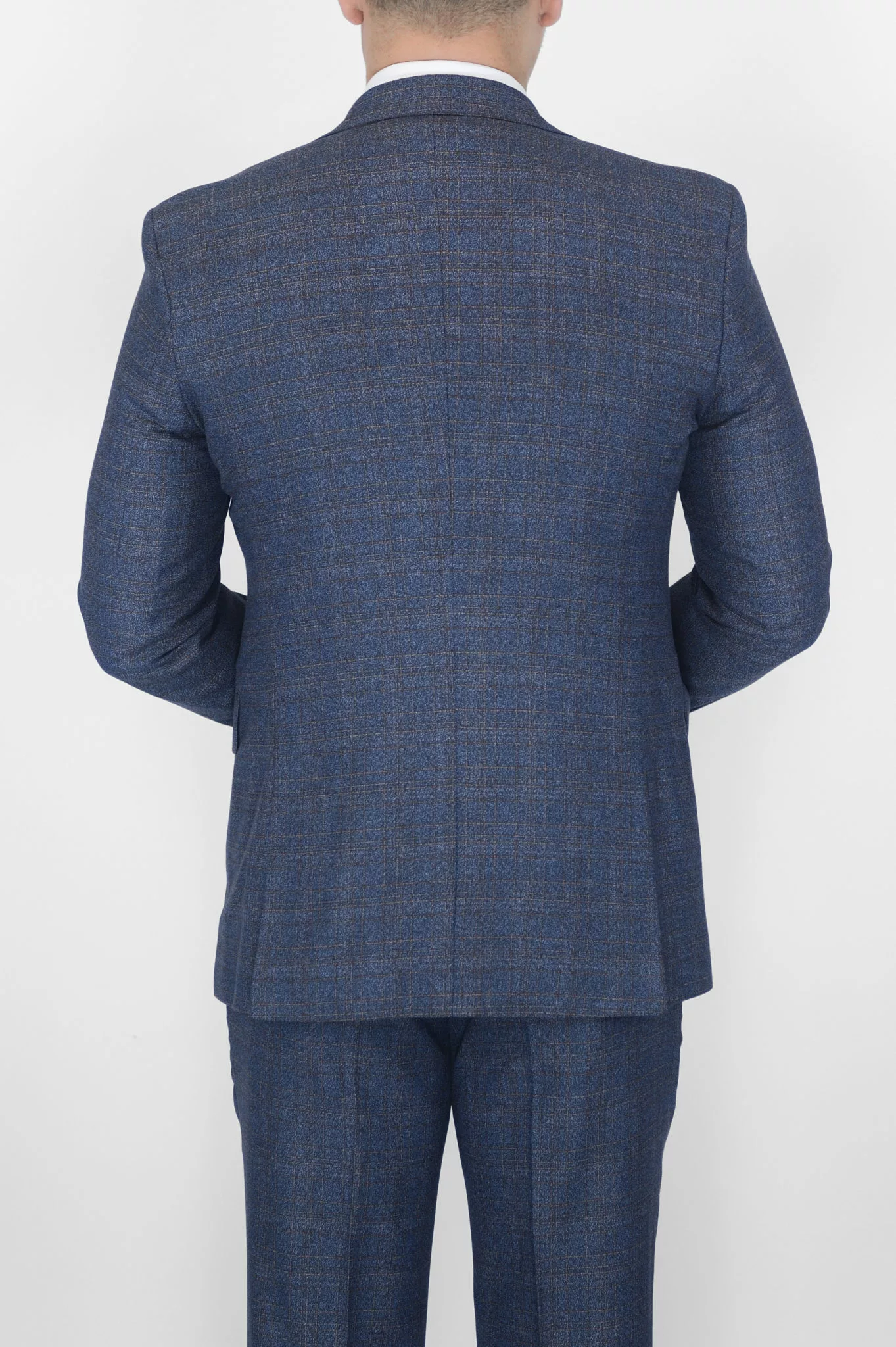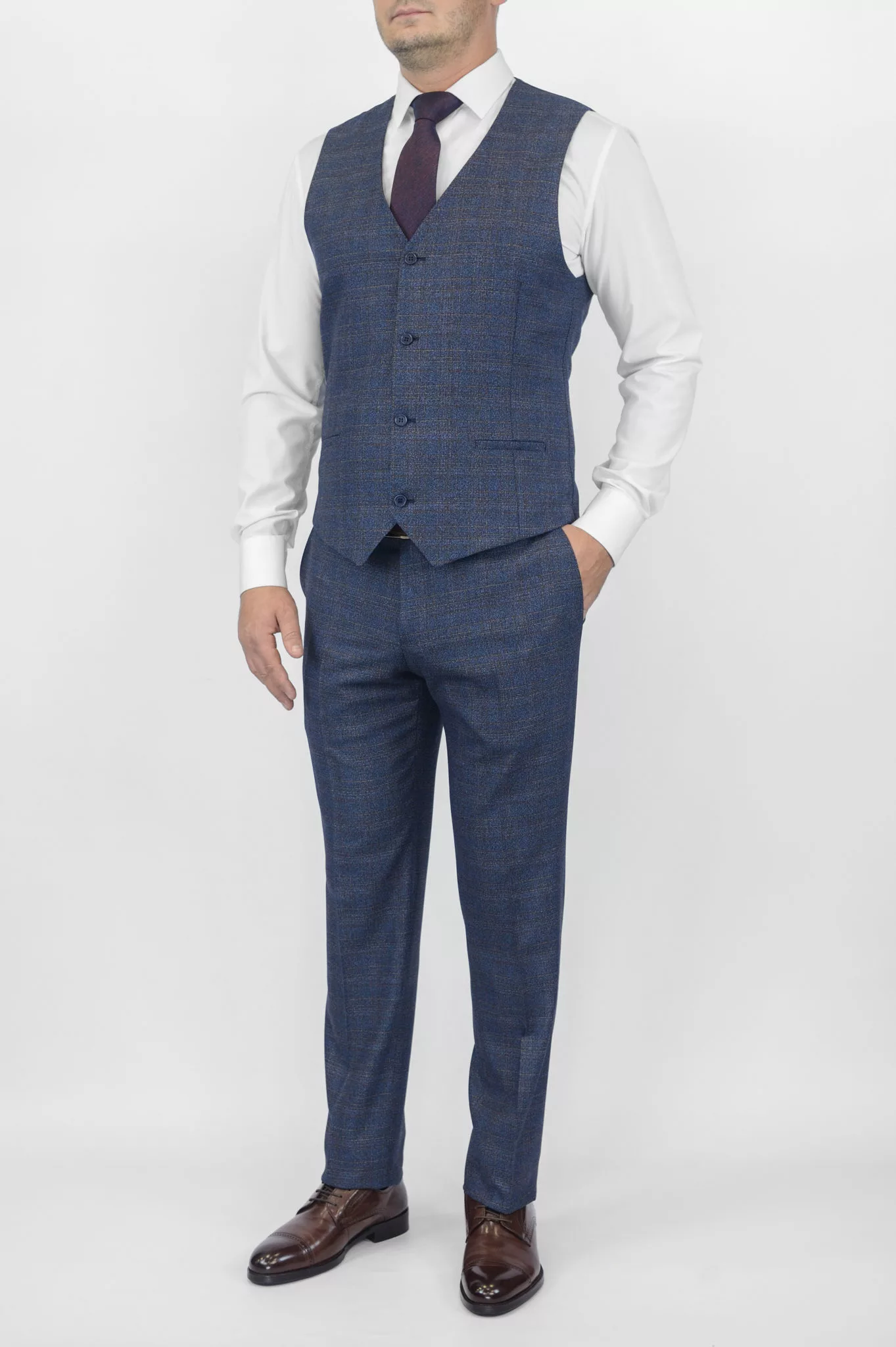 Костюм имеет замечательную посадку, отлично садится практически на любой тип фигуры. Данная модель отшита в красивом, строгом синем цвете с неброской клеткой, отлично подойдет для офиса и повседневной носки.  Жилет костюма по спине также тканевый, что позволяет использовать его отдельно только с брюками. Пиджак по спине без подклада, модель отшита в облегченном варианте.