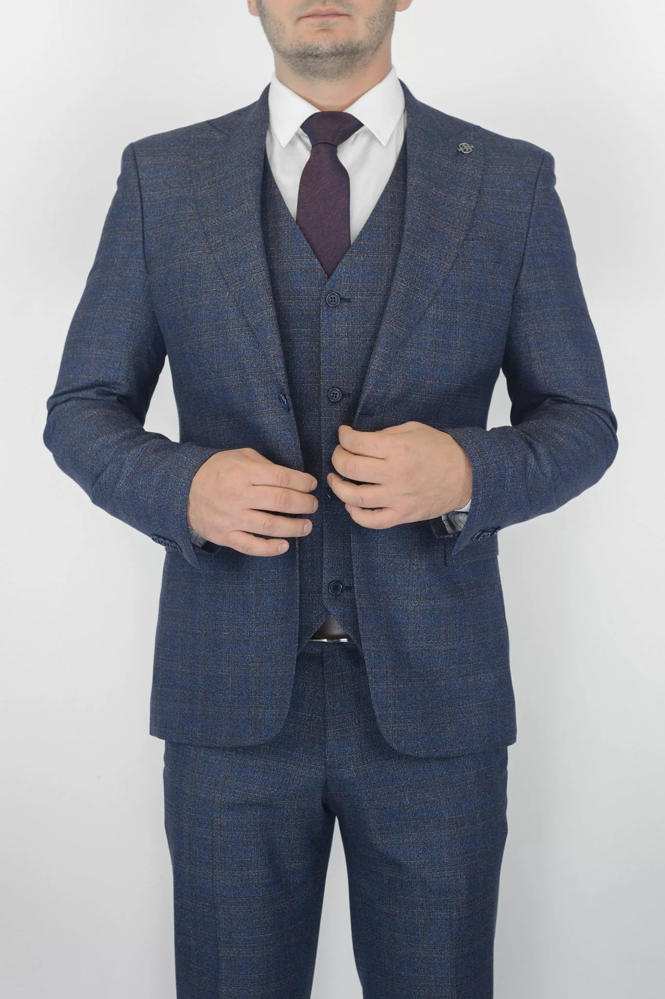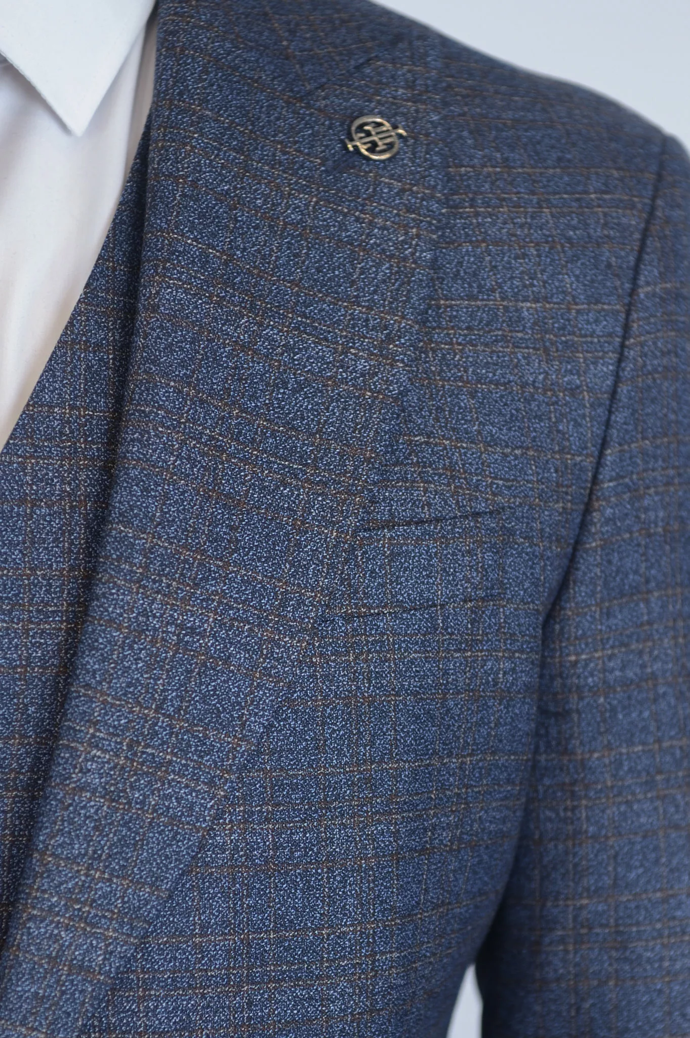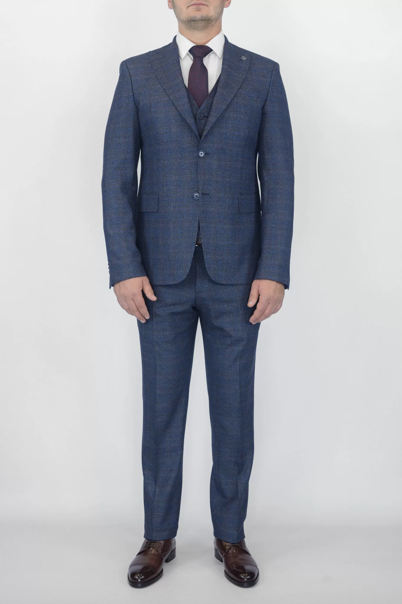 Костюм имеет замечательную посадку, отлично садится практически на любой тип фигуры. Данная модель отшита в красивом, строгом синем цвете с неброской клеткой, отлично подойдет для офиса и повседневной носки.  Жилет костюма по спине также тканевый, что позволяет использовать его отдельно только с брюками. Пиджак по спине без подклада, модель отшита в облегченном варианте.