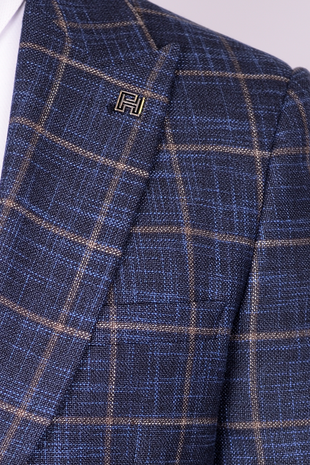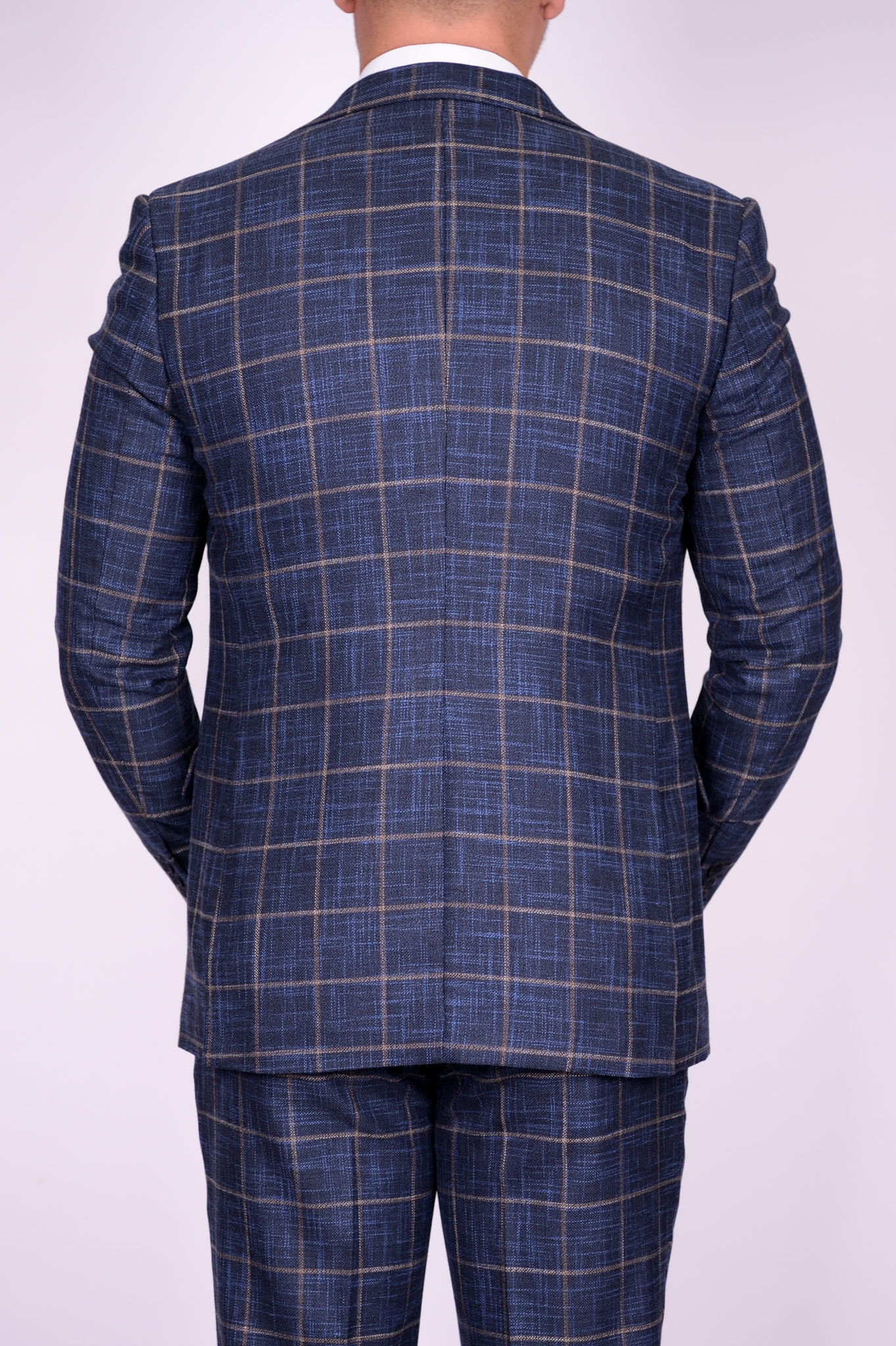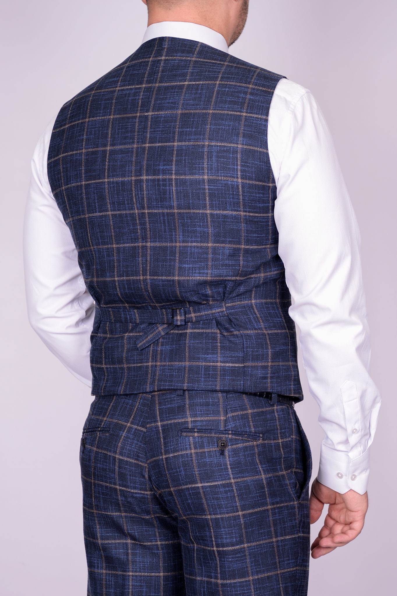 Костюм имеет замечательную посадку, отлично садится практически на любой тип фигуры. Ткань верха, спокойного синего цвета с серым вкраплением, отлично гармонирует с бежевой клеткой. Жилет костюма по спине также тканевый, что позволяет использовать его отдельно только с брюками.