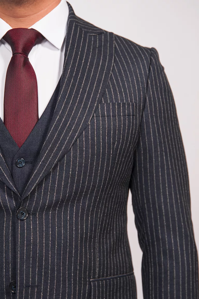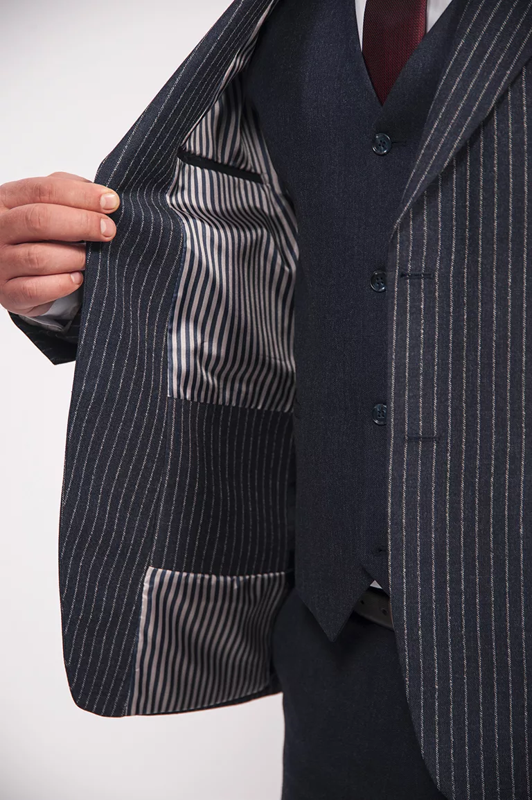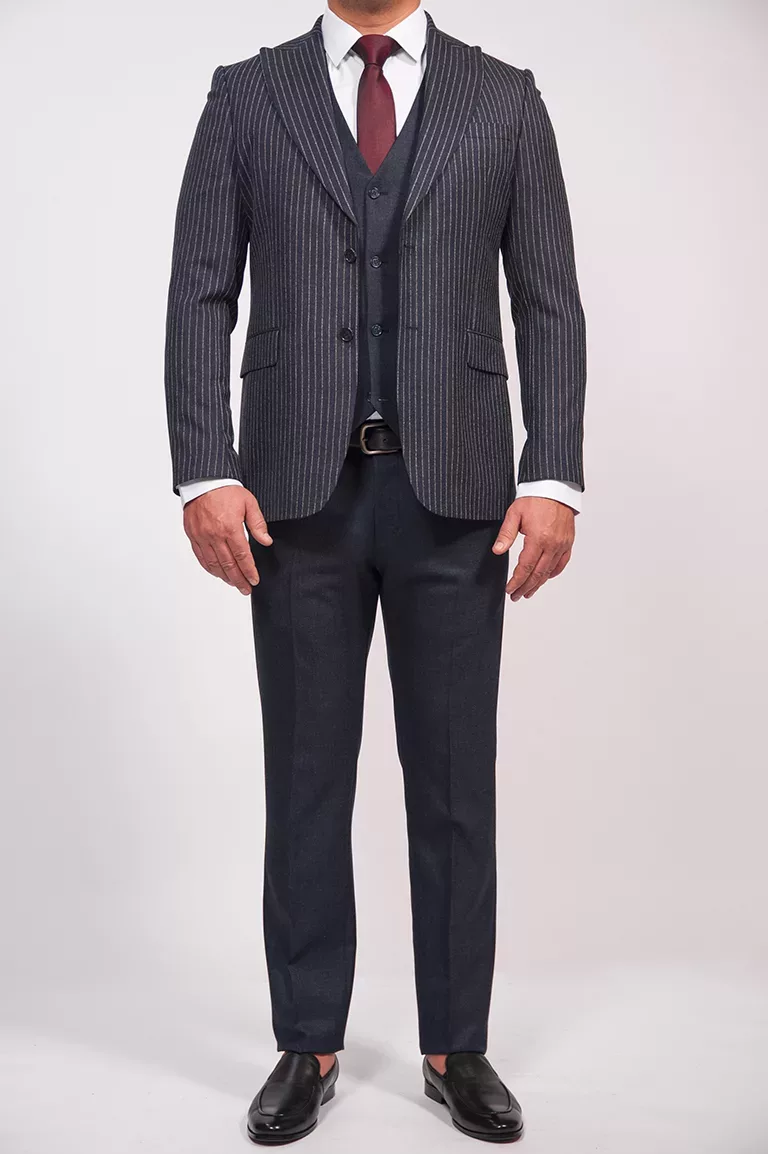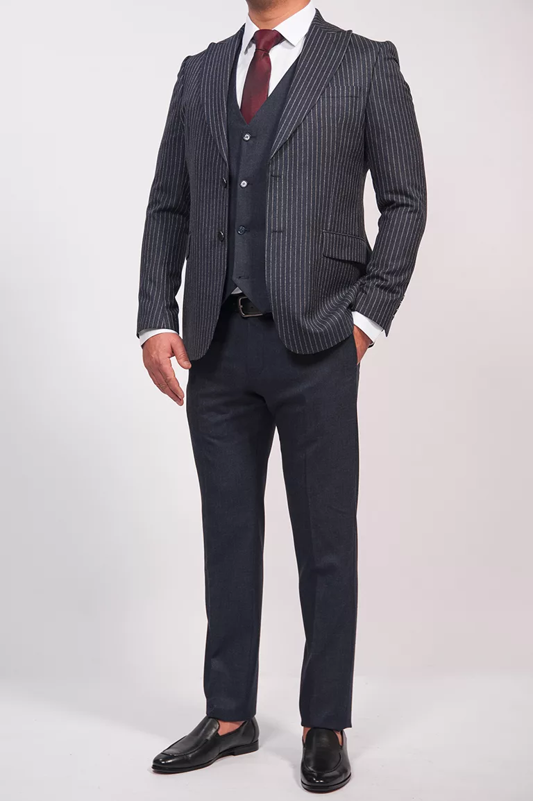 Костюм-тройка отшит в полуприталенной модели. Пиджак имеет застежку на две пуговицы, значок в петлице. Однобортный жилет с регулятором обьема, задняя часть из основной ткани верха (не подкладочная). Брюки современного, прямого кроя, имеют свободную длину. По вашей просьбе мы бесплатно подгоним длину брюк под вашу ростовку. Костюм отшит из смесовой ткани высокого качества в составе 70% шерсти и 30 % вискозы, что позволяет максимально долго сохранять презентабельный внешний вид и форму, ткань тонкая устойчива к заминанию. Пиджак в полоску комбинируется с однотонными жилетом и брюками, также в комплекте идет кепка-восьмиклинка.