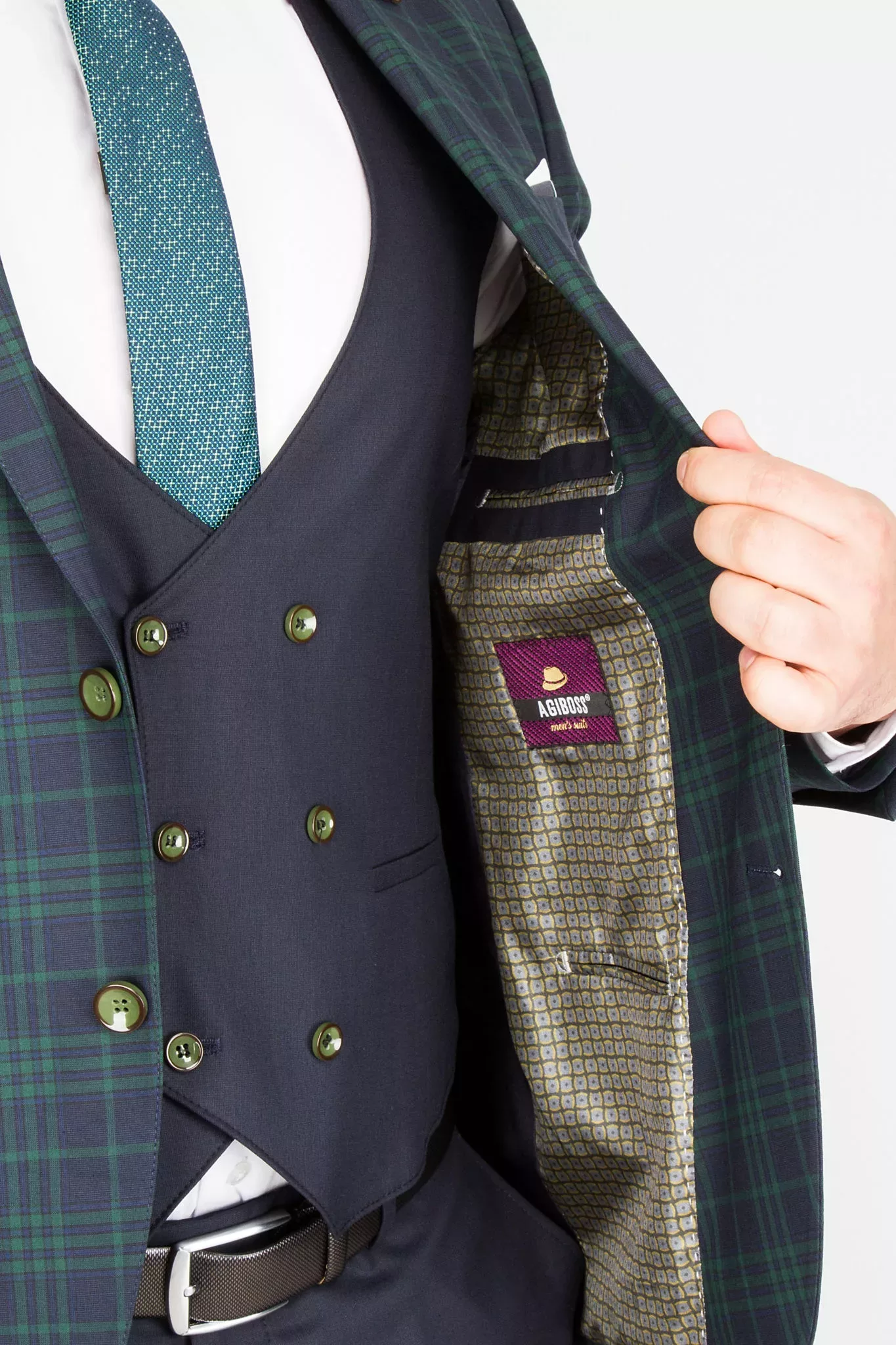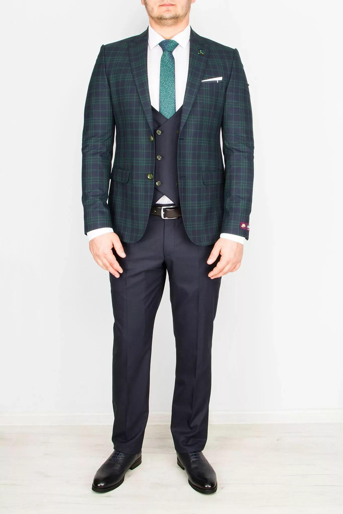 Костюм-тройка синего цвета в зеленую клетку