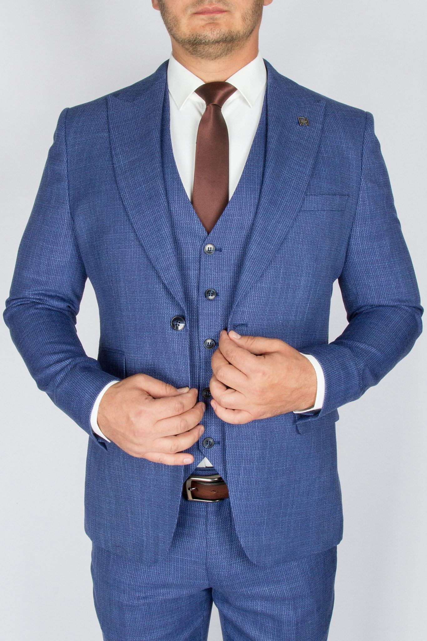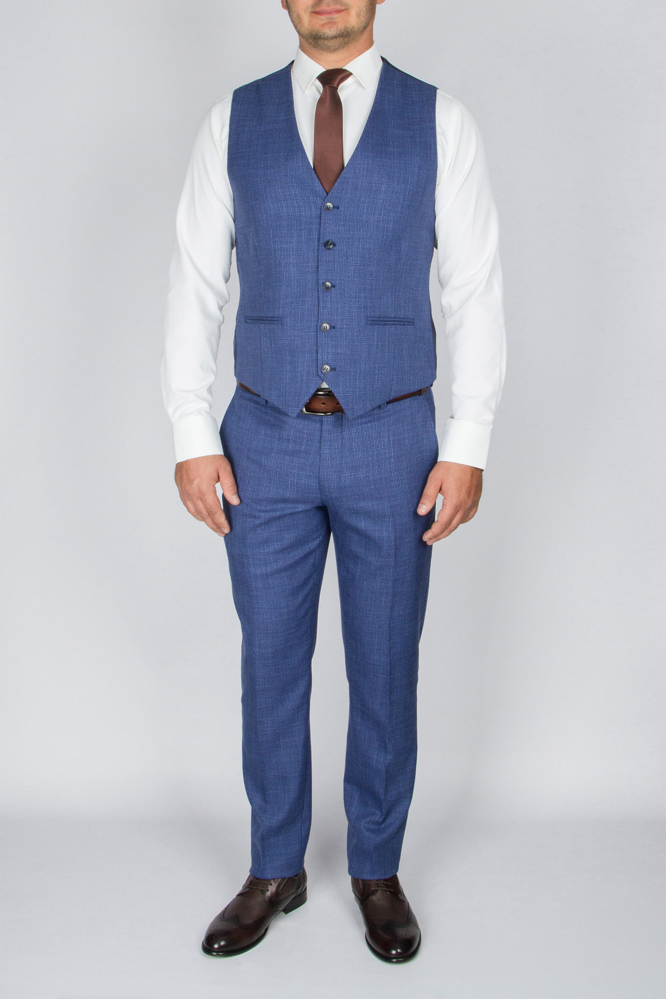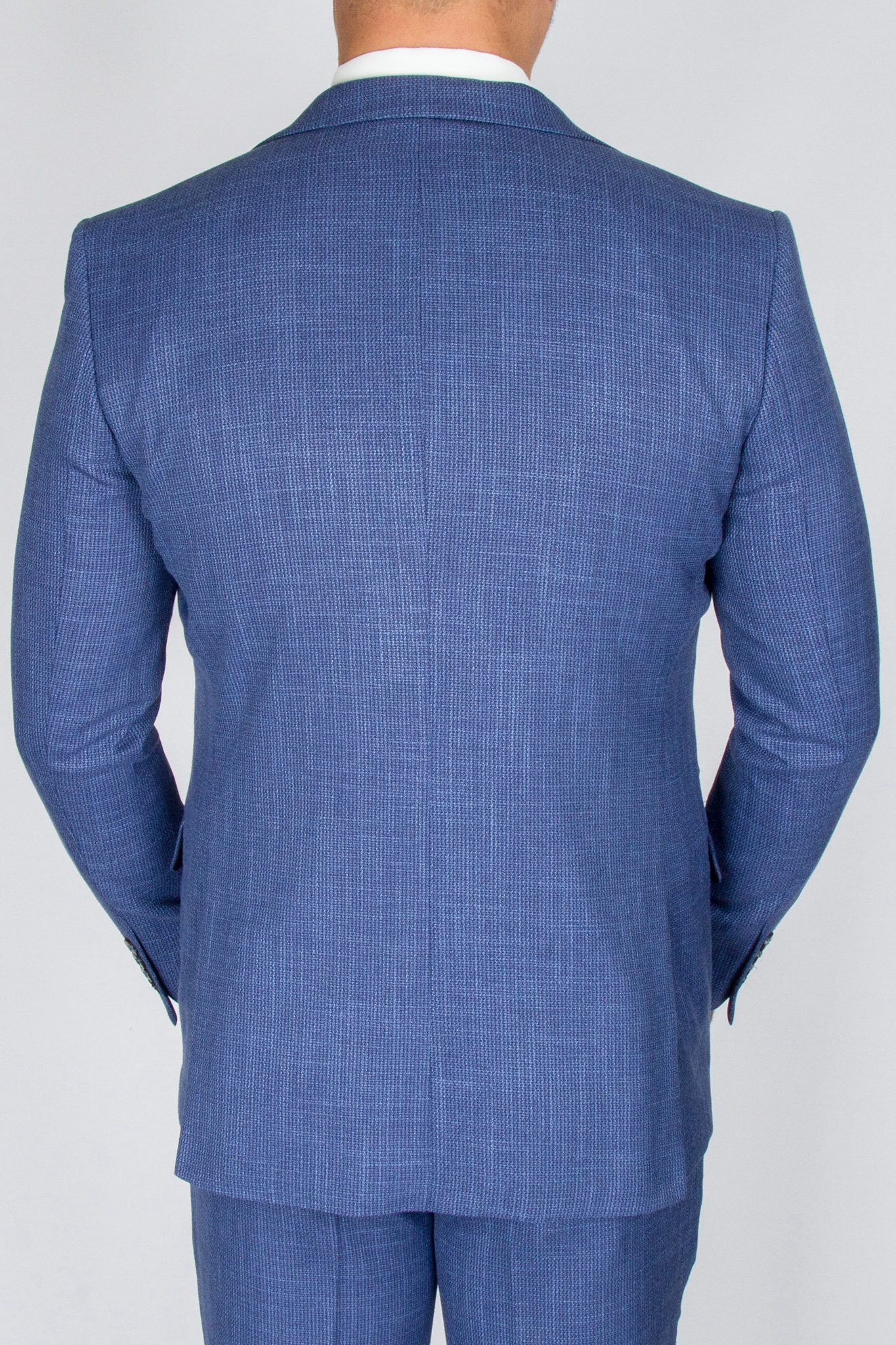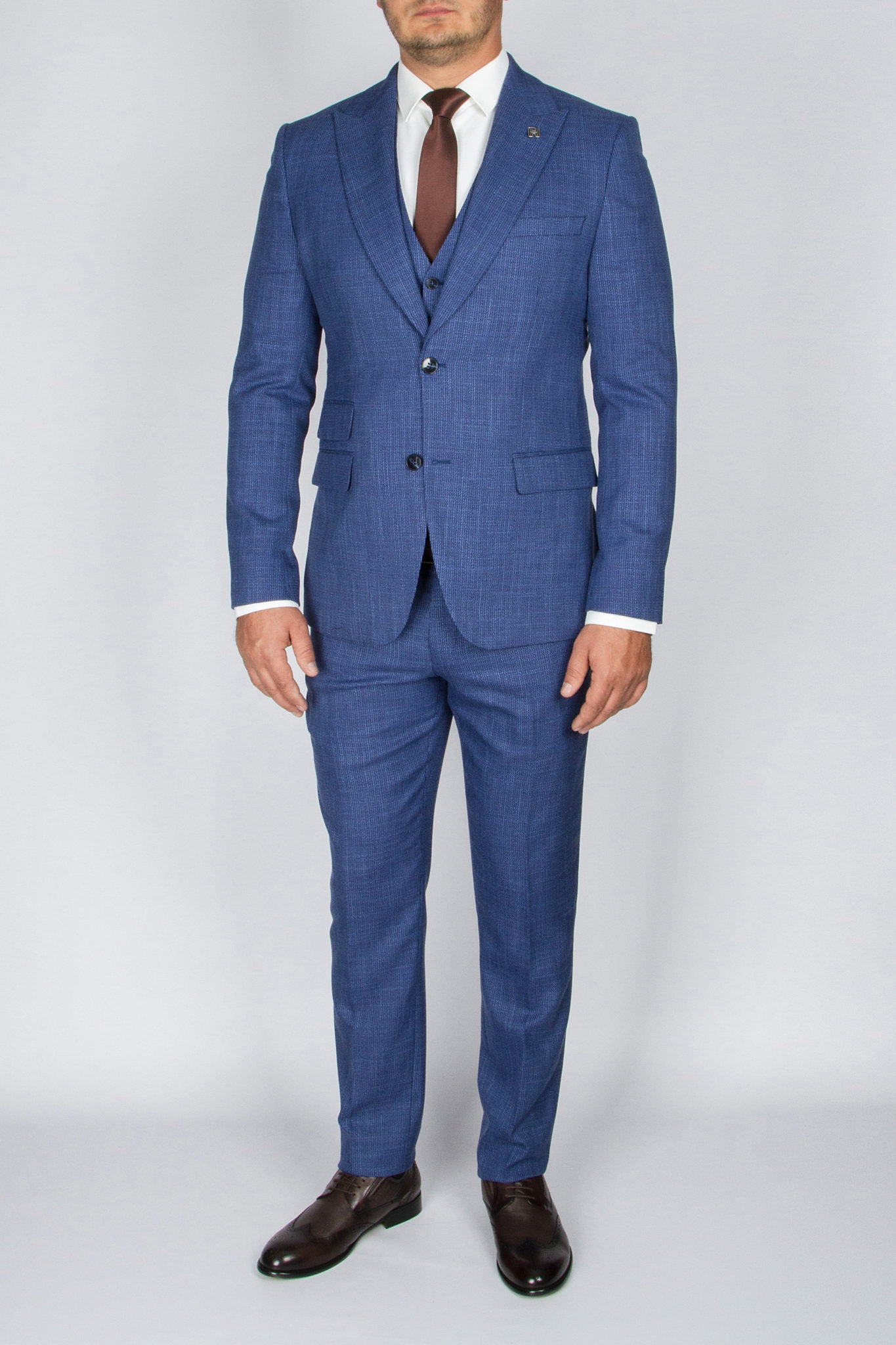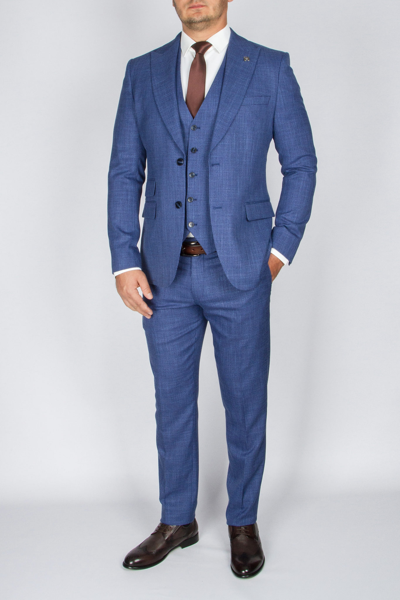 Данный костюм классического синего цвета, ткань имеет легкую выработку, выгодно отличающую его от однотонных вариаций и образов.