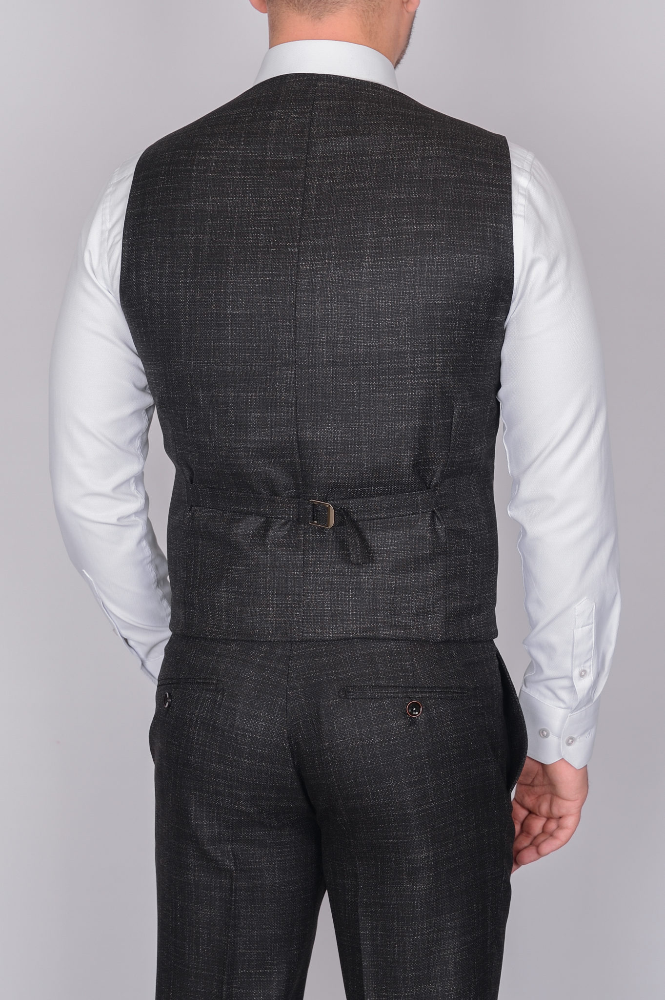 Костюм имеет замечательную посадку, отлично садится практически на любой тип фигуры. Данная модель отшита в темно-сером цвете, ткань имеет структурный рисунок, отлично подойдет для офиса и повседневной носки. Жилет костюма по спине также тканевый, что позволяет использовать его отдельно только с брюками.
