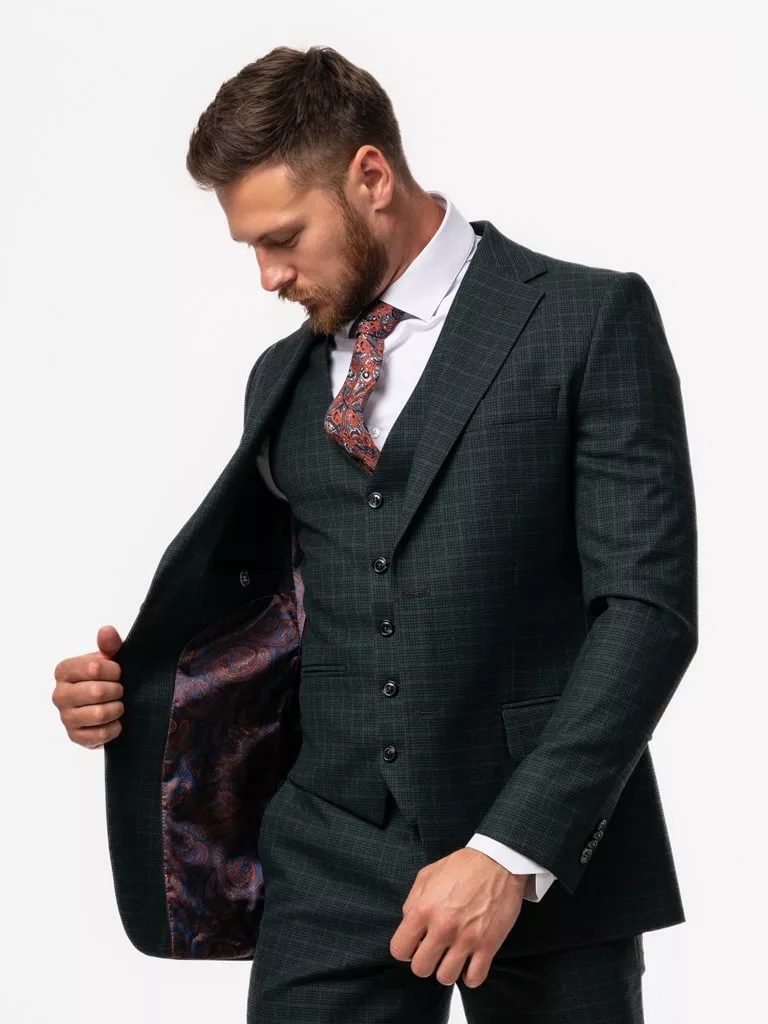 Костюм отшит в приталенной модели super-slim. Пиджак имеет застежку на две пуговицы, узкий лацкан воротника, нагрудный карман с листочкой комплектуемый платком, значек в петлице. Двубортный жилет с пуговицами в цвет пиджака, спина также из основной (не подкладочной) ткани. Брюки узкие, имеют свободную длину. По вашей просьбе мы подгоним длину брюк под вашу ростовку. В костюме яркий, красивый подборт отлично гармонирующий с тканью верха. Костюм отшит из смесовой ткани высокого качества в составе 80% шерсти 15% вискозы и 5% эластан, что позволяет долго сохранять презентабельный внешний вид и форму, ткань устойчива к заминанию.