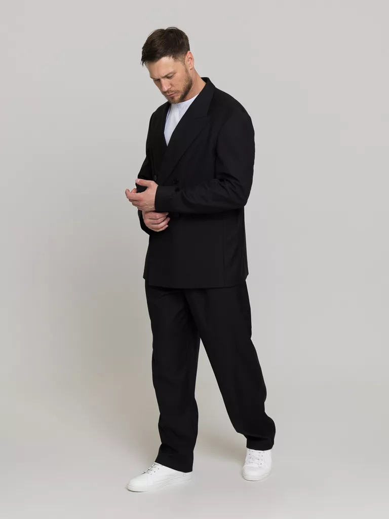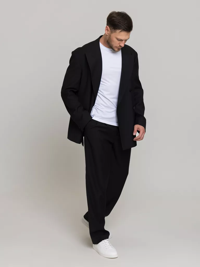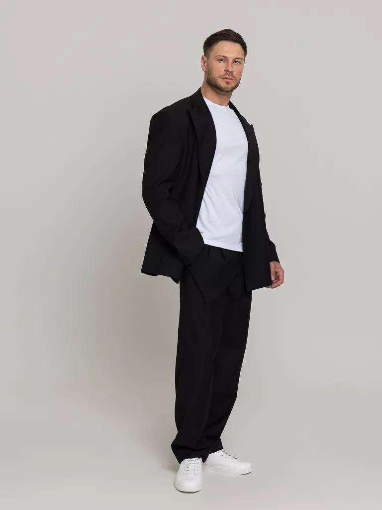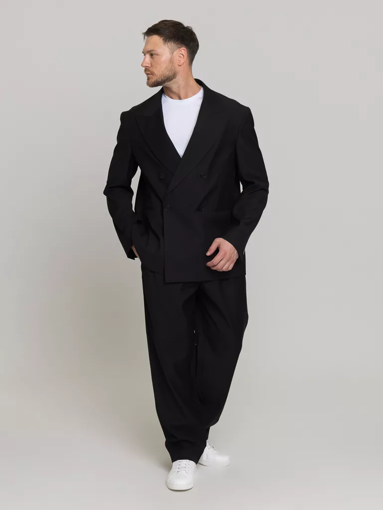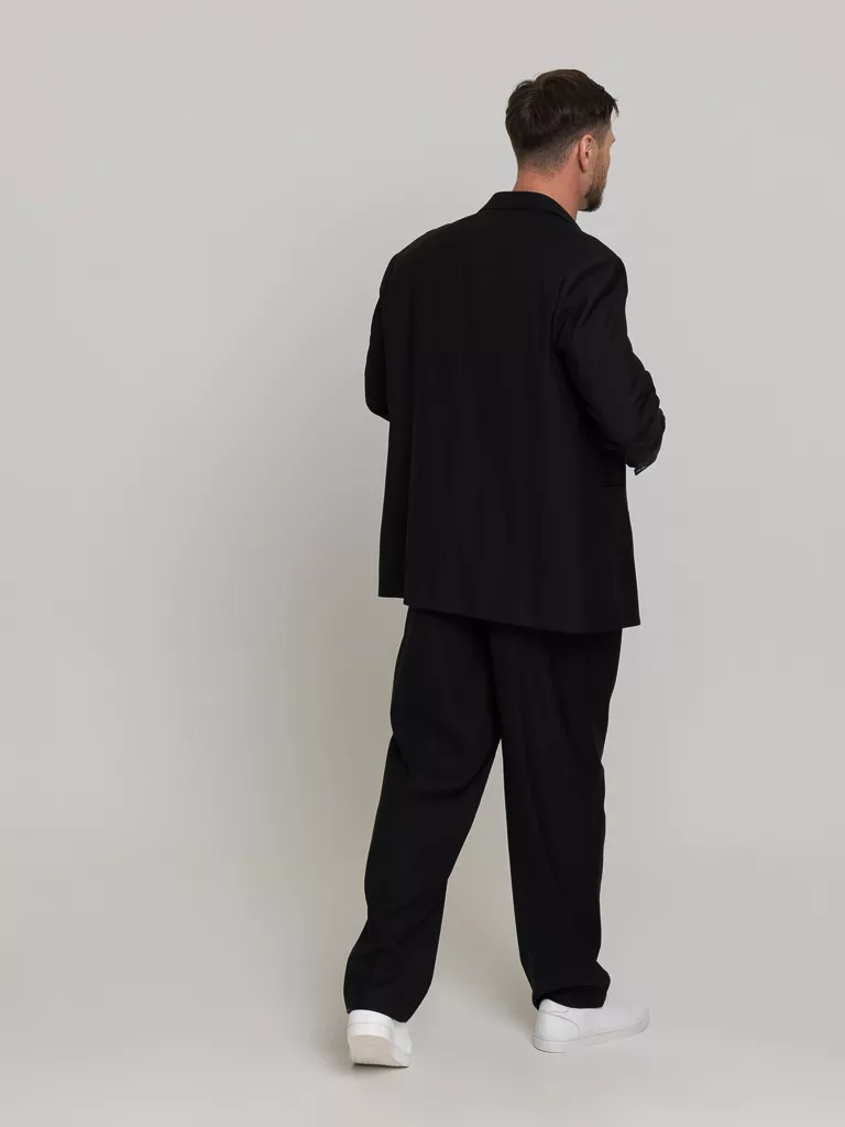 Костюм Casual модель, свободного кроя oversize. Пиджак свободный, воротник широкого кроя, итальянский стиль. Брюки свободного кроя с защипами, ширина низа 22см. Костюм матово-черного цвета без отблеска. Ткань тактильно очень приятная. Идеальный вариант торжественных выходов.
