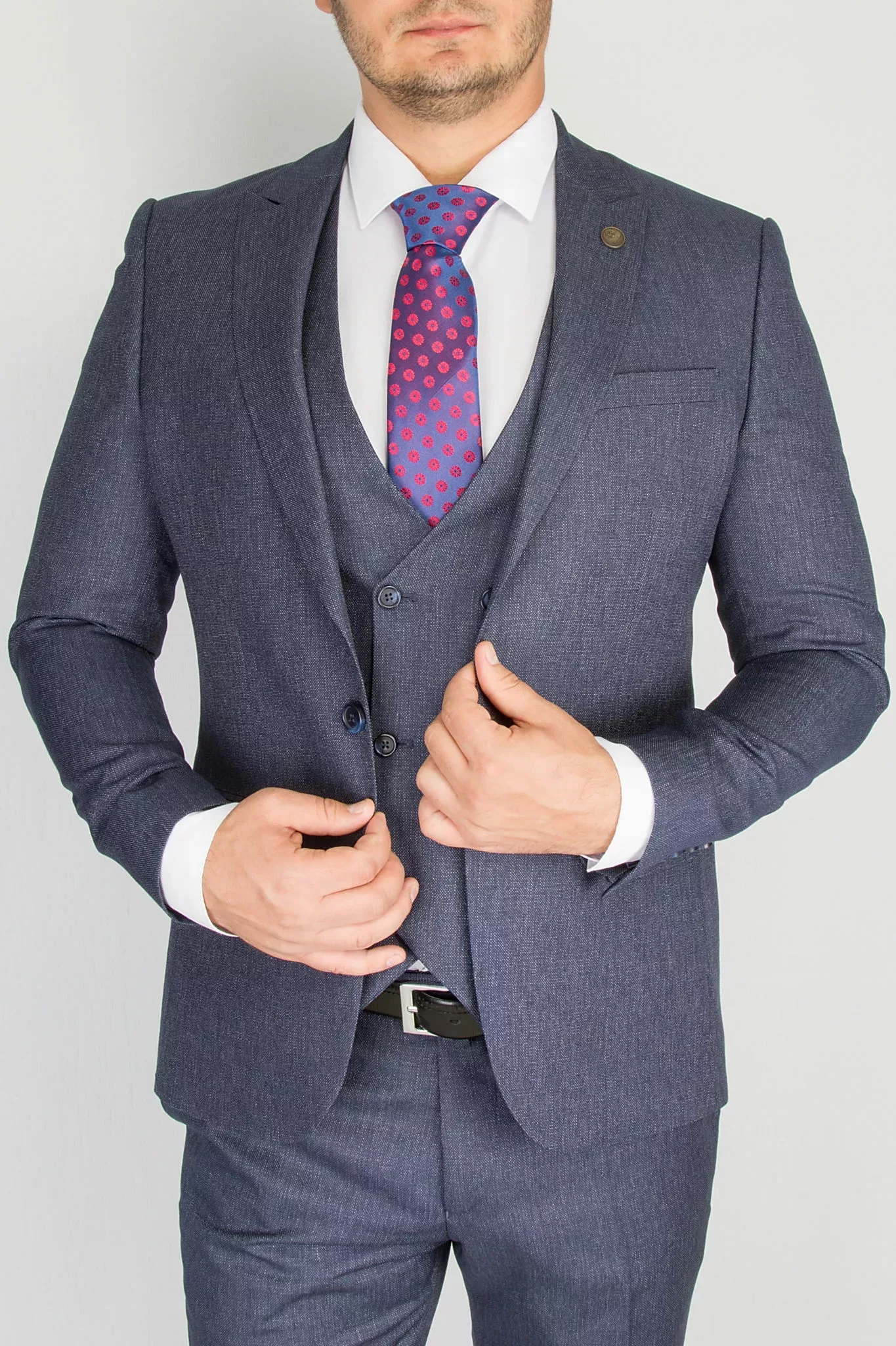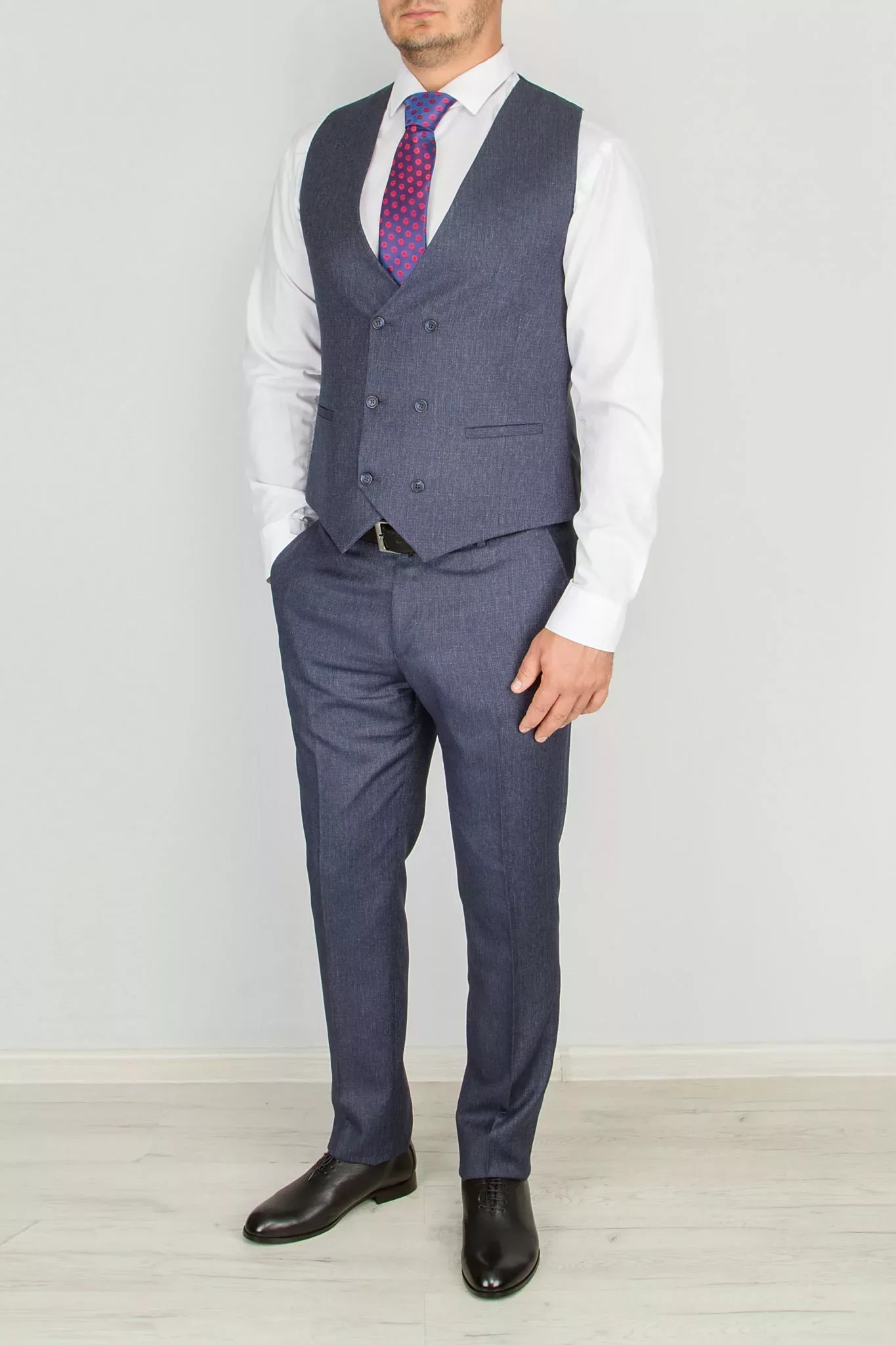 Костюм современного приталенного кроя, отшит в модели super-slim. Пиджак имеет застежку на одну пуговицу, узкий лацкан воротника, значек в петлице. Жилет двубортный с регулятором обьема.  Брюки имеют узкий крой и свободную длину. По вашей просьбе мы  подгоним длину брюк под вашу ростовку, заузим по ширине. Костюм отшит из смесовой ткани высокого качества в составе 62% шерсти и 35% вискозы и эластан 3%, что позволяет долго сохранять презентабельный внешний вид и форму, ткань устойчива к заминанию.