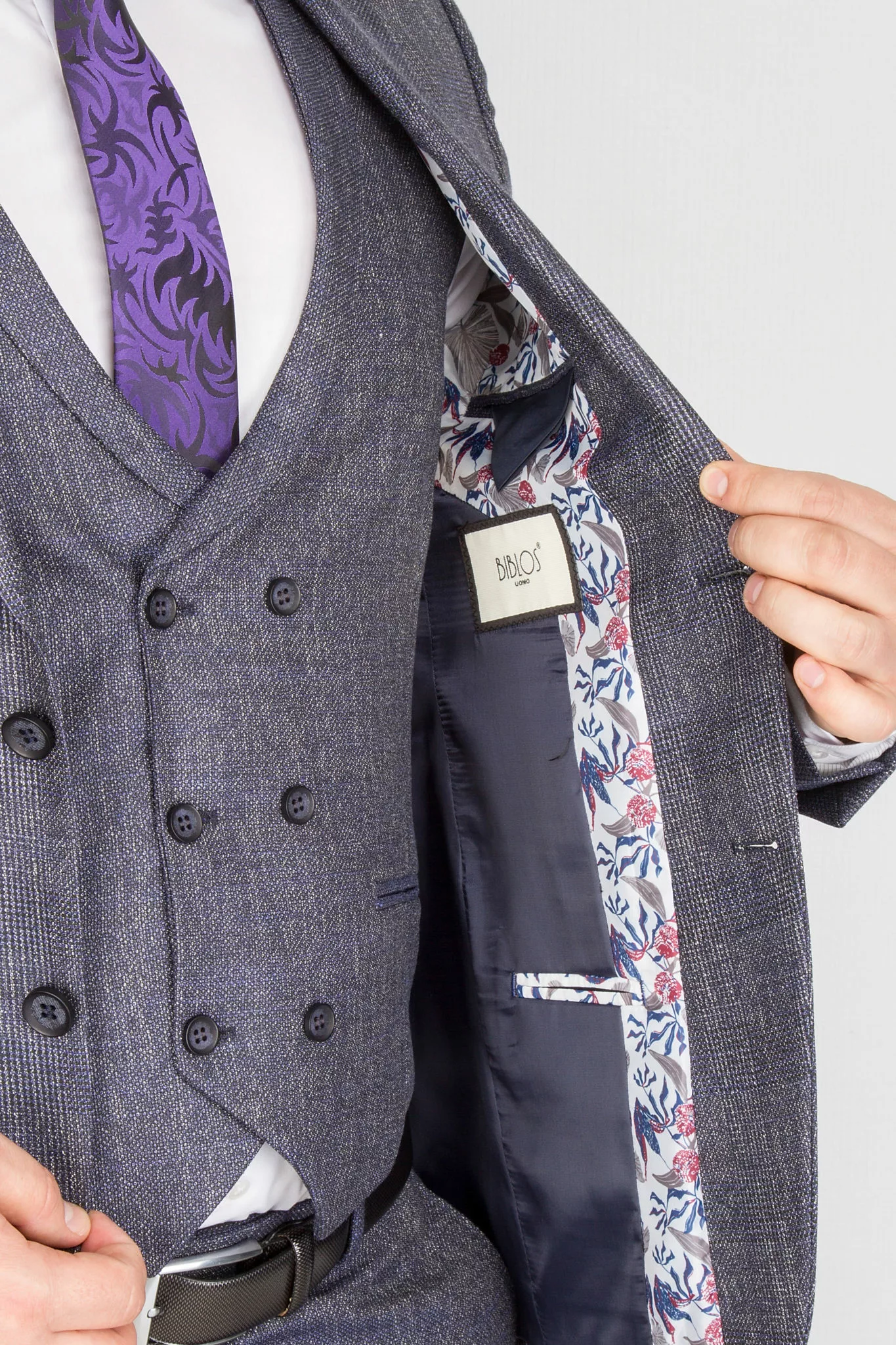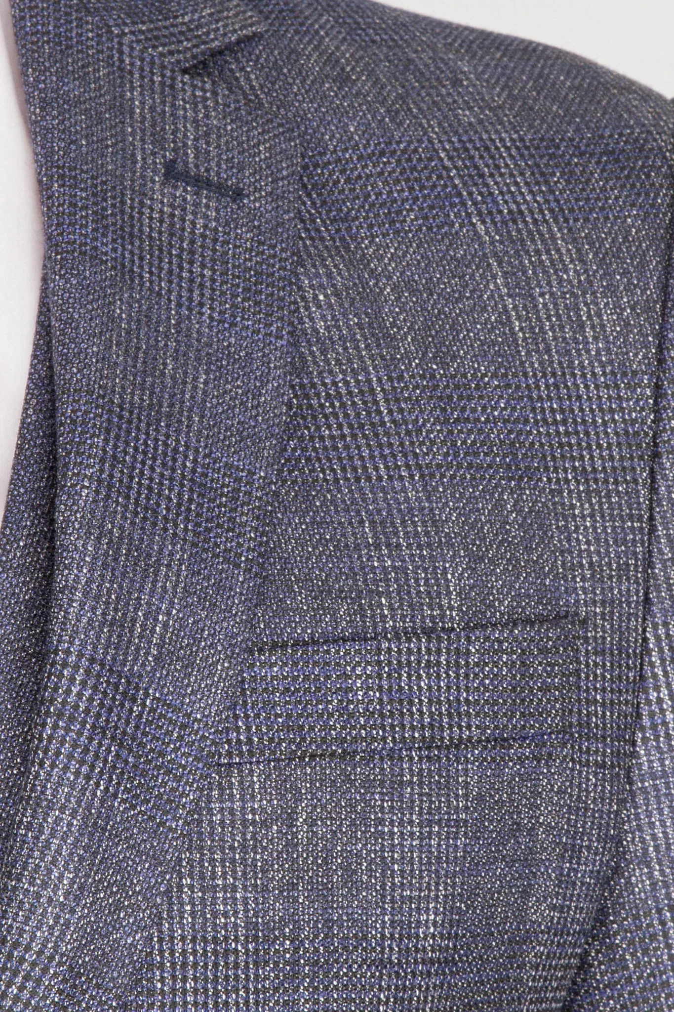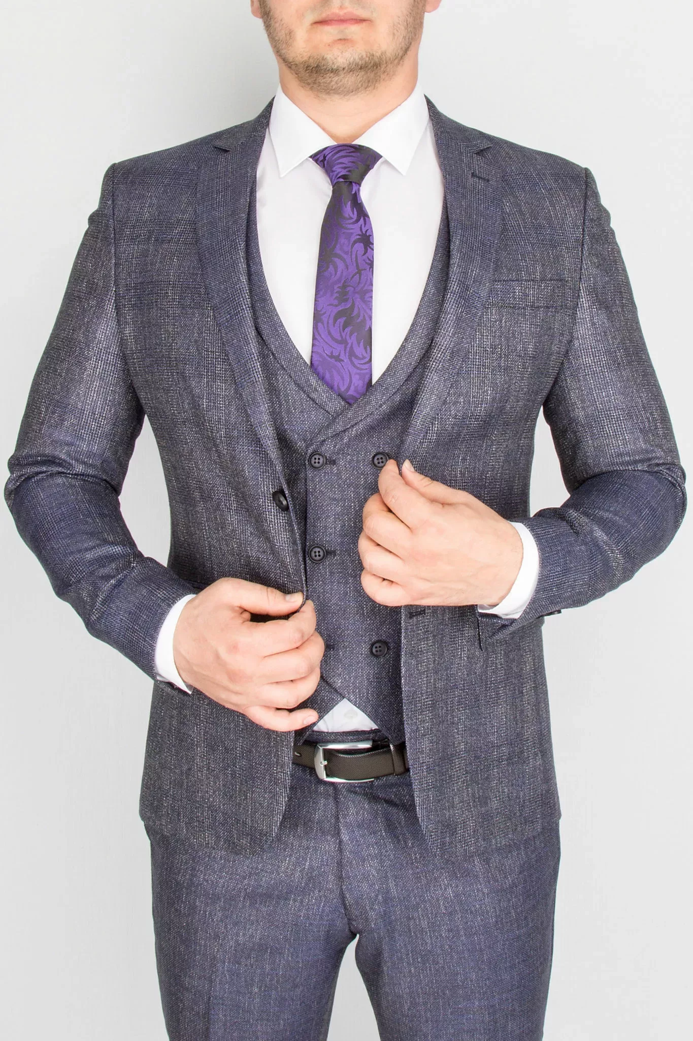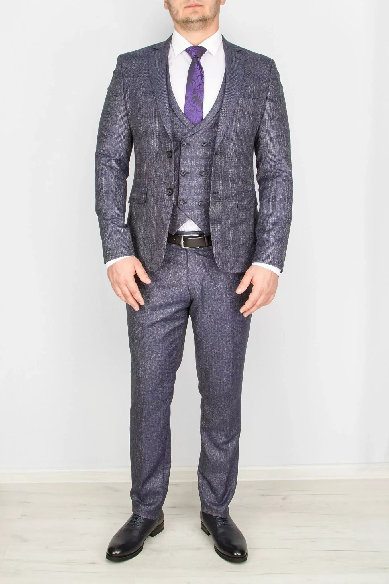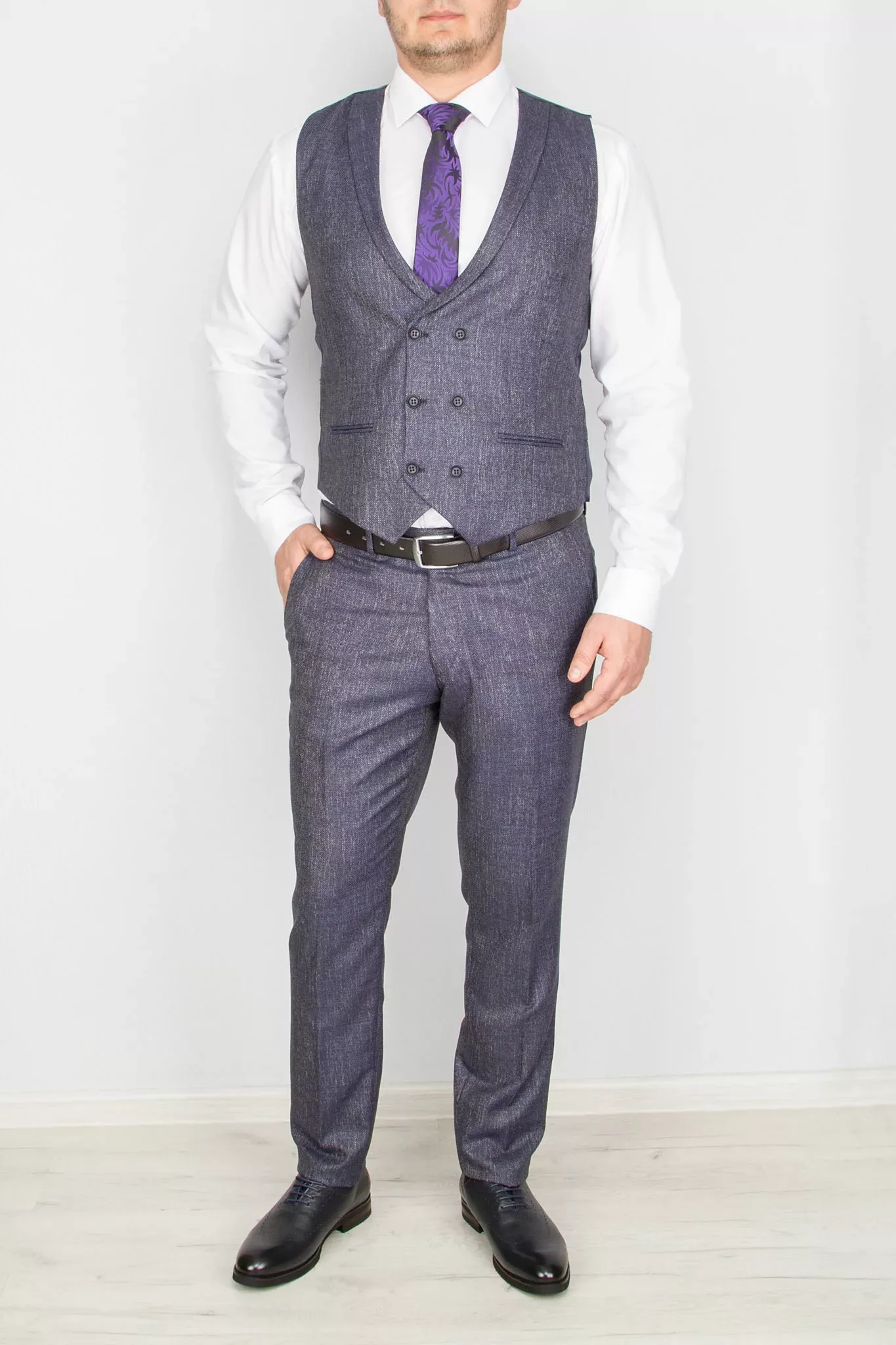 Костюм-тройка отшит в приталенной модели super-slim. Пиджак имеет застежку на две пуговицы, узкий лацкан воротника, нагрудный карман с листочкой,  сзади две боковые шлицы. Жилет двубортный с отложным воротником.  Брюки приужены, свободной длины. По вашей просьбе мы  подгоним длину брюк под вашу ростовку. Ткань оригинального сине-серого оттенка дополнена сложной двухцветной клеткой, которая идеально подчеркивает  основной тон изделия. Костюм будет актуальным для деловой встречи, работы в офисе, обучении.