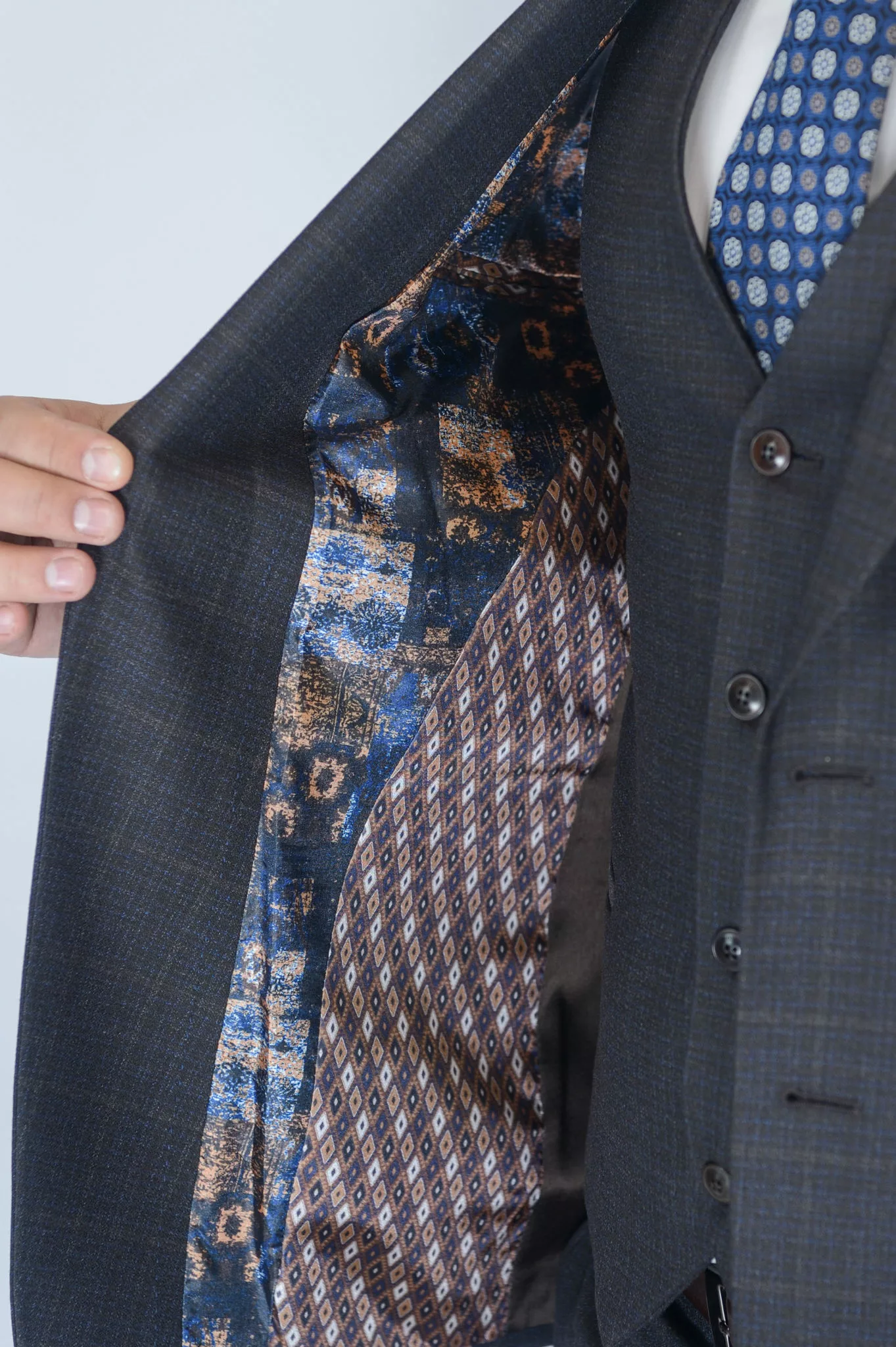 Костюм имеет замечательную посадку, отлично садится практически на любой тип фигуры. Лицевая ткань, насыщенно коричневого цвета в неброскую клетку. Выглядит свежо и оригинально. Жилет костюма по спине также тканевый, что позволяет использовать его отдельно только с брюками.