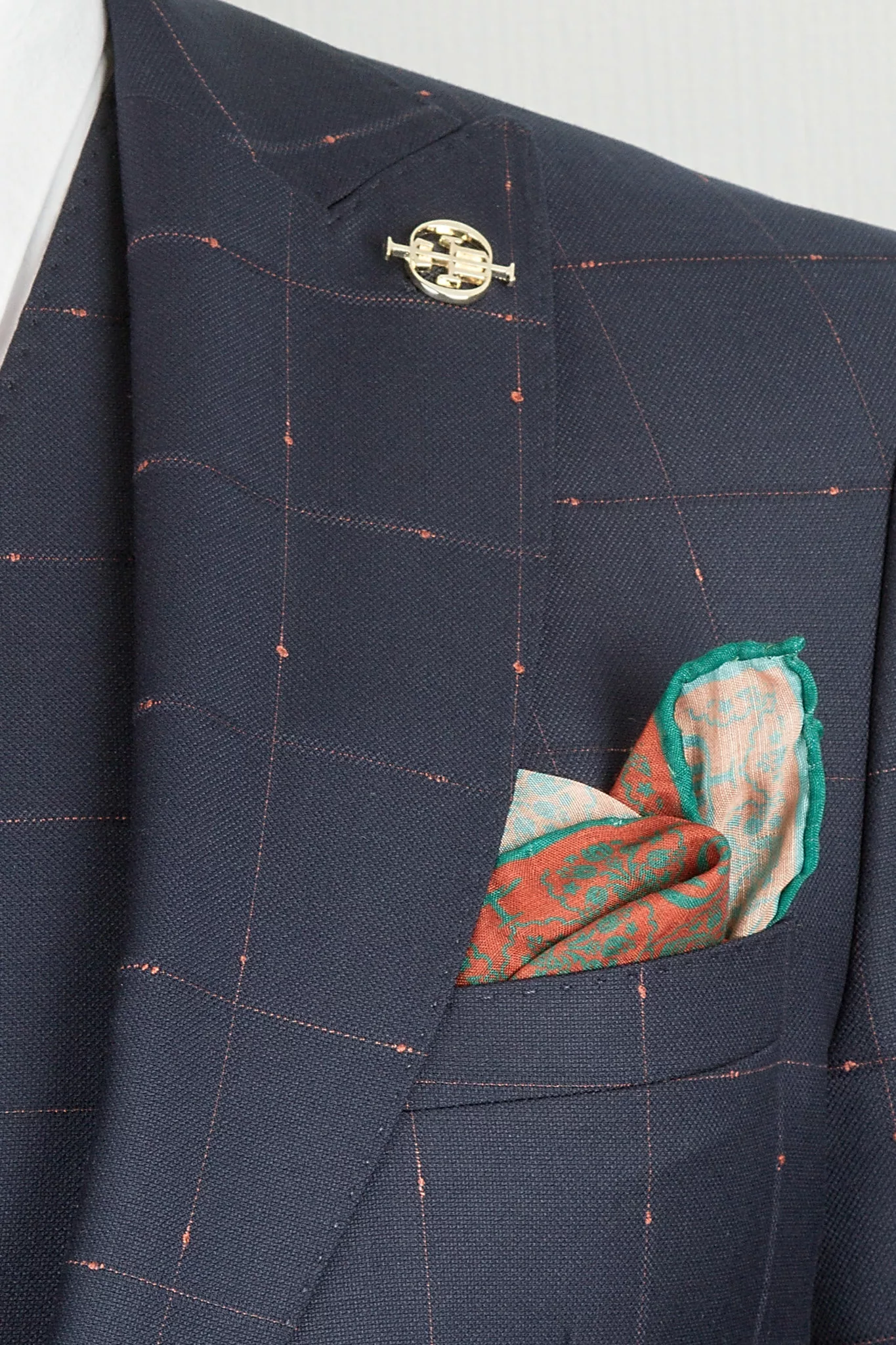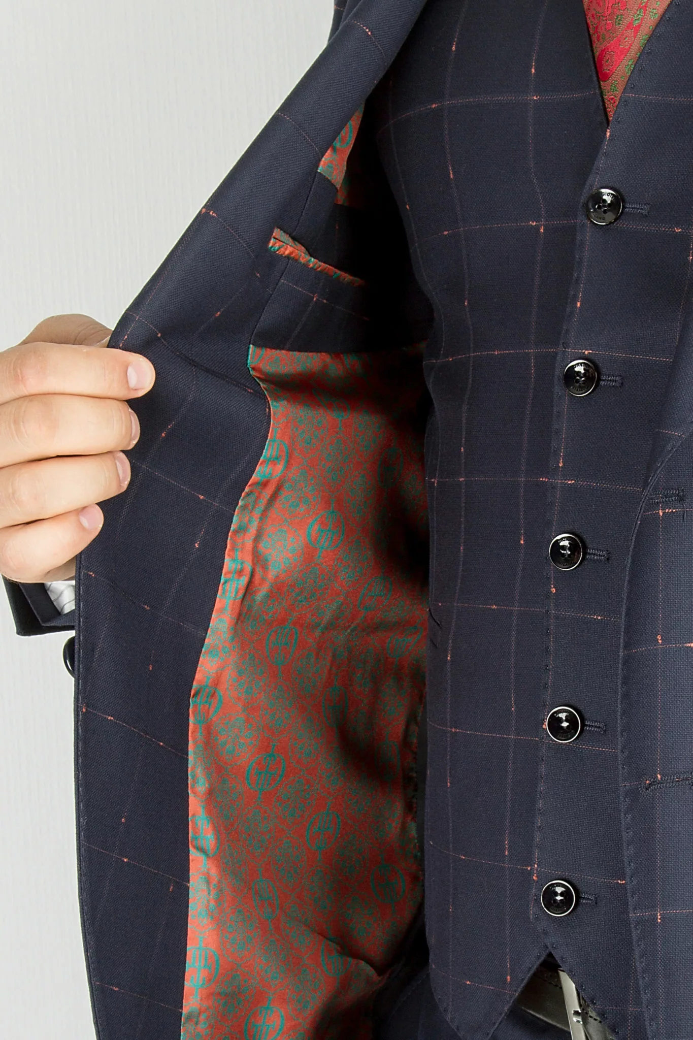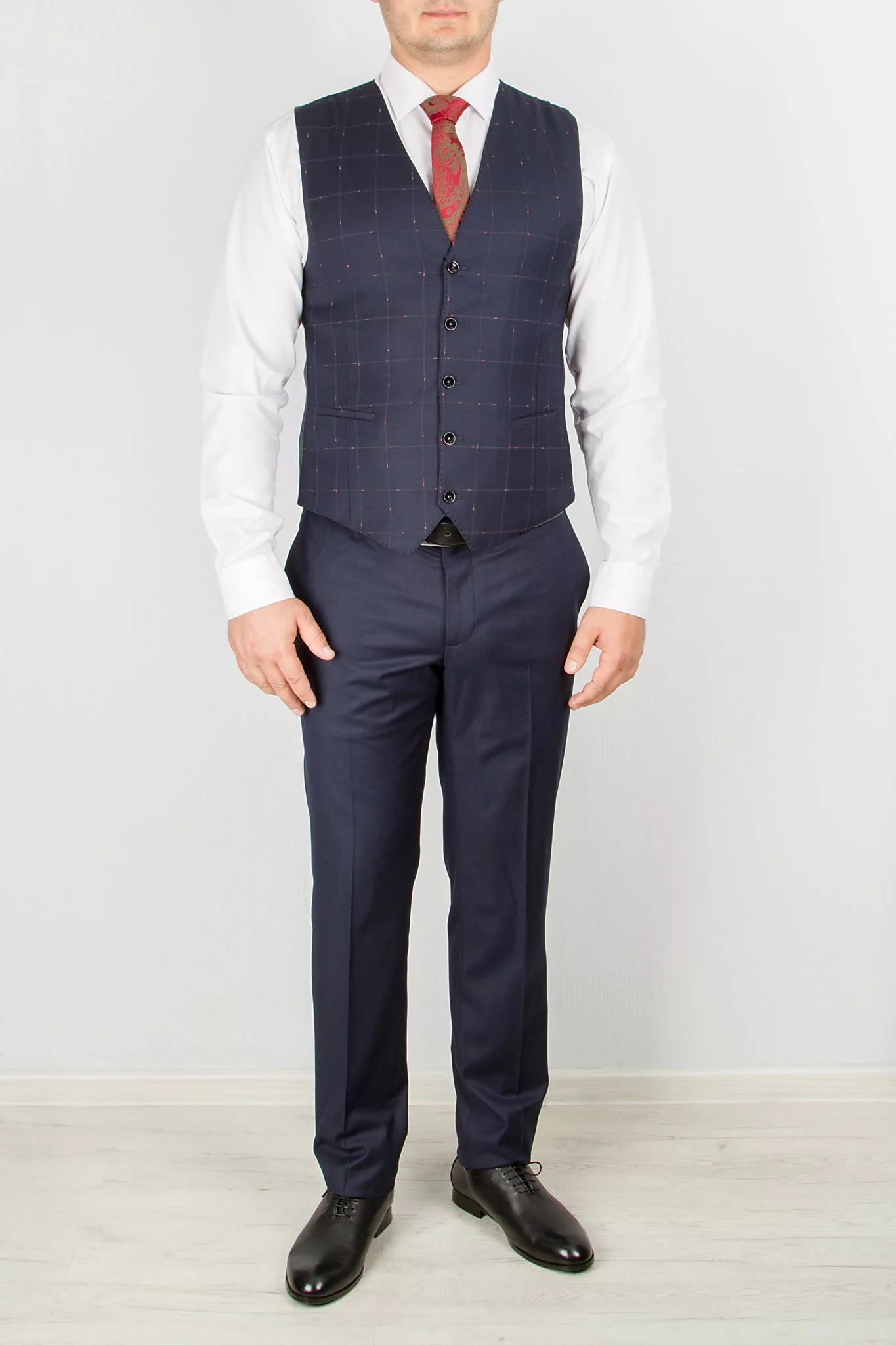 Костюм отшит в модели «компаньон»,- однотонные жилет и брюки скомпанованы с клеточным пиджаком.