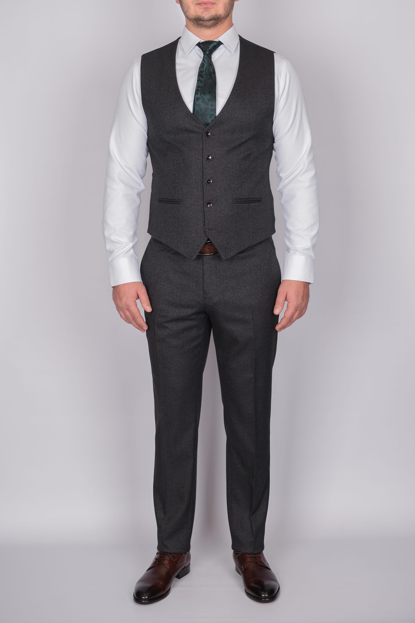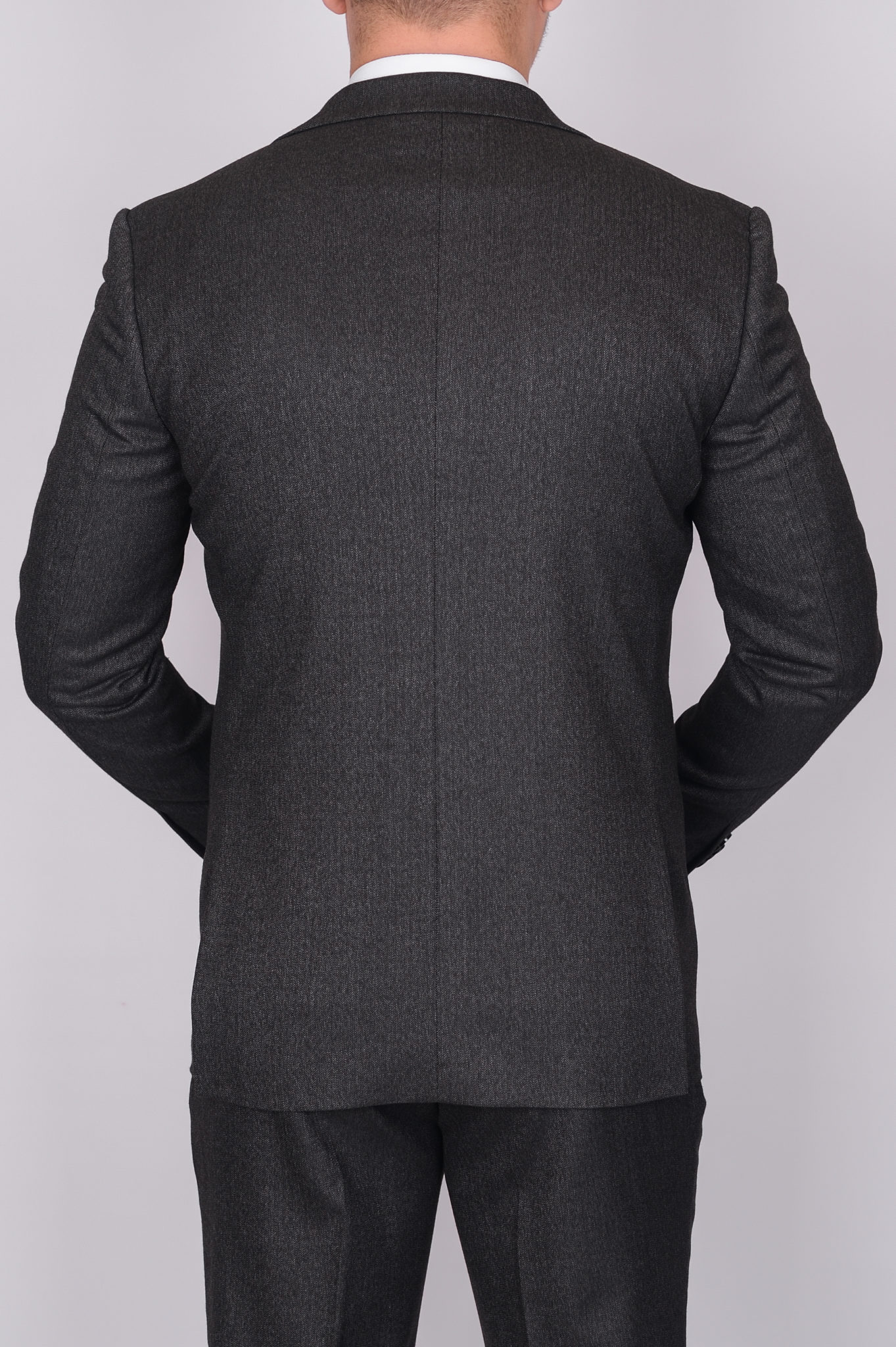 Костюм имеет замечательную посадку, отлично садится практически на любой тип фигуры. Данная модель отшита в классическом темно-сером  цвете, отлично подойдет для офиса и повседневной носки.  Жилет костюма по спине также тканевый, что позволяет использовать его отдельно только с брюками.